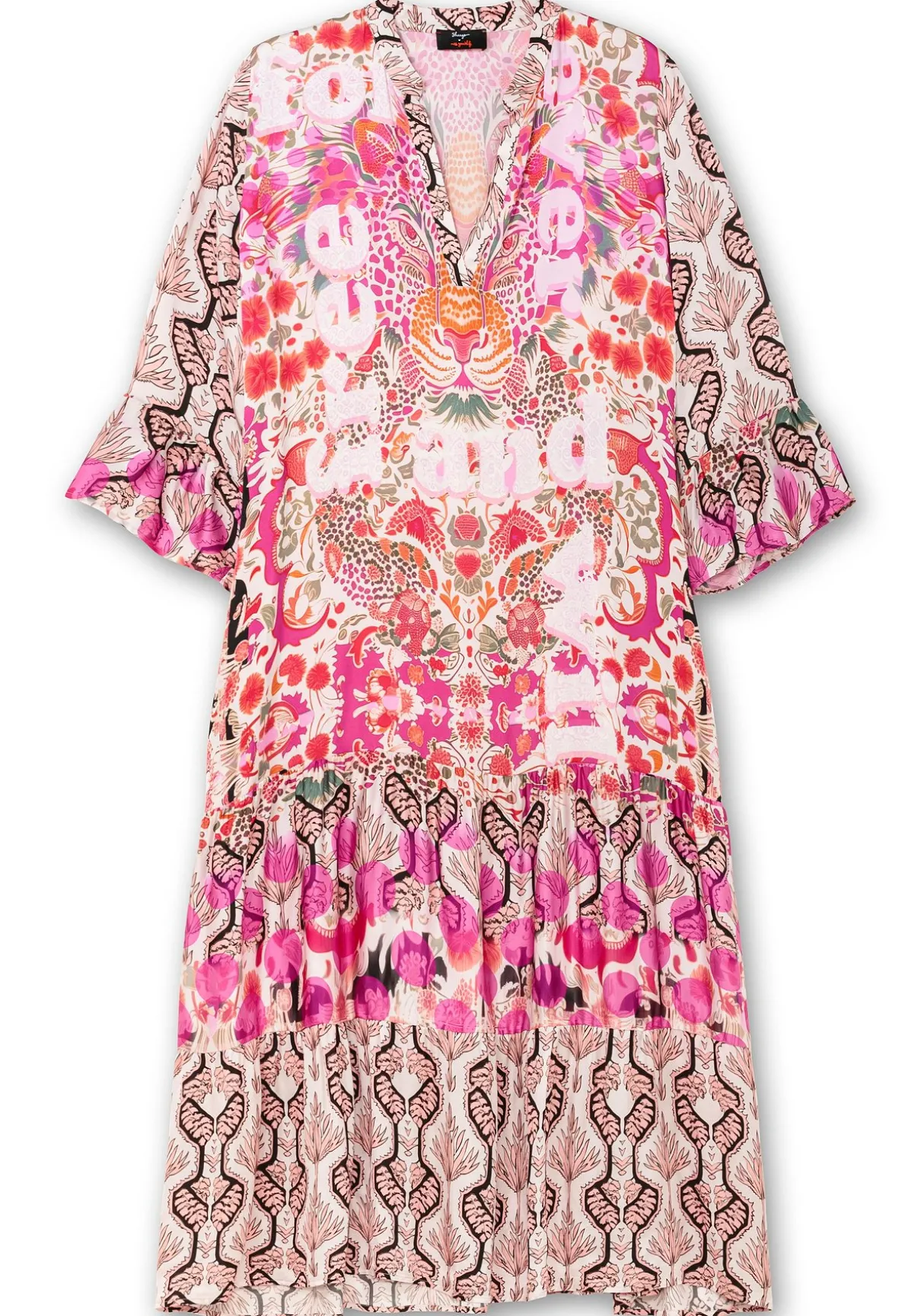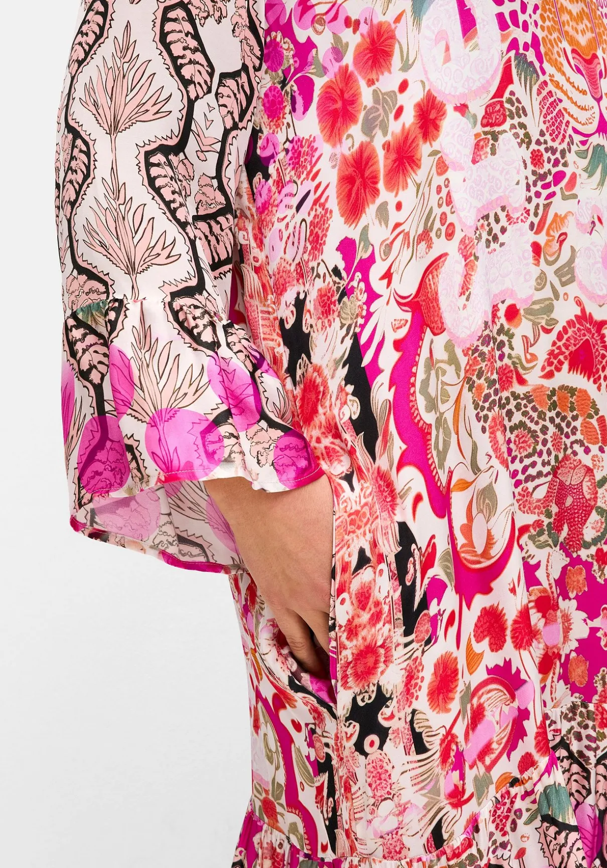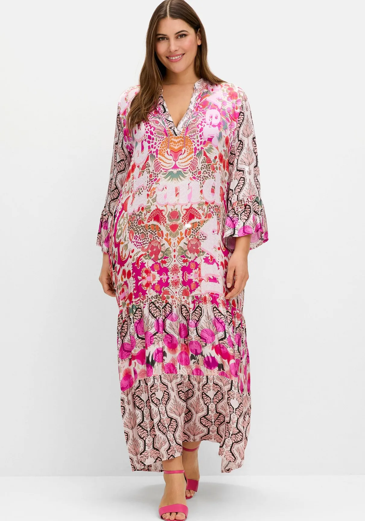 Stufenkleid im raffinierten Mustermix von sheego loves miss goodlife. Der kleine Stehkragen am V-Ausschnitt setzt einen stilvollen Akzent, die langen Ärmel enden in romantischen Volants. Verschieden gemusterte Rockstufen und die Maxilänge schaffen eine fließende Eleganz, die praktischen Seitentaschen bieten zusätzlichen Komfort.