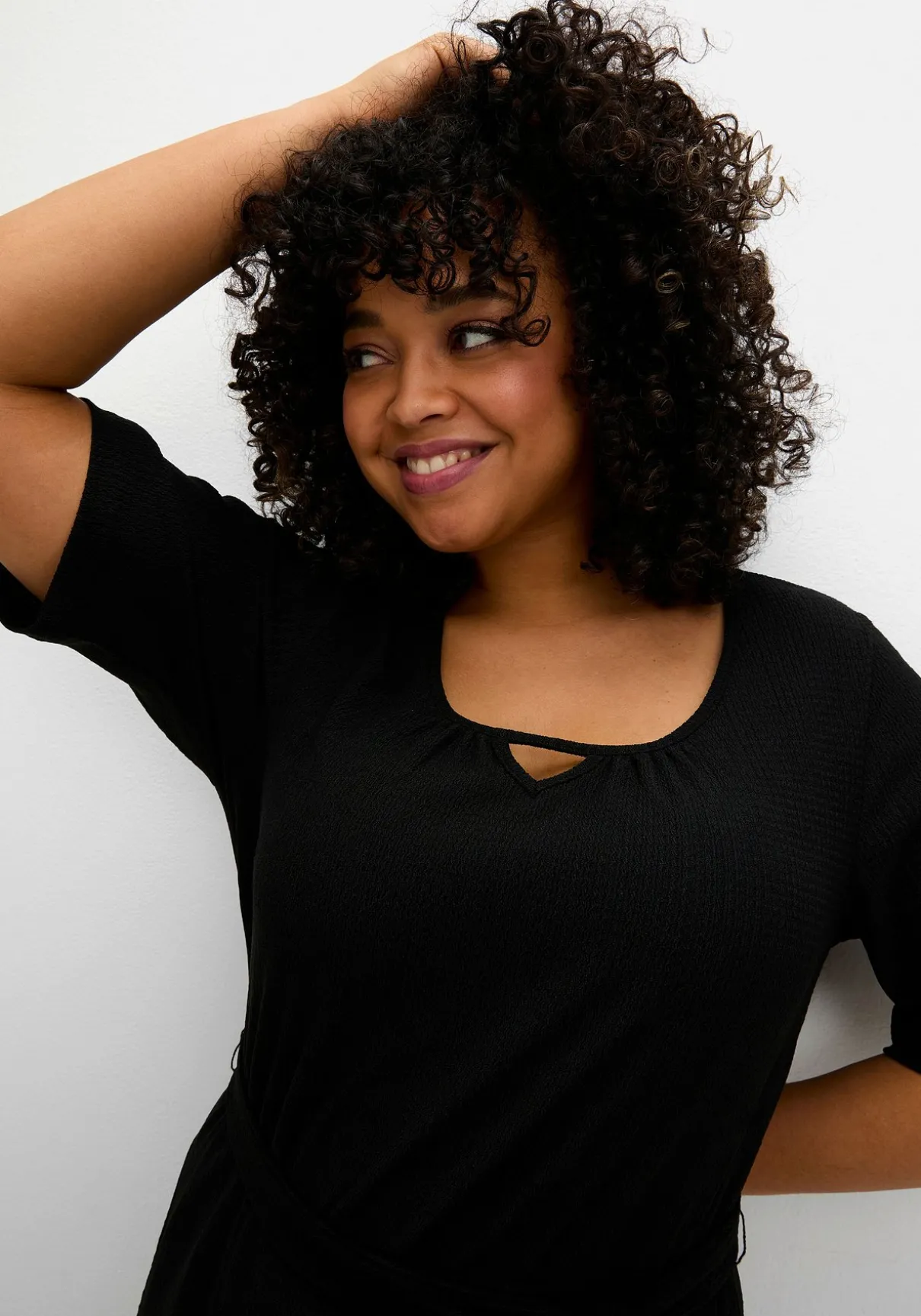 Kleid mit Halbarmen, in knieumspielender Länge. Durch die Crêpe-Qualität erhält die Oberfläche eine spannende Struktur, gleichzeitig wird so geschickt die Silhouette gestreckt. Der Rundhalsausschnitt ist mit einem kleinen Cut-out versehen, besonders praktisch präsentieren sich die seitlichen Taschen. Wer mag, betont die Taille mit dem Bindegürtel.