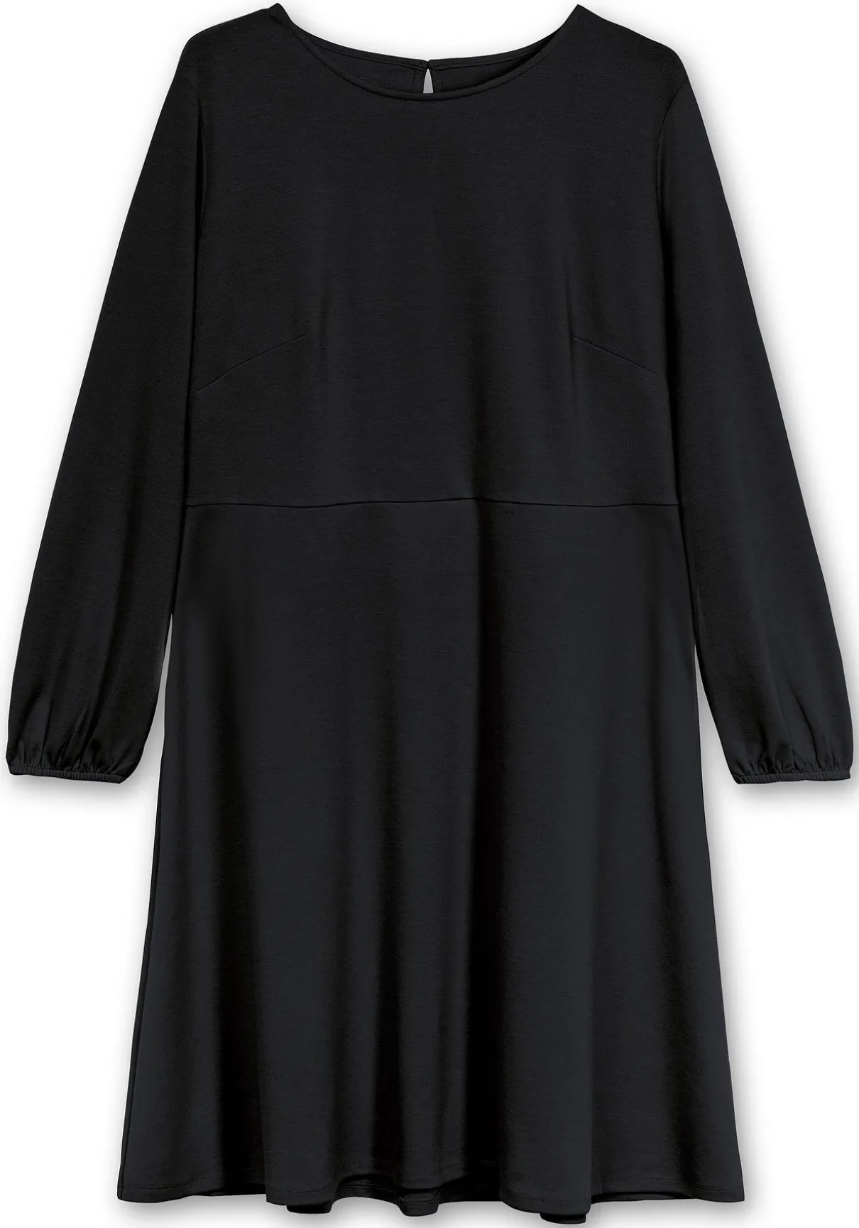 Kleid in A-Linie. Das feminine Kleid ist mit einem Rundhalsausschnitt gearbeitet, im Nacken überraschen Schlitz und Knopfverschluss. Die raffinierte Taillennaht betont geschickt die Körpermitte, darunter schließt sich der ausgestellte Rock an.