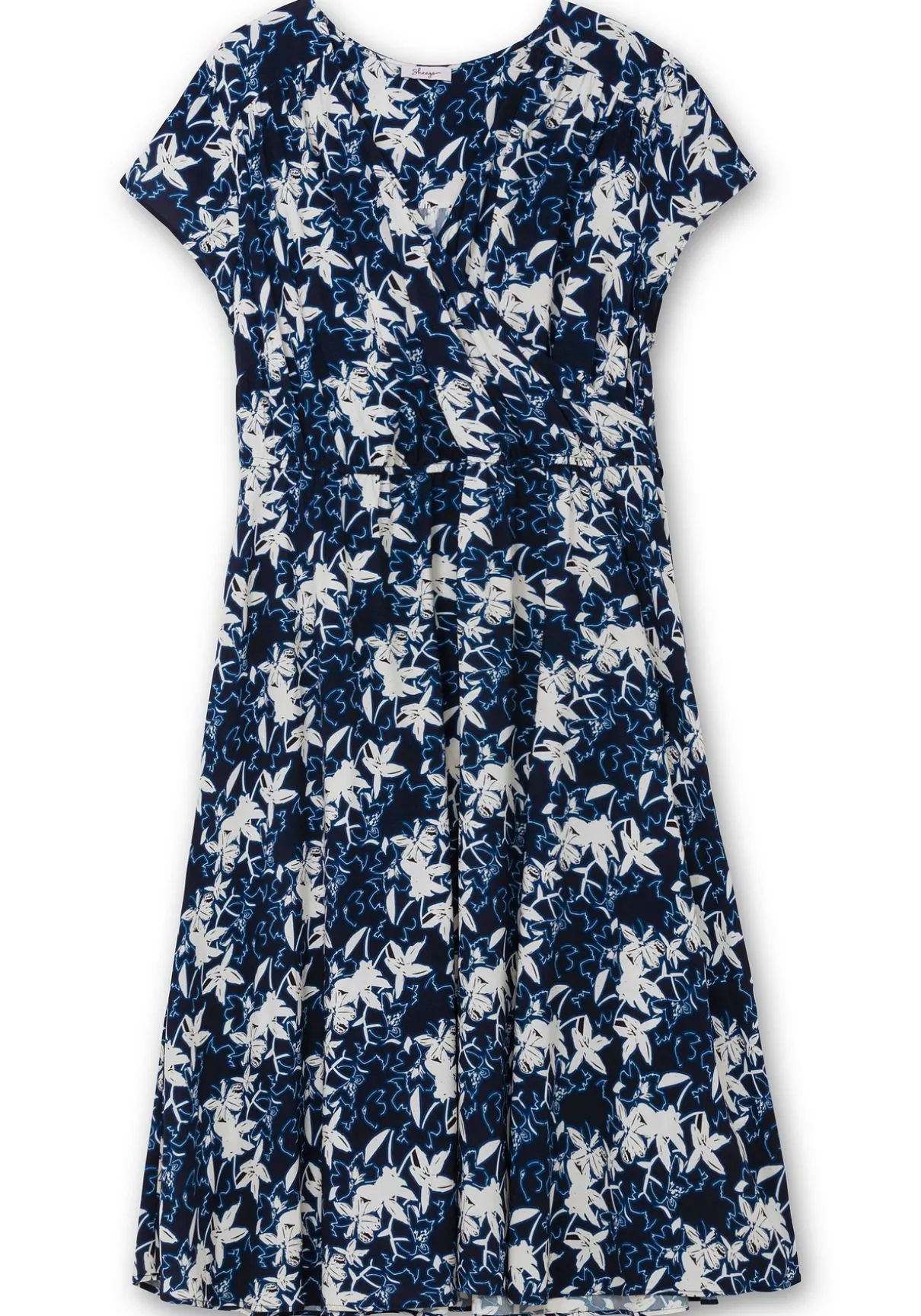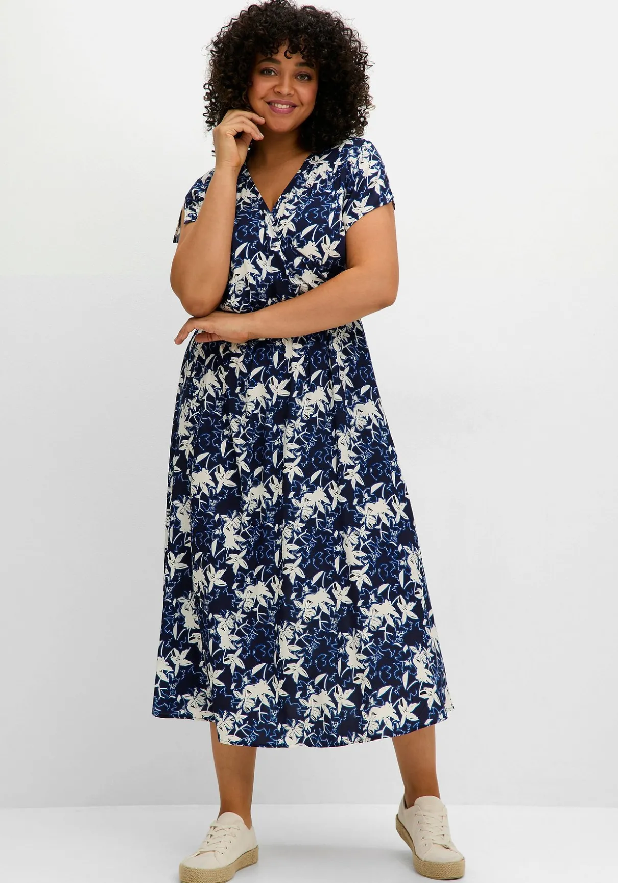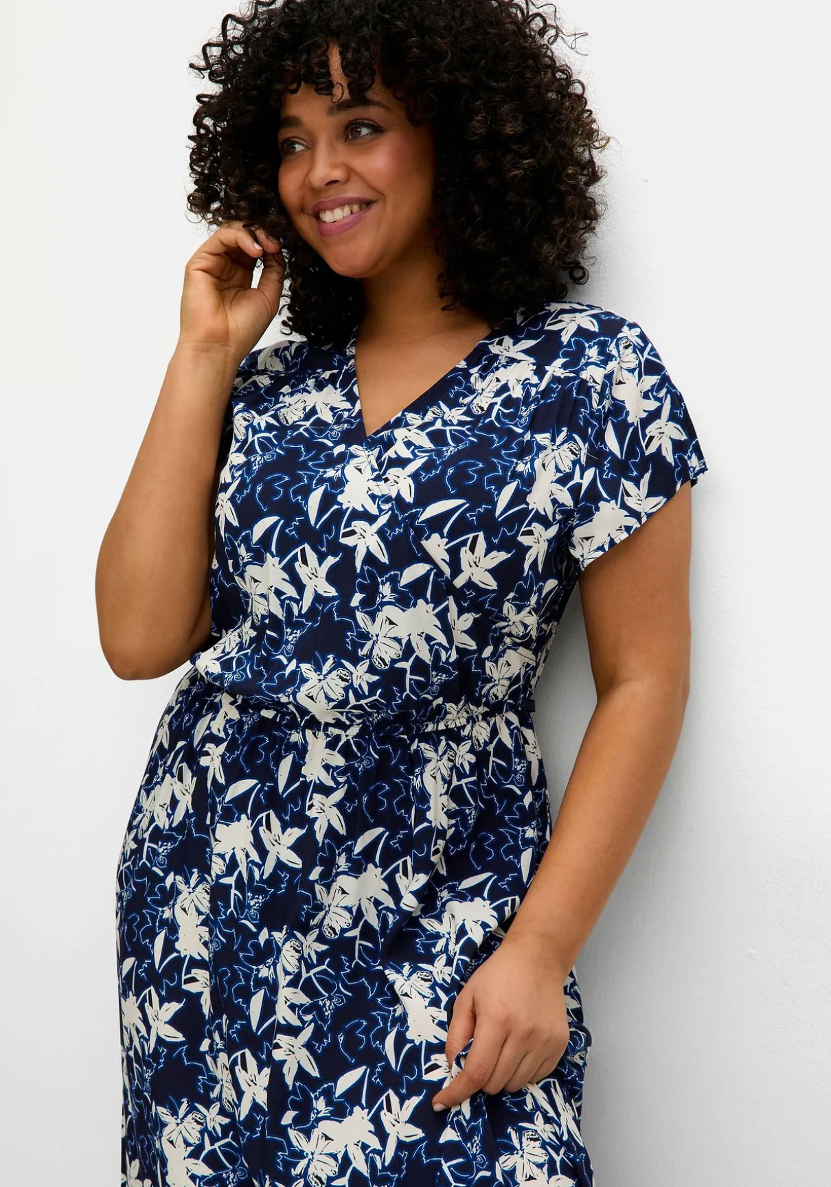 Kleid mit Alloverprint. Der kontrastierende Blumenprint und die angedeutete Wickeloptik wirken modern. Ein Gummizug mit Bindeband formt die Taille, während der weit schwingende Rock in wadenbedeckender Länge Eleganz verleiht. Feminine Details wie Falten an der Schulternaht und der Passe hinten unterstreichen das stilvolle Design.