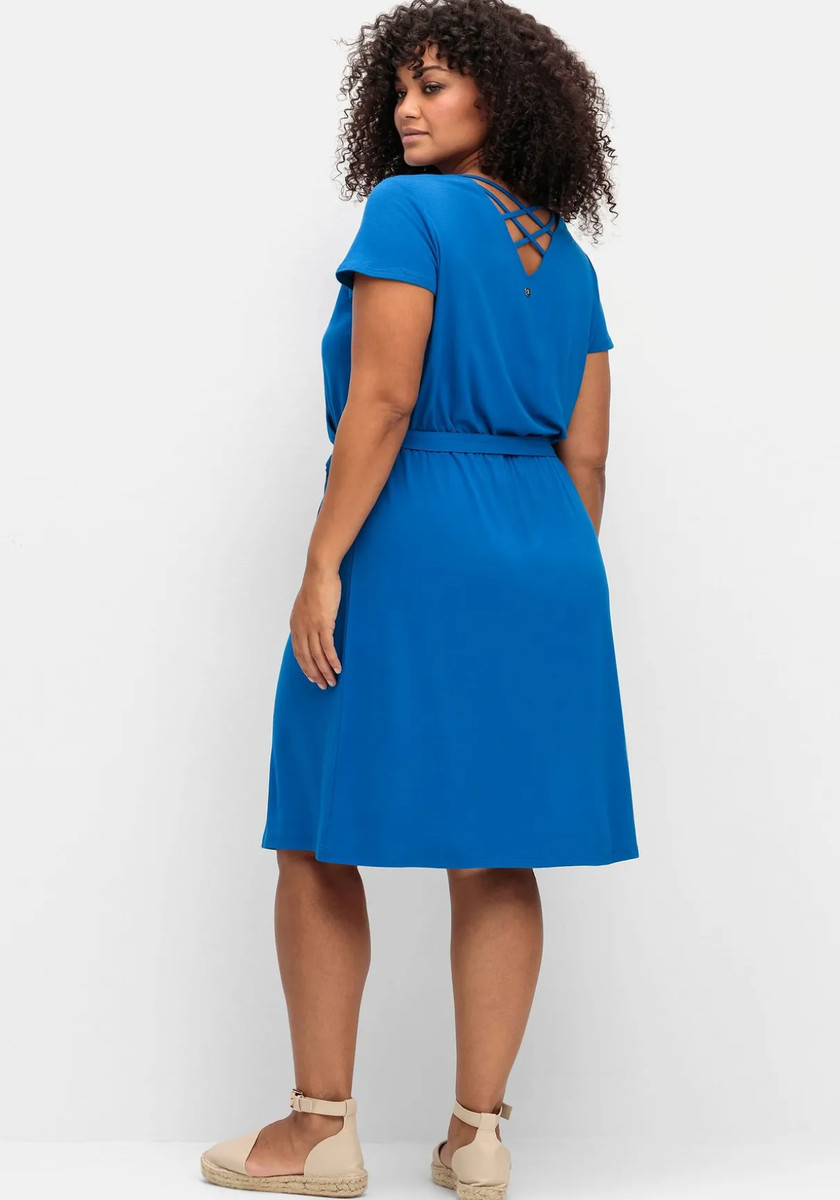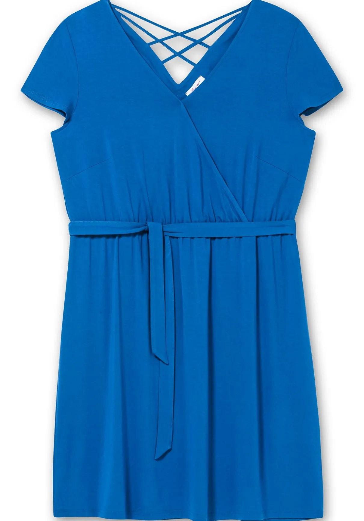 Kleid in Wickeloptik. Der V-Ausschnitt in Wickeloptik wird im Nacken durch gekreuzte Bänder raffiniert ergänzt. Das Bindeband setzt die Taille feminin in den Fokus, der locker schwingende Rockteil verleiht dem Look Leichtigkeit.