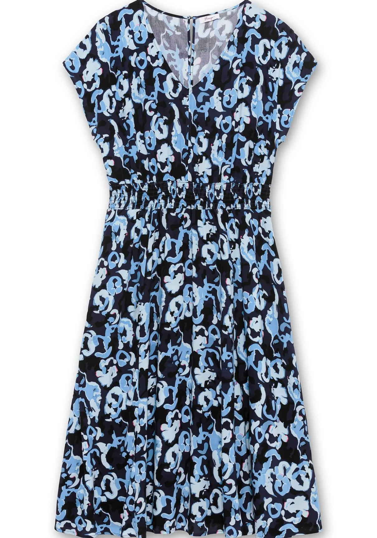 Kleid mit floralem Alloverdruck. Das Kleid ist mit einem femininen V-Ausschnitt gearbeitet, hinten sorgt ein Schlitz mit Knopf für einen einfacheren Einstieg. Die Taille wird durch den gesmokten und dadurch sehr bequemen Gummizugbund geschickt betont. Daran schließt sich ein ausgestelltes, weit schwingendes Rockteil in Midilänge an. Seitliche Saumschlitze geben zusätzliche Beinfreiheit.
