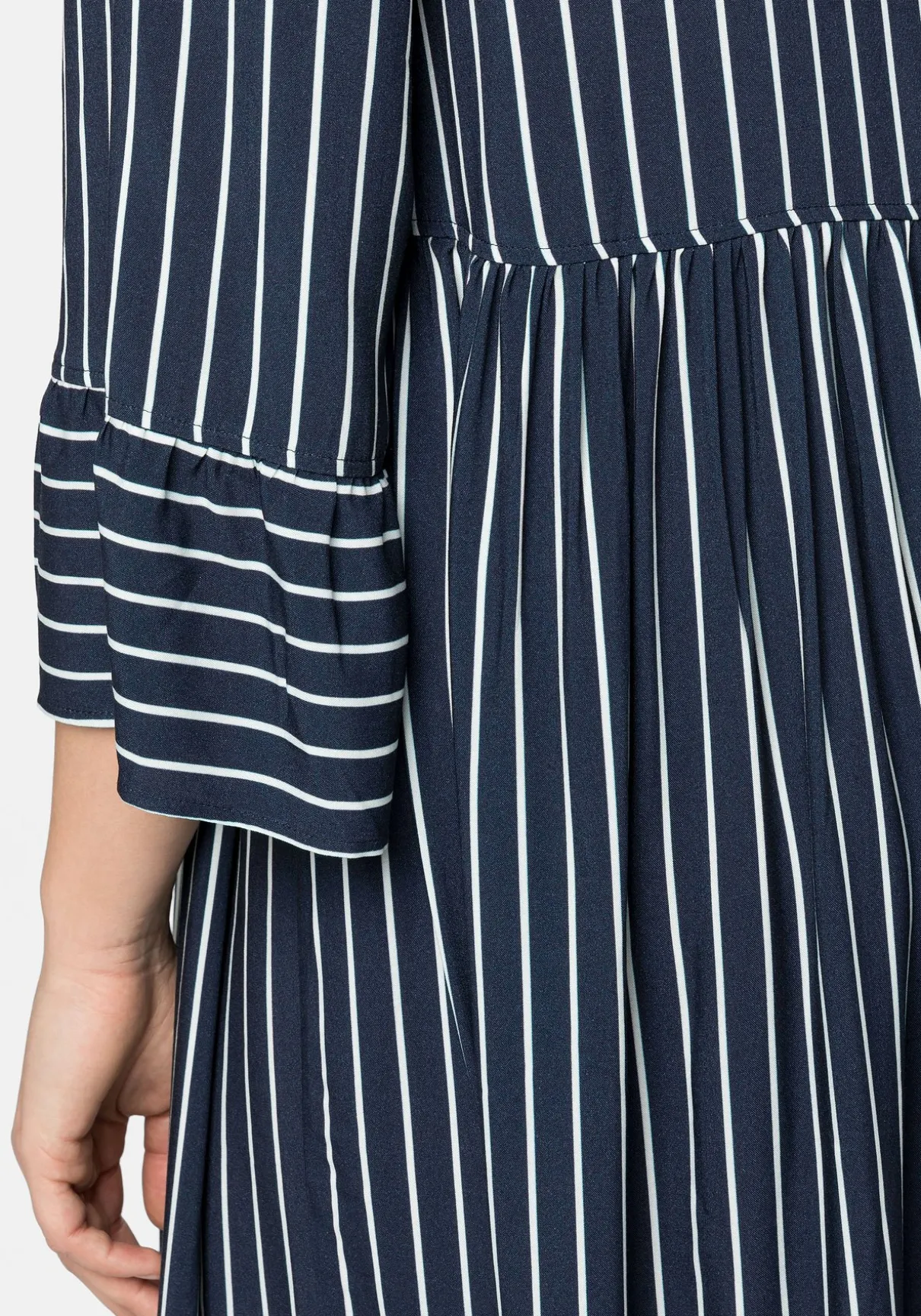 Streifenkleid mit weit geschnittenen 3/4-Ärmeln. Die feinen, unterschiedlich verlaufenden Kontraststreifen zaubern einen spannungsvollen Look und sorgen für Dynamik. Die leicht erhöhte, angekräuselte Taillennaht lässt das anschließende Rockteil feminin schwingen. Auch die manschettenähnlichen Abschlüsse sind leicht gekräuselt und geben dem Kleid ein markantes Finish. Ein V-Ausschnitt ergänzt das Design.
