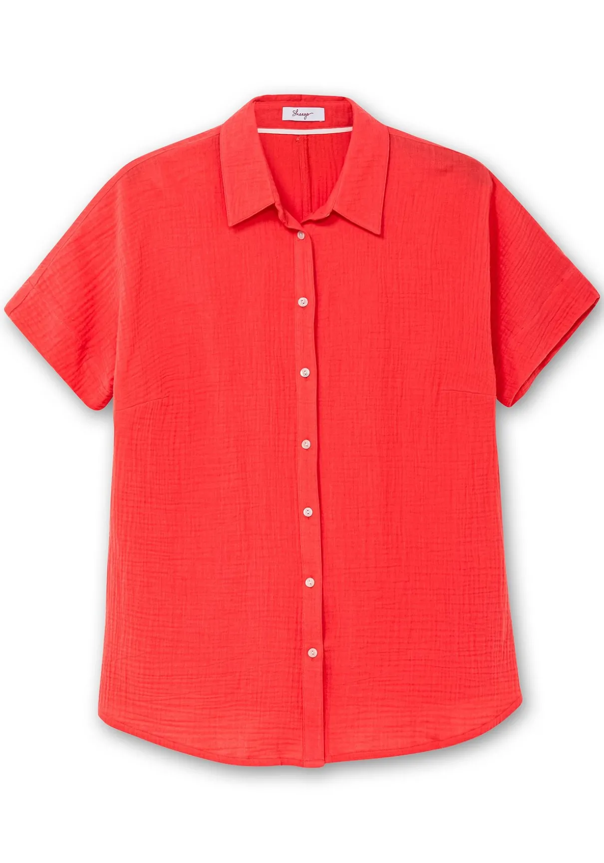 Musselinbluse mit kurzem Arm. Die Bluse zeigt sich klassisch mit durchgehender Knopfleiste und Hemdblusenkragen. Durch die überschnittenen Schulter und den gerundeten Saum fällt sie angenehm locker, ergänzt wird der Look durch seitliche Schlitze sowie eine Teilungsnaht im Rücken.