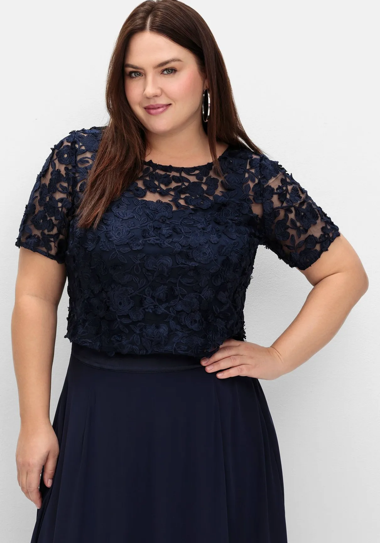 Kurzärmlige Tunika aus floraler, transparenter Spitze. Vorn ist das elegante Oberteil mit einem femininen Rundhalsausschnitt gearbeitet. Hinten fällt es durch den langen V-Schlitz ab Ausschnitt offen über den Rücken. Ein stoffbezogener Knopf mit Loop rundet den modisch-raffinierten Look stilsicher ab. So entsteht ein festlicher Stylingpartner, der sich zu ärmellosen Abendkleidern genauso tragen lässt wie zu einem langen Rock und in der Farbe Offwhite perfekt zu unseren Hochzeits-Kombinationen passt.