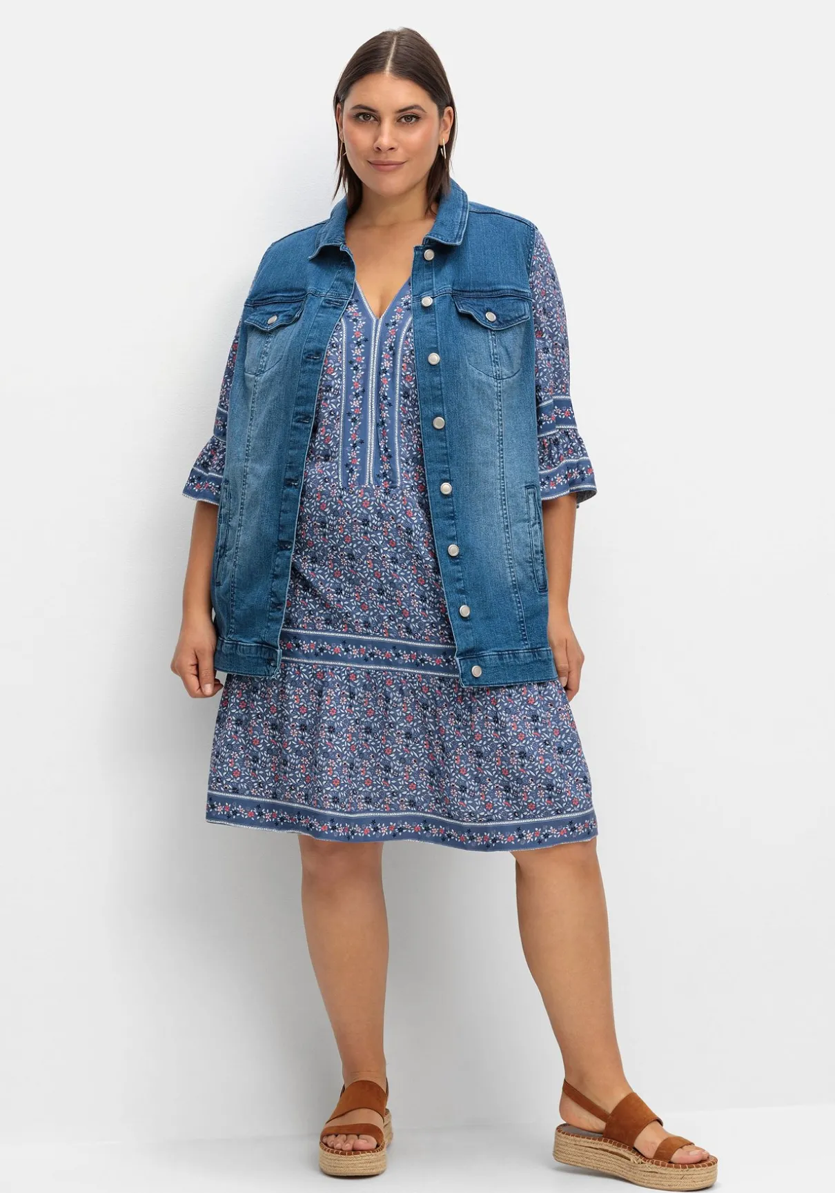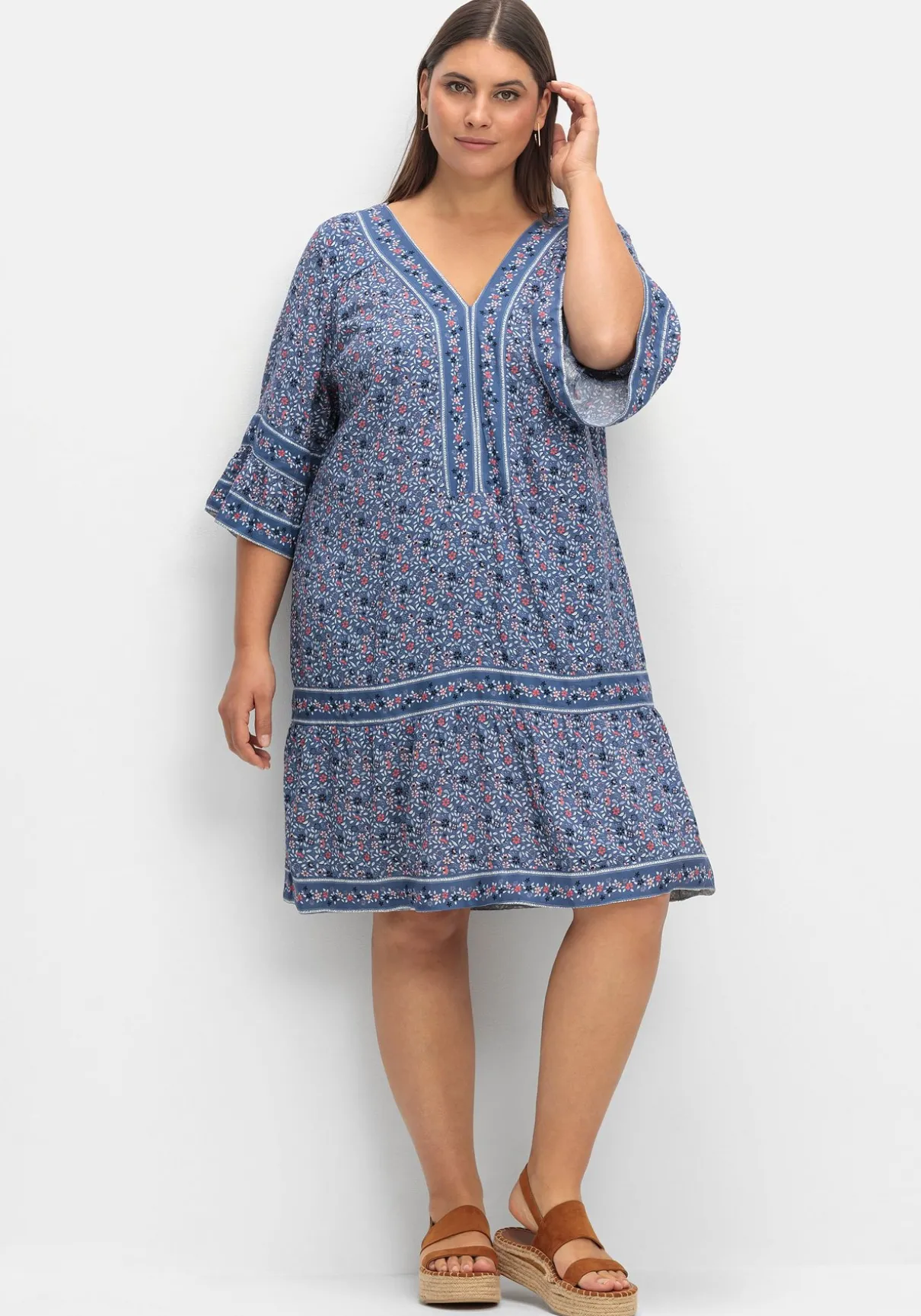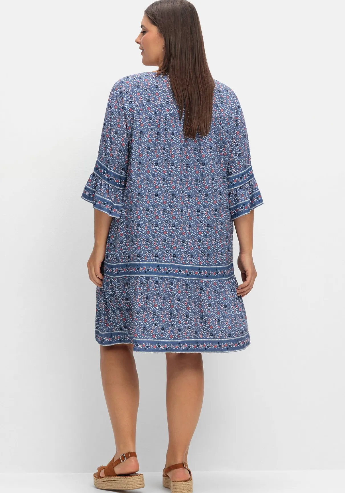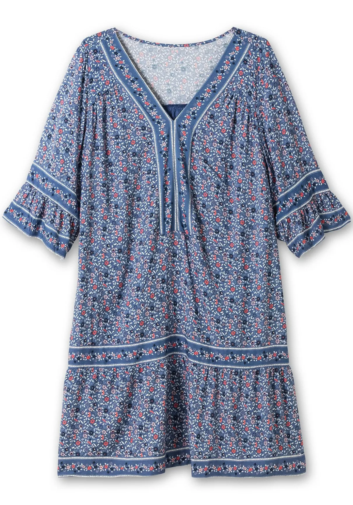 Kleid im Tunikaschnitt. Zum verspielten Blümchenmuster setzt das kontrastfarbene Zierband einen schönen Kontrast. Gleichzeitig werden der V-Ausschnitt und die luftig-weiten Trompetenärmel dekorativ betont. Die Raffung im Rücken sorgt für zusätzliche Weite und einen schmeichelnden Fall.