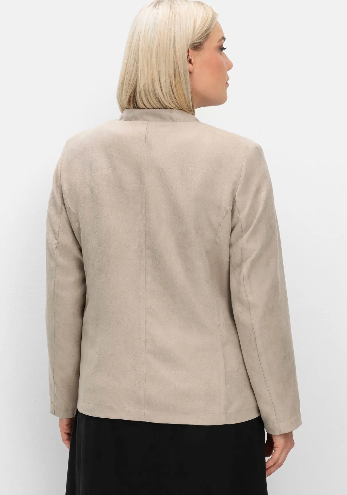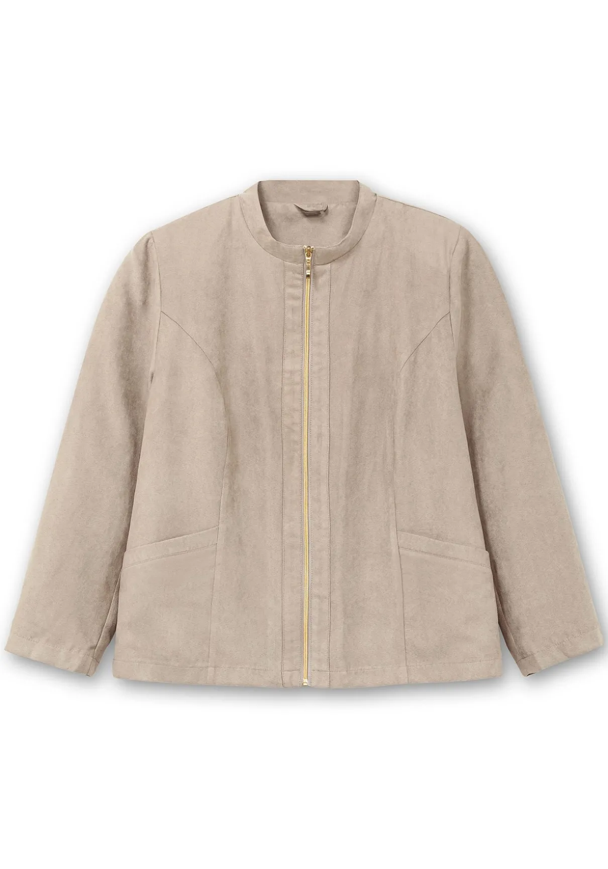 Jacke in Velourslederoptik. Der modisch-elegante Style verfügt über einen kurzen Stehkragen, eine aufgesetzte Blende entlang des Reißverschlusses sowie zwei seitliche Eingrifftaschen. Die eingearbeiteten Schulterpolster verleihen der Silhouette Kontur, formgebende Wiener Nähte sorgen für einen optimalen Sitz.