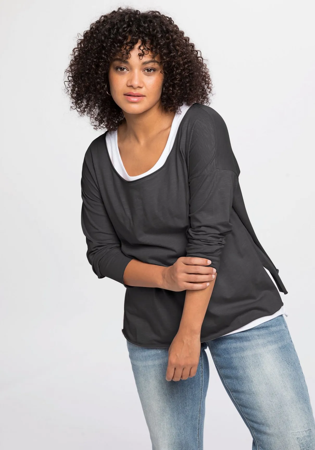 Langarmshirt von sheego by Joe Browns. Die Kombination aus Shirt und kontrastfarbenem Tanktop lässt eine modische Layeringoptik entstehen. Die Rollkante am weit geschnittenen U-Boot-Ausschnitt sowie die überschnittenen Schultern unterstreichen den sportiven Look. Seitliche Schlitze und offene Nähte an den Abschlüssen sind dazu eine perfekte Ergänzung.