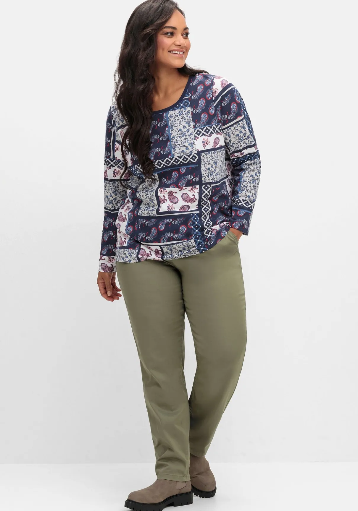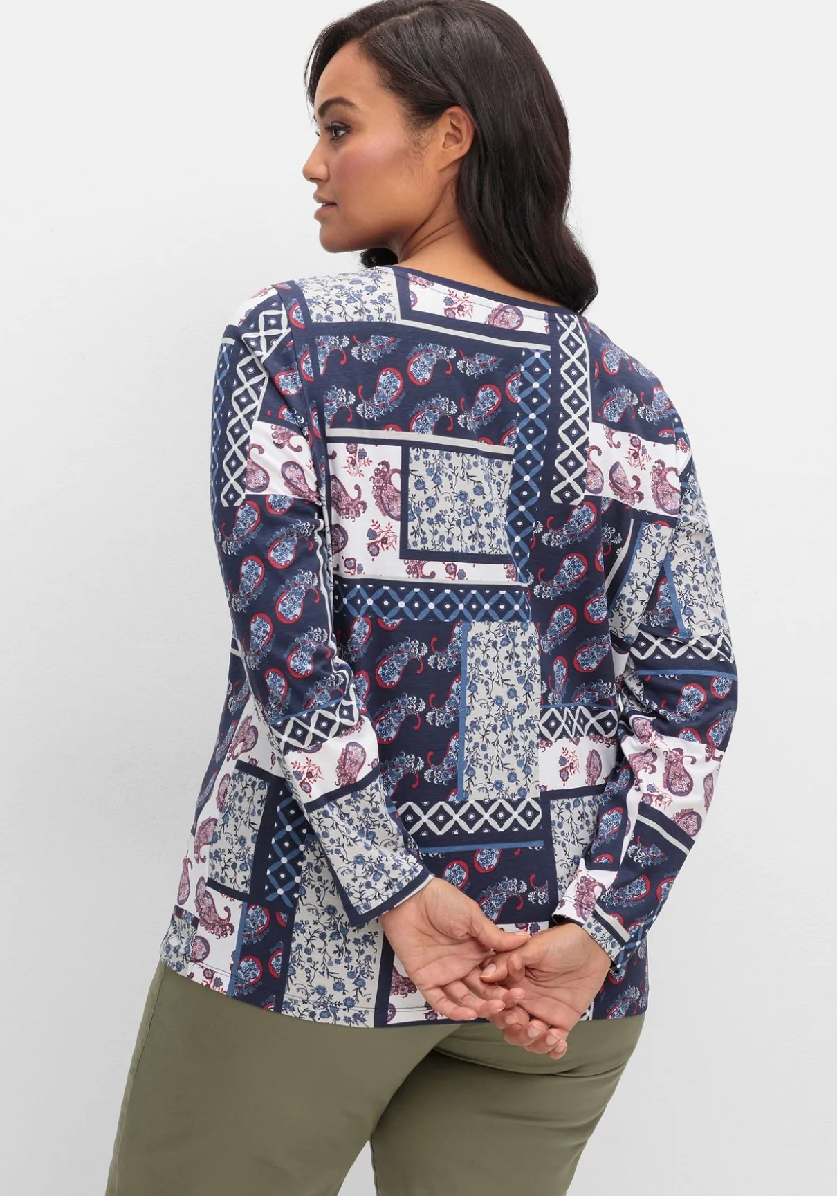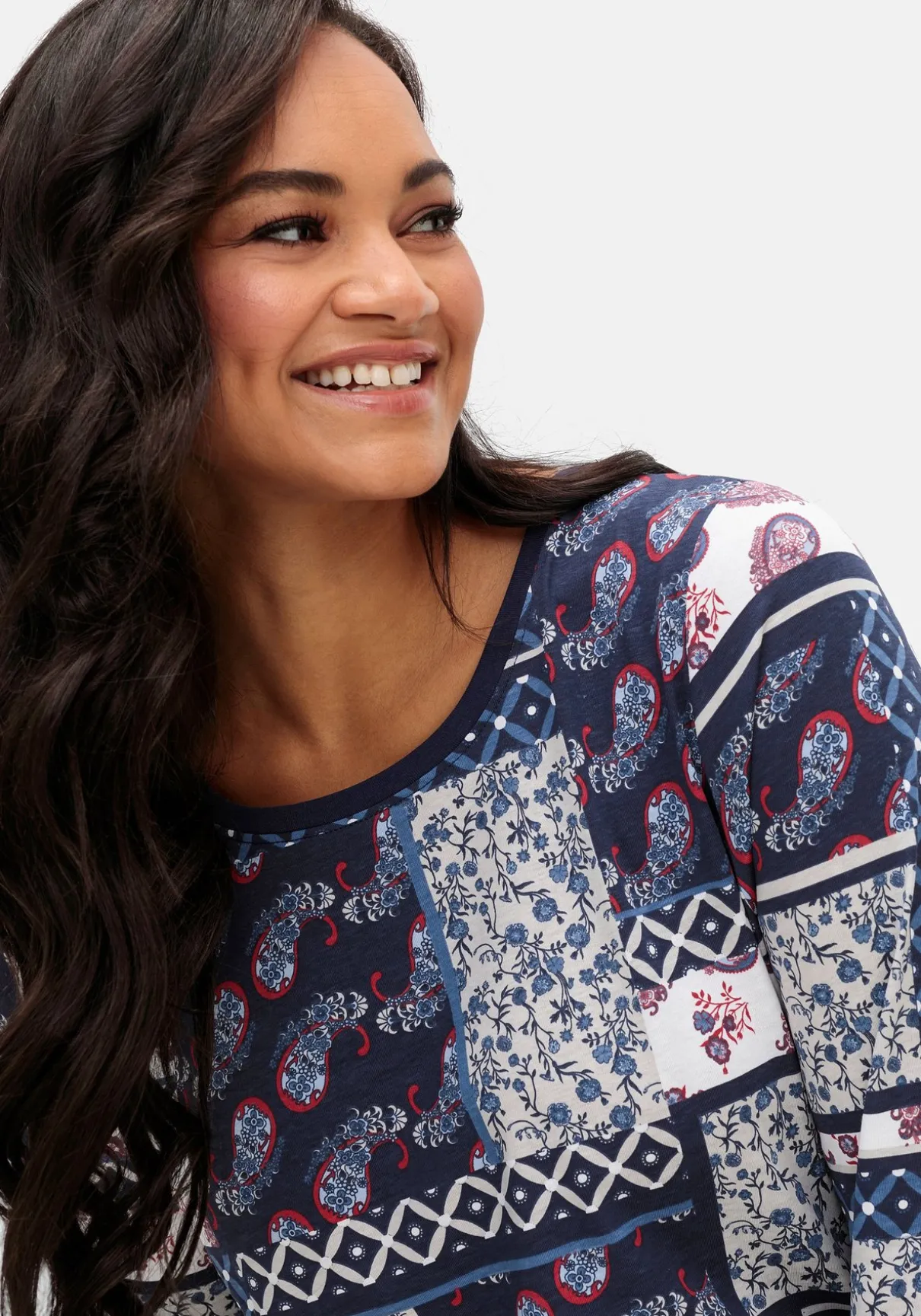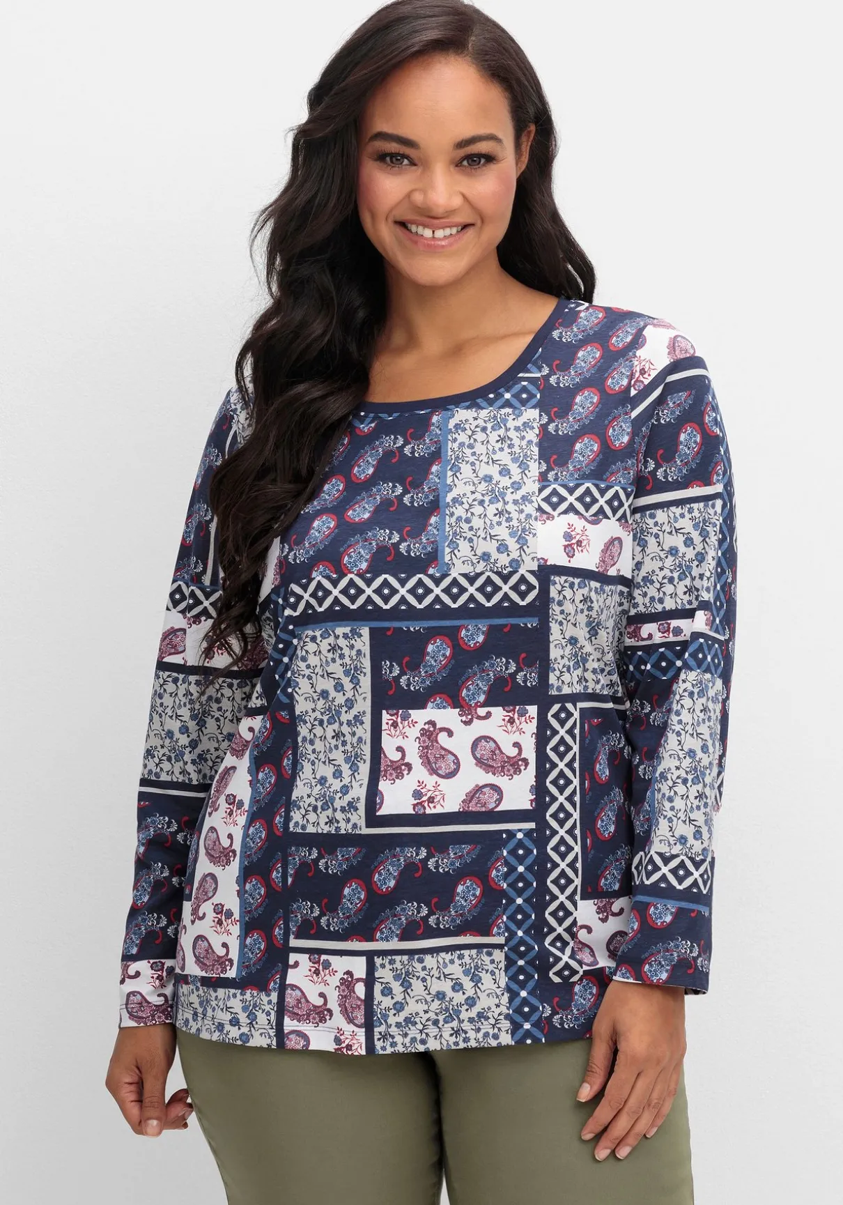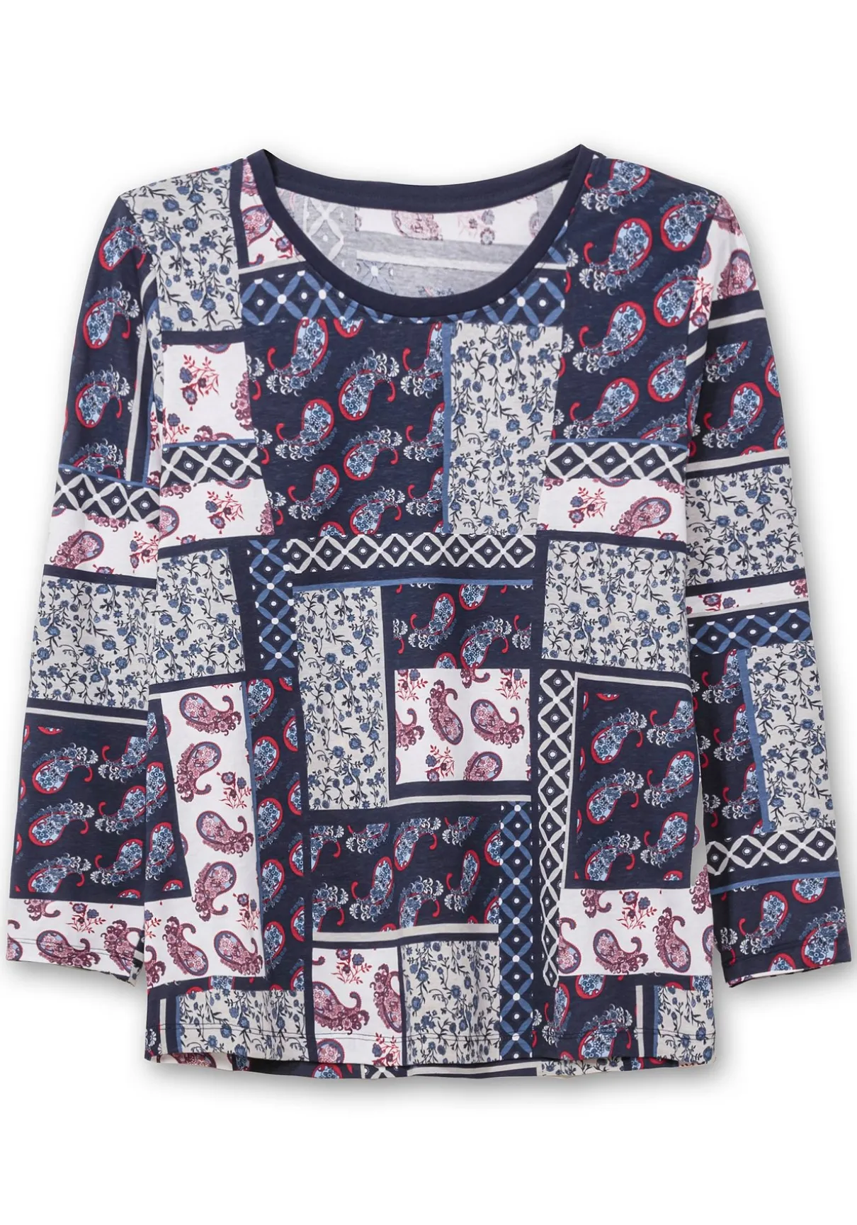 Shirt mit langem Arm. Durch den Patchwork-Alloverprint in harmonisch aufeinander abgestimmten Farben erhält das Langarmshirt einen stilvollen Look. Der unifarben paspelierte Rundhalsausschnitt setzt sich davon dekorativ ab.