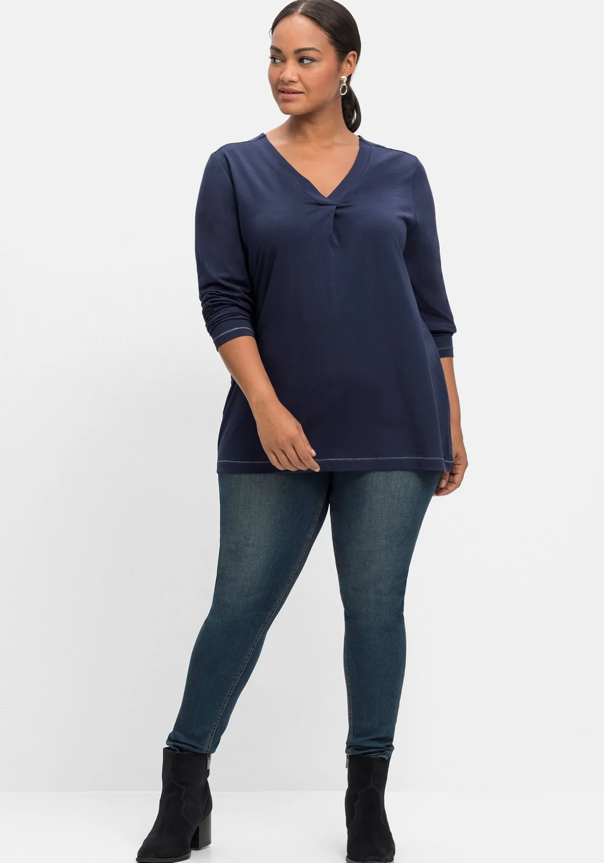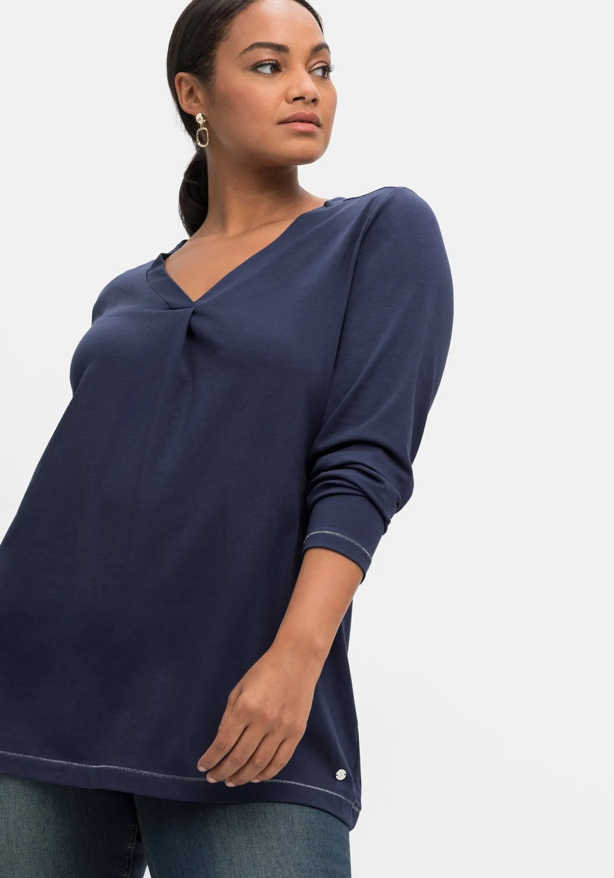 Shirt mit langem Arm. Feminine Details sind der V-Ausschnitt, der vorn in eine streckende Längsfalte übergeht, sowie das dezent glitzernde Glanzgarn, das Ärmel und Saum betont. Die vorverlegte Schulternaht rundet den Look modisch ab.