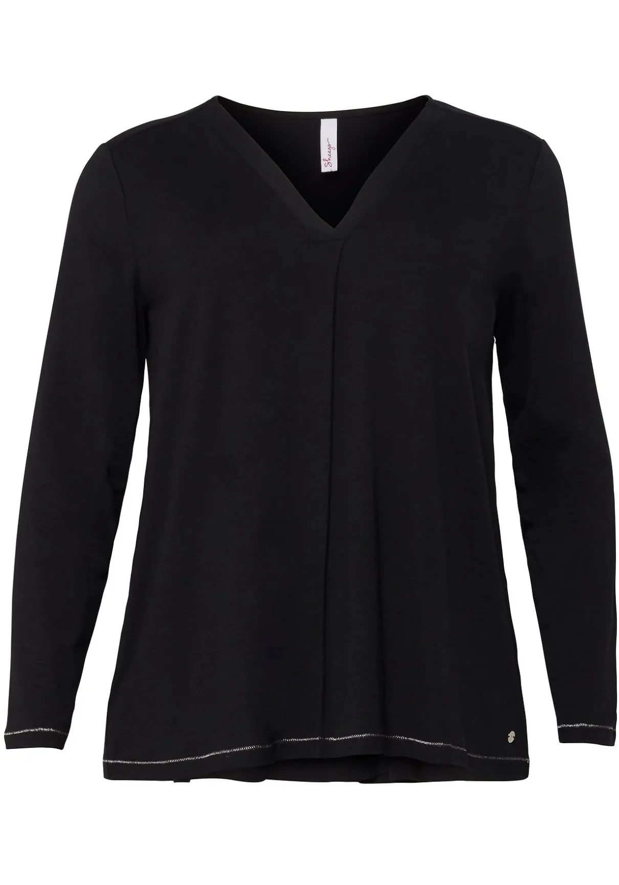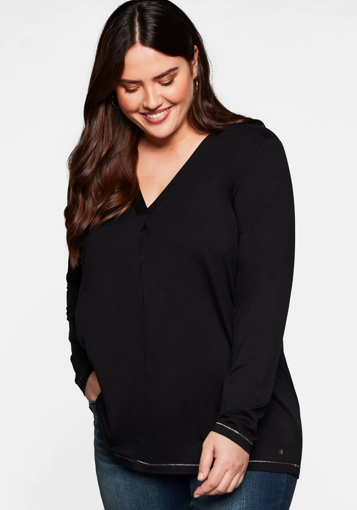 Shirt mit langem Arm. Feminine Details sind der V-Ausschnitt, der vorn in eine streckende Längsfalte übergeht, sowie das dezent glitzernde Glanzgarn, das Ärmel und Saum betont. Die vorverlegte Schulternaht rundet den Look modisch ab.