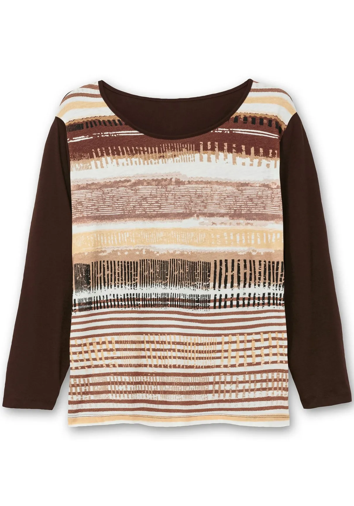 Langarmshirt mit Rundhalsausschnitt. Eyecatcher ist das attraktive Streifenmuster vorn auf dem Body, das aus jedem Teil ein Unikat macht. Die unifarbenen Ärmel setzen sich davon kontraststark ab.