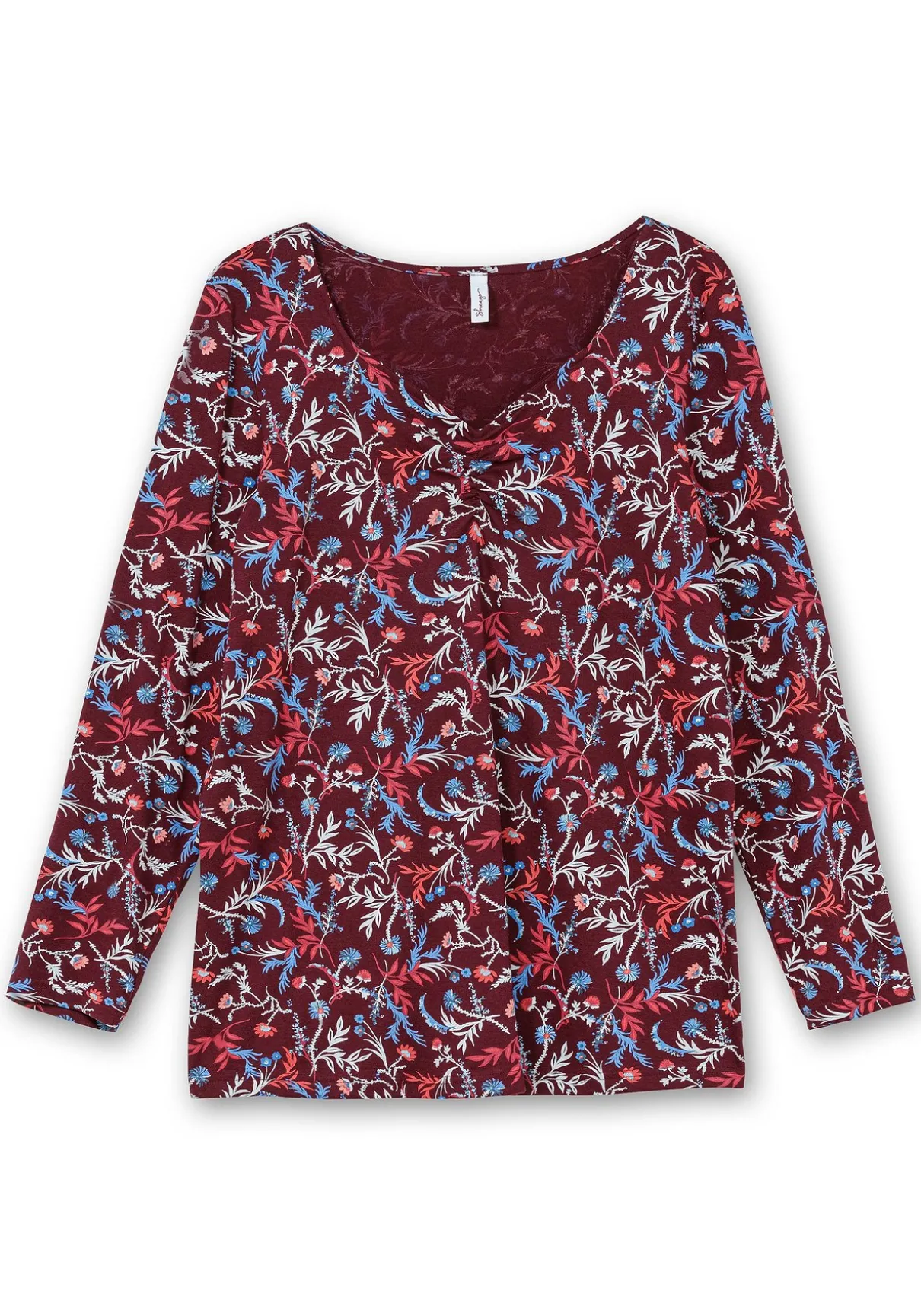 Langarmshirt mit verspieltem Blumenmuster. Der herzförmige Ausschnitt mit Raffung schmeichelt dem Dekolleté Fehler! Linkreferenz ungültig.und verleiht dem Oberteil eine feminine Note. Der gerade Saumabschluss lässt das Shirt lässig fallen. Dazu betont die leicht taillierte Passform dezent die X-Figur.