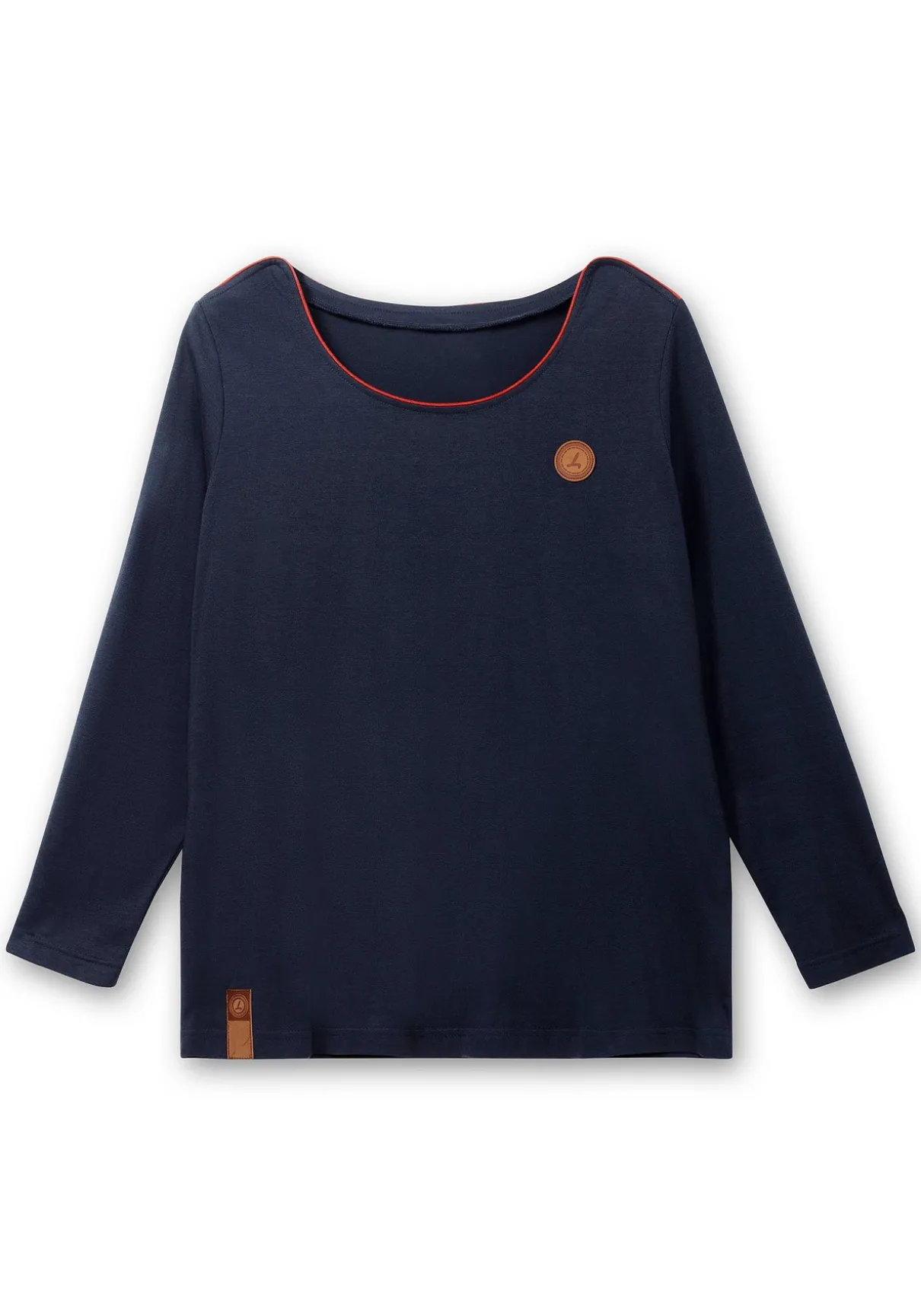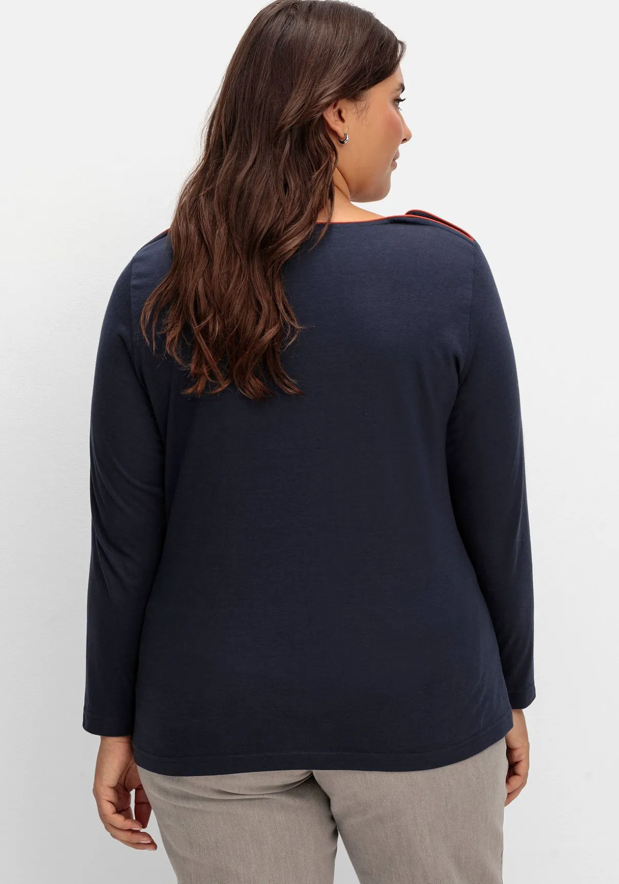 Langarmshirt mit Rundhalsausschnitt von sheego x Collection L. Die kontrastfarbenen Paspelierungen und der Aufnäher aus Lederimitat sind hier modische Details.