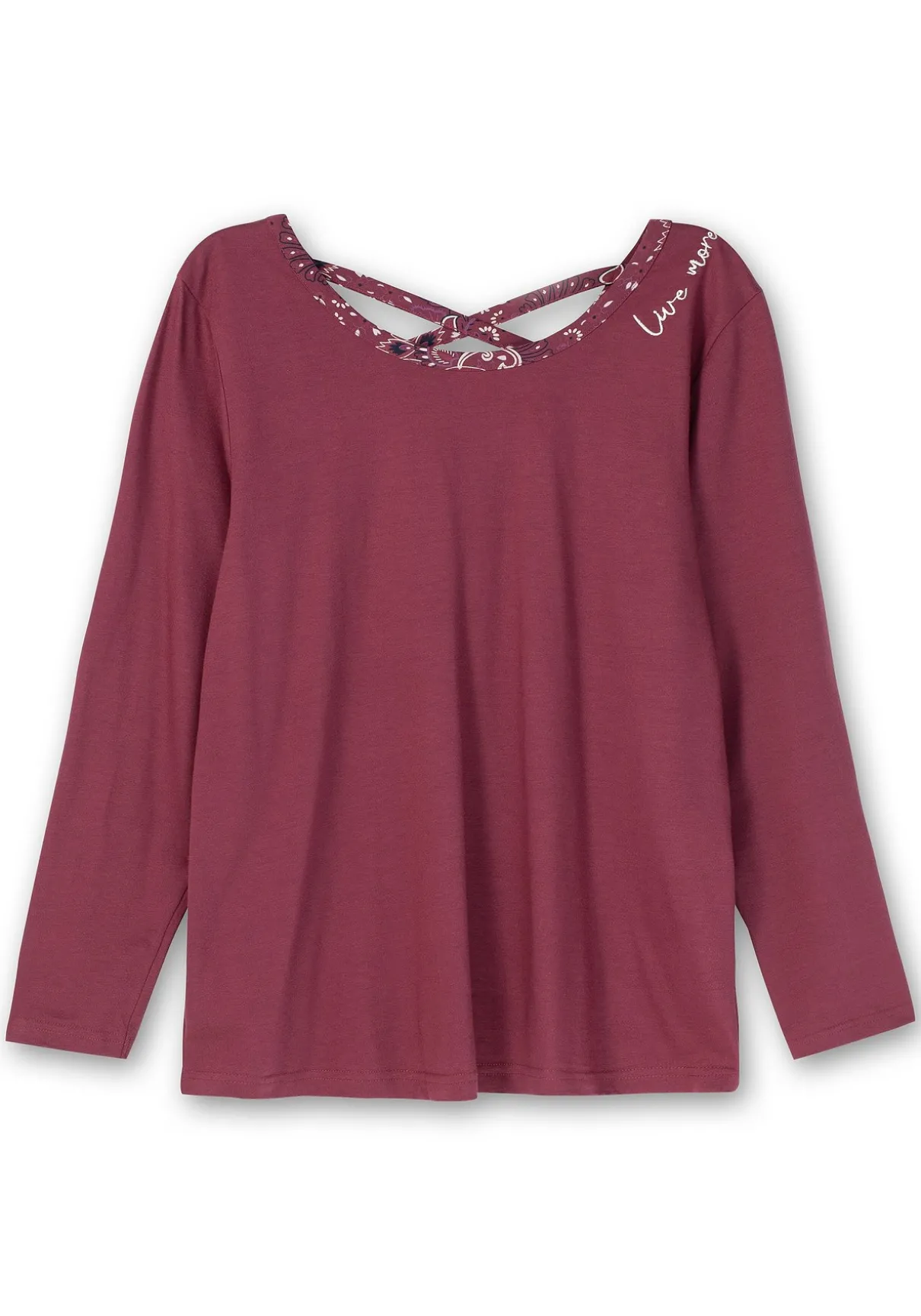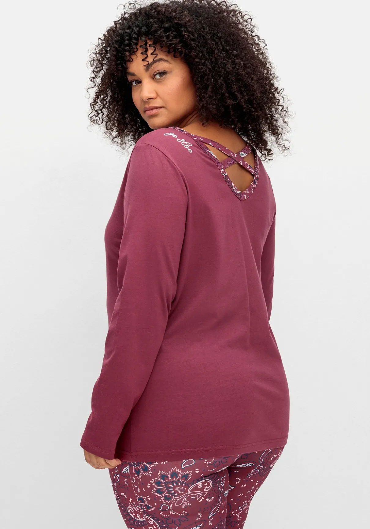 Langarmshirt von sheego by Joe Browns, mit bedrucktem Rundhals vorn. Hinten überrascht ein bedruckter, tieferer V-Ausschnitt, gekreuzte Bänder schmücken dekorativ die Rückenpartie. Ein Stickerei-Schriftzug setzt zusätzlich einen kontrastfarbenen Akzent. Mit passender Paisley-Hose aus unserer Homewear Kollektion macht den Loungewear-Look komplett.