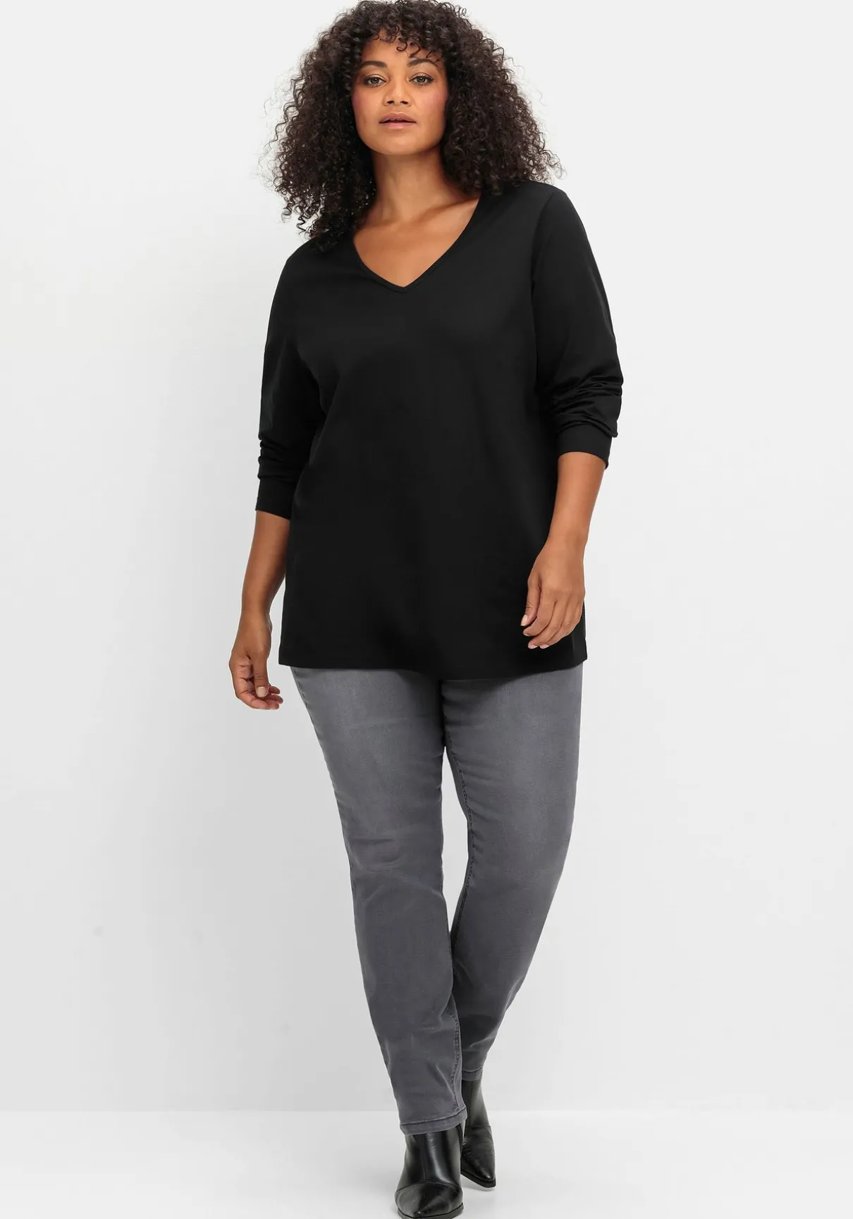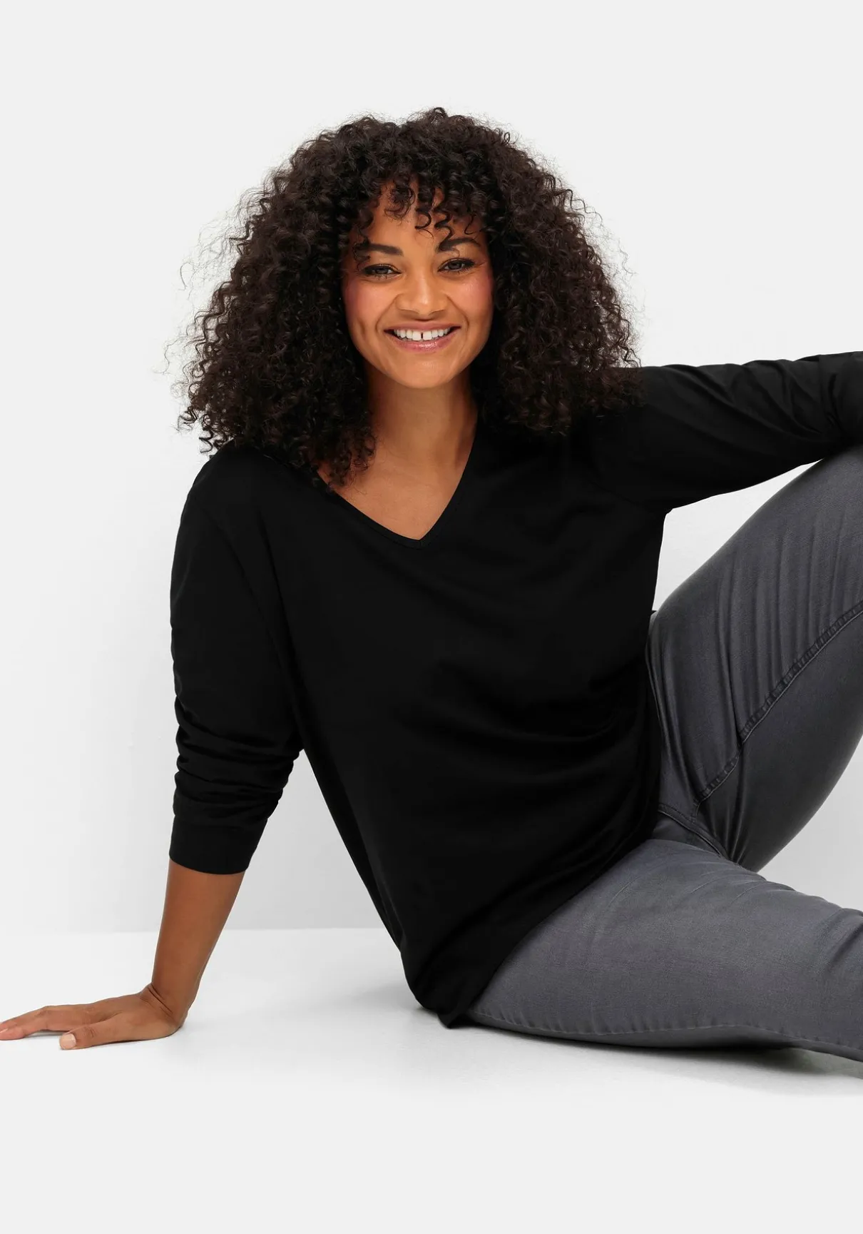Langarmshirt aus weichem Jersey. Das vielseitige Shirt besticht durch eine schmale Paspelierung am V-Ausschnitt. Die leichte A-Linie und der gerade Saumabschluss sorgen dazu für eine schmeichelnde Silhouette.