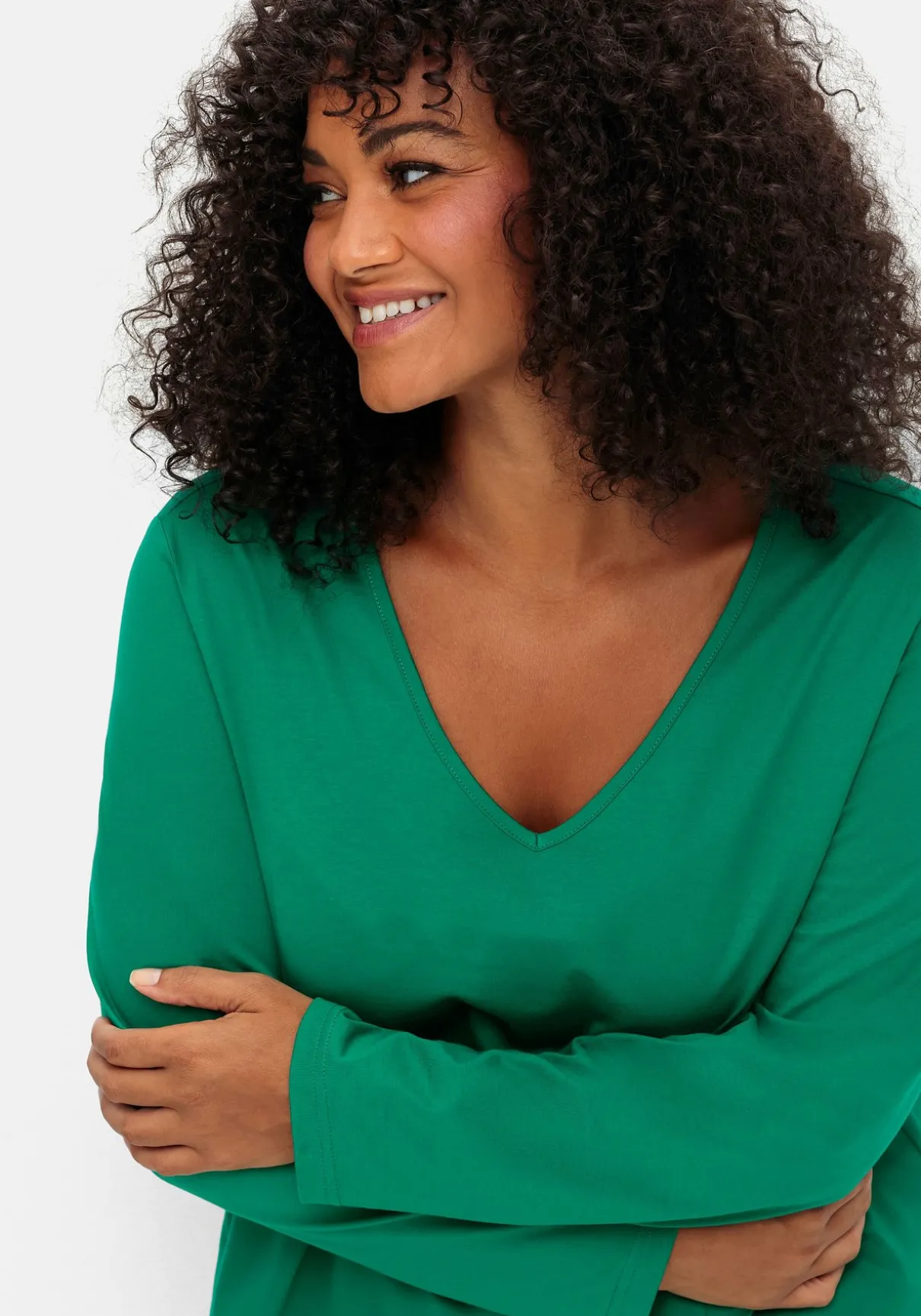 Langarmshirt aus weichem Jersey. Das vielseitige Shirt besticht durch eine schmale Paspelierung am V-Ausschnitt. Die leichte A-Linie und der gerade Saumabschluss sorgen dazu für eine schmeichelnde Silhouette.