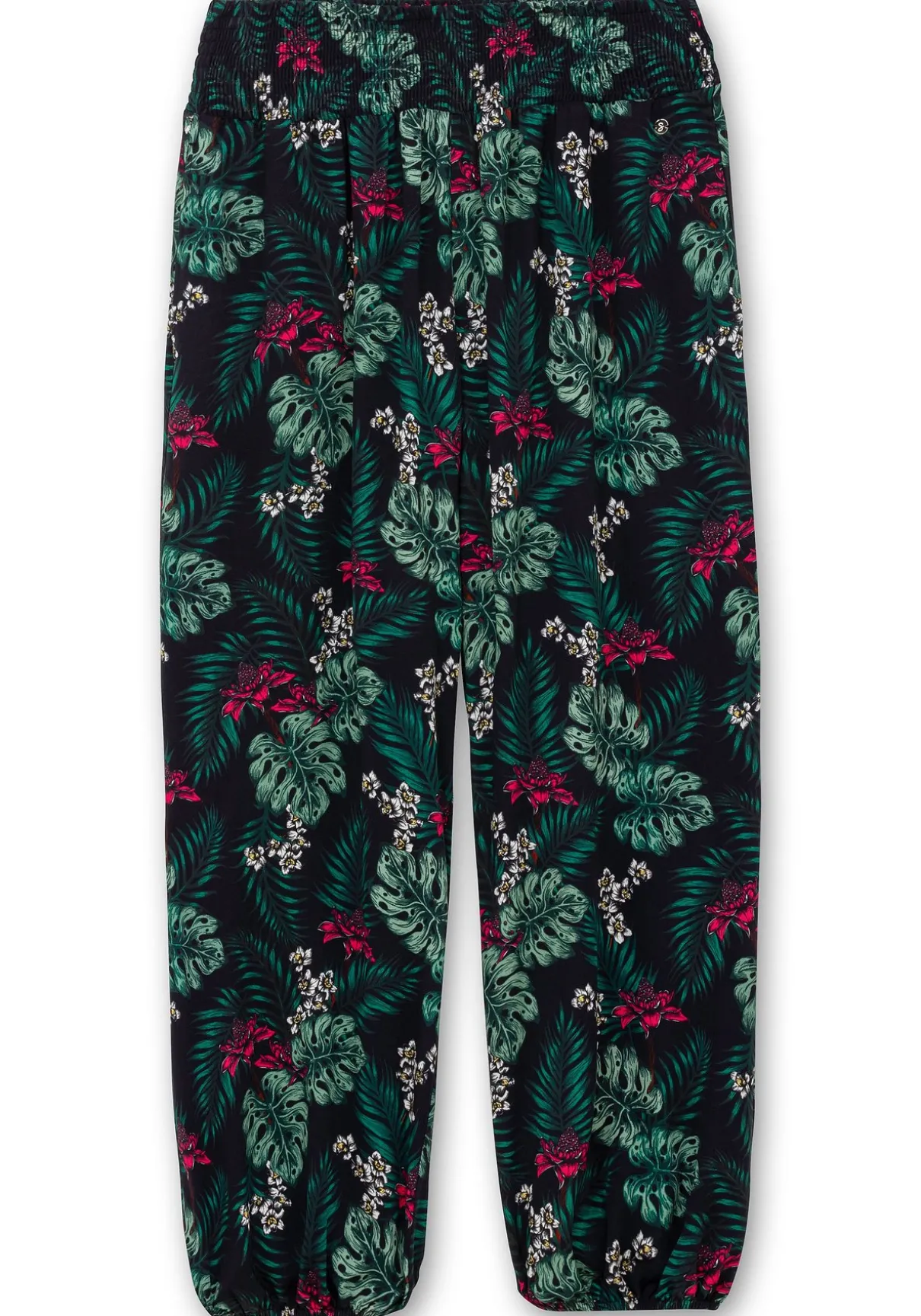 Lange Strandhose mit breitem, elastischem Smokbund. Der tropische Print sorgt für eine sommerliche Optik. In die Seiten sind praktische Eingrifftaschen eingefasst. Elastische Gummizugbündchen an den Beinabschlüssen sorgen für eine sportive Note.