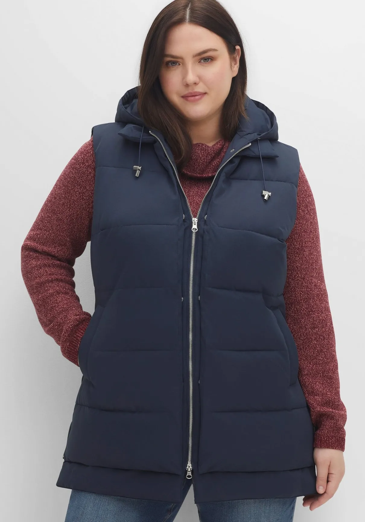 Steppweste im Lagenlook. Die modische Weste zeigt sich mit Kapuze und Bindeband, Eingrifftaschen und praktischem 2-Wege-Reißverschluss. Auch die beiden seitlichen Reißverschlüsse dienen nicht nur als modisches Detail, sondern verleihen dem Schnitt zusätzlich mehr Weite im Hüftbereich. Der doppellagig gearbeitete Saum lässt die legere Double-Layer-Optik entstehen.