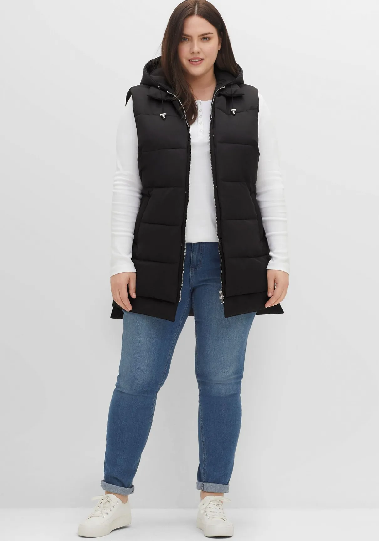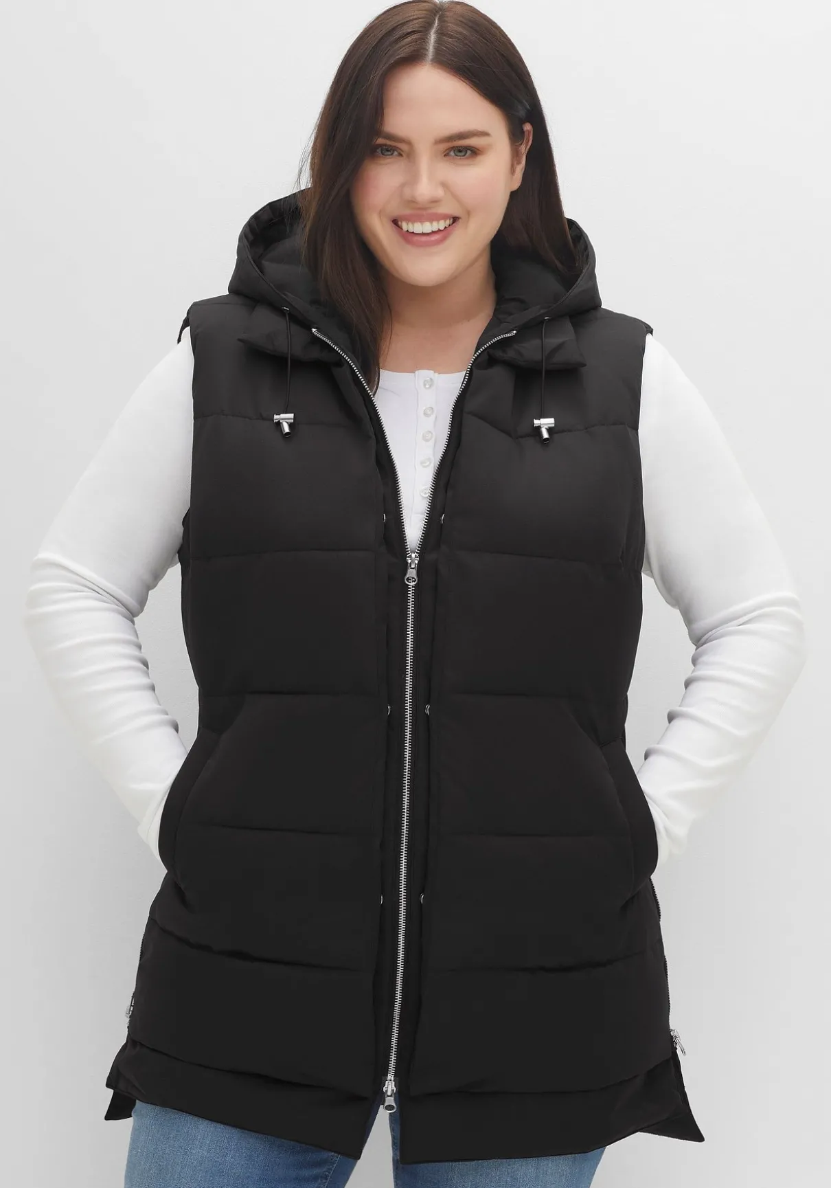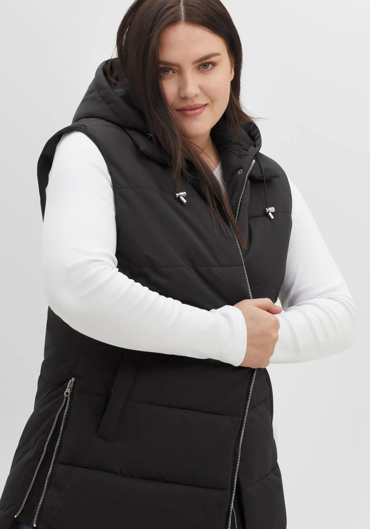 Steppweste im Lagenlook. Die modische Weste zeigt sich mit Kapuze und Bindeband, Eingrifftaschen und praktischem 2-Wege-Reißverschluss. Auch die beiden seitlichen Reißverschlüsse dienen nicht nur als modisches Detail, sondern verleihen dem Schnitt zusätzlich mehr Weite im Hüftbereich. Der doppellagig gearbeitete Saum lässt die legere Double-Layer-Optik entstehen.