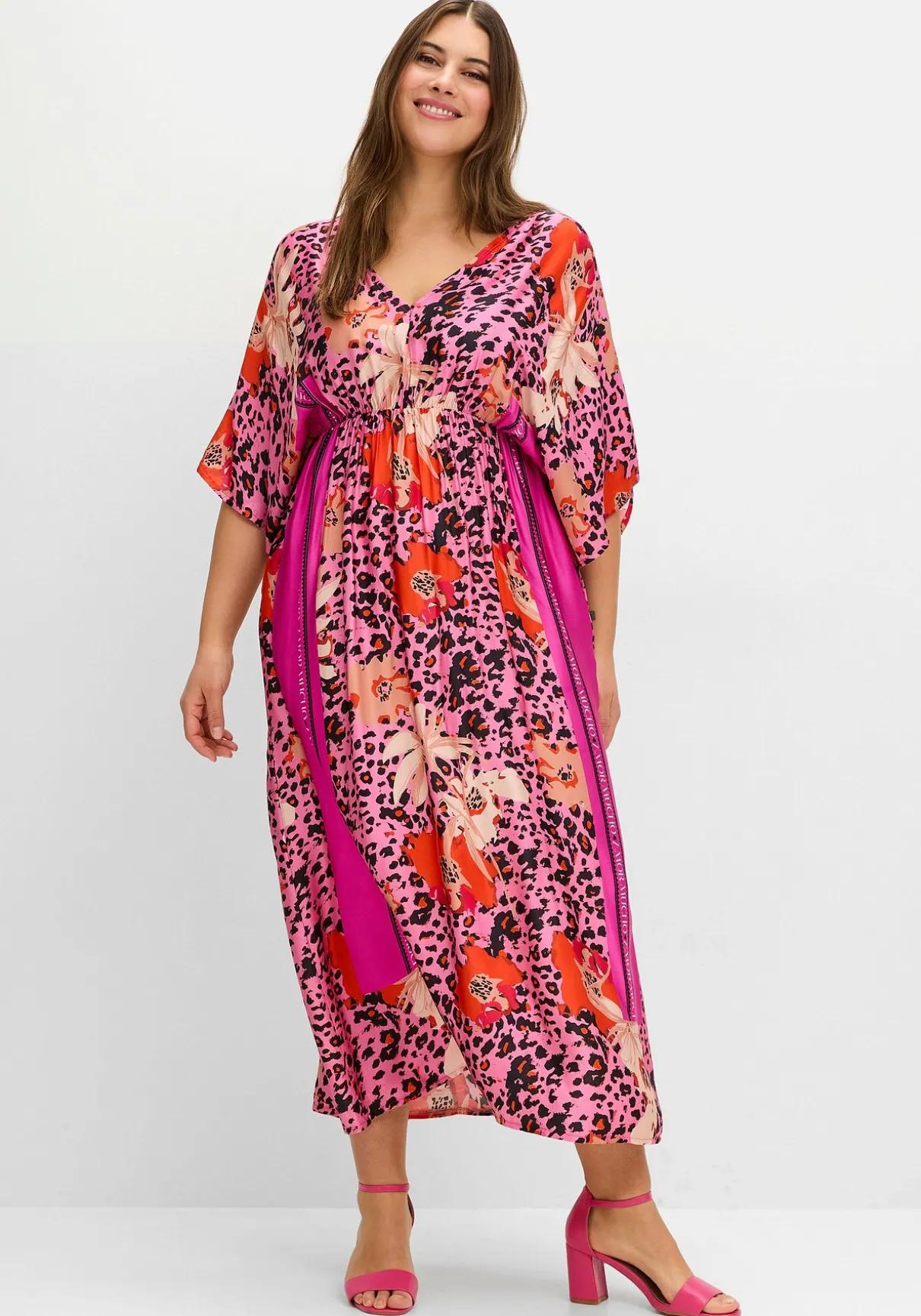 Kleid von sheego loves miss goodlife. In stilvoller Maxilänge verzaubert dieses Kleid außerdem mit aufregendem Mustermix aus Leo- und Blütenprints. Der tiefe V-Ausschnitt unterstreicht die feminine Note, während die luftig weiten Halbärmel dem Design eine lässige Eleganz verleihen. Ein erhöhter Taillen-Gummizug sorgt für eine schmeichelnde Silhouette und maximalen Komfort. Der leicht ausgestellte Schnitt mit seitlichen Bordürenprints im Vorderteil lässt eine moderne und zugleich dynamische Silhouette entstehen.