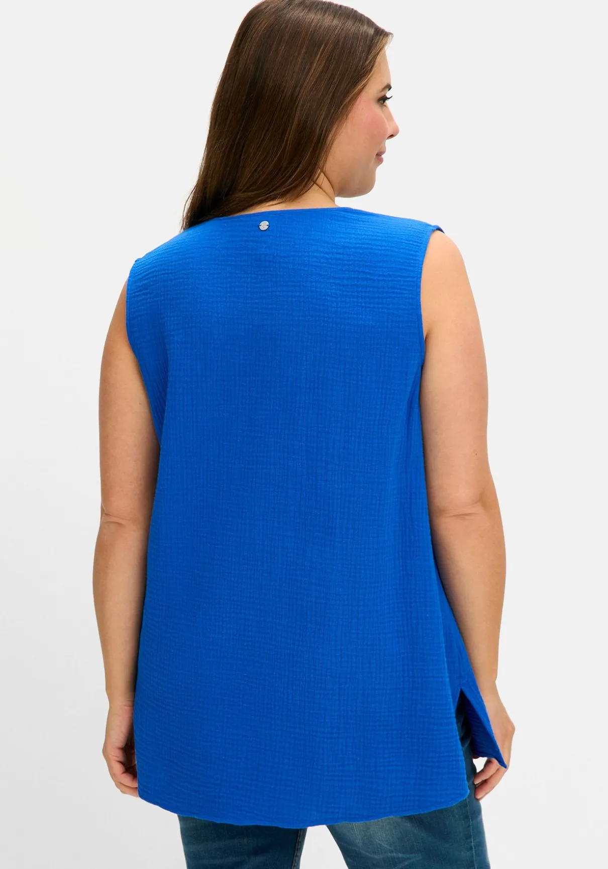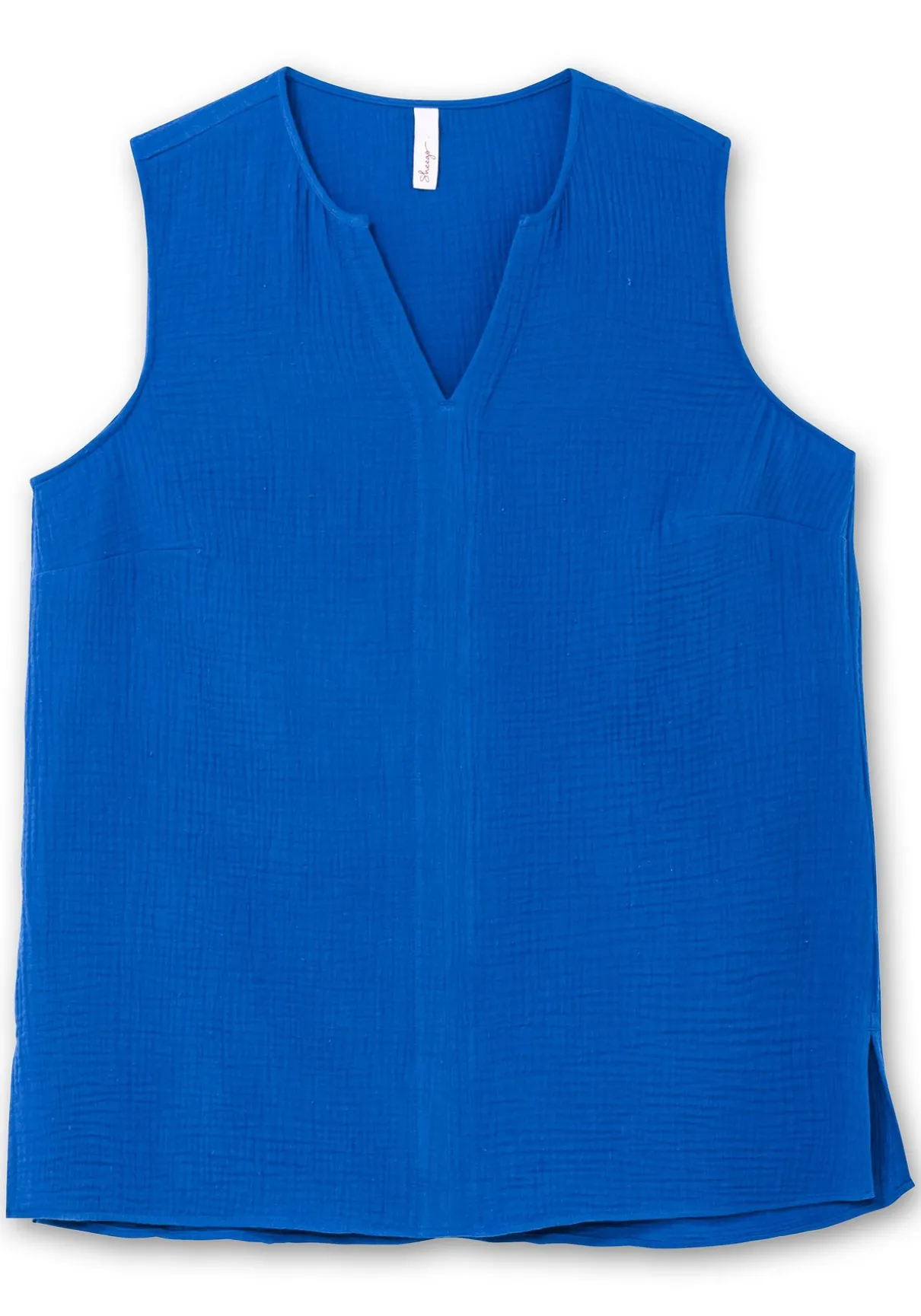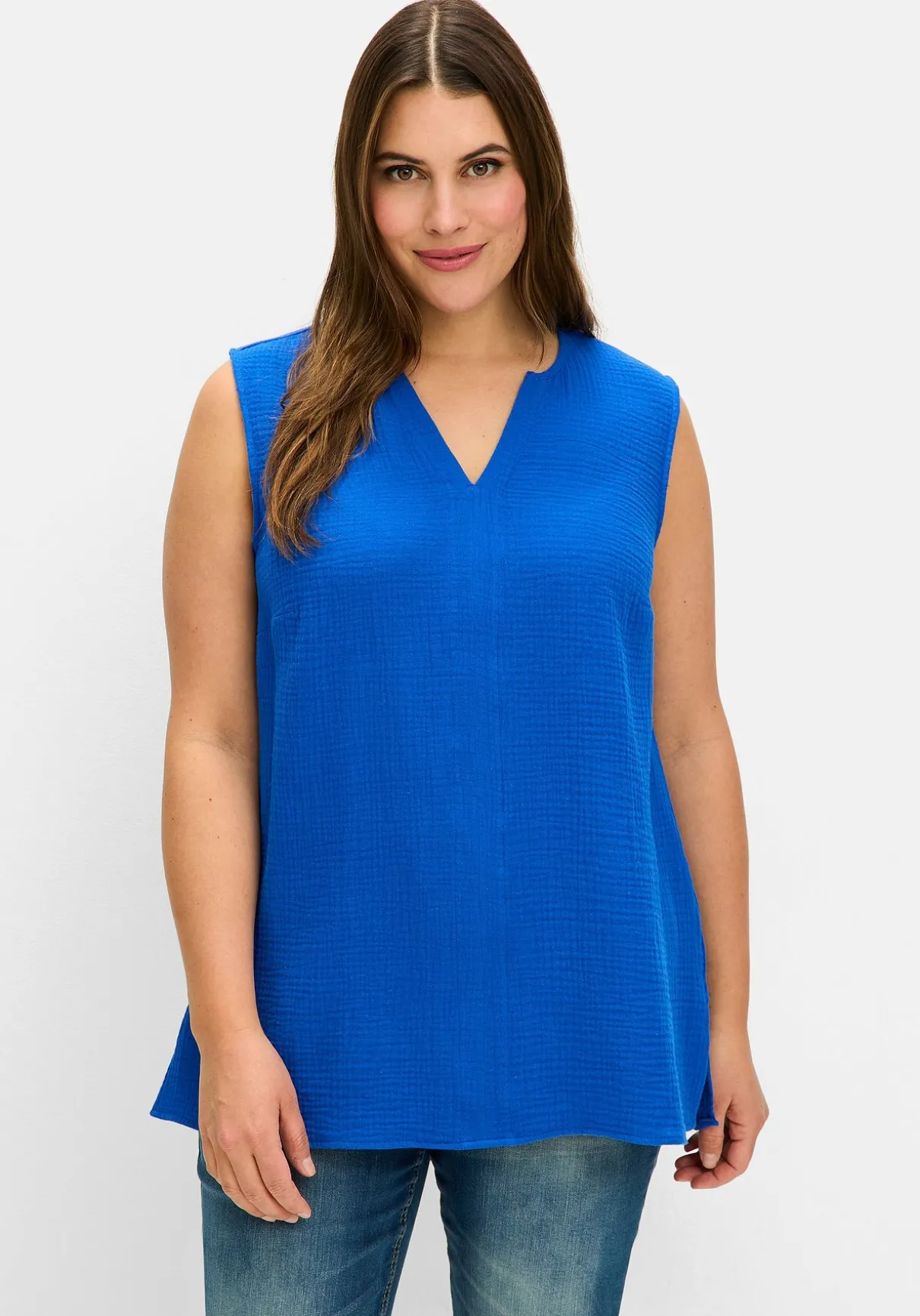Top aus weichem, dezent strukturiertem Musselin. Die Blende am V-Schlitz geht in eine mittige Teilungsnaht über, die breiten Träger lassen entspannt den BH-Träger verschwinden. Durch den etwas längeren Schnitt mit leicht verlängerter Rückenpartie und seitlichen Schlitzen fällt das Top schmeichelnd über Hüfte und Po.