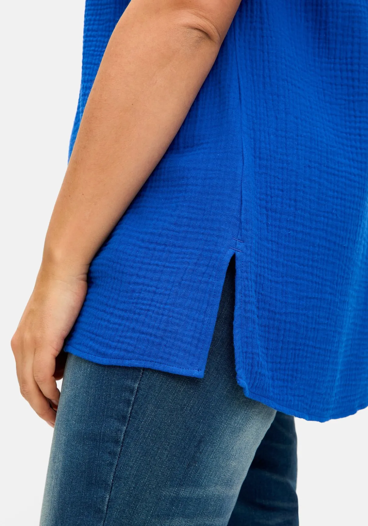 Der Musselin-Stoff aus softer Baumwolle besitzt eine dezent strukturierte Optik, trägt sich herrlich leicht und liegt weich auf der Haut.