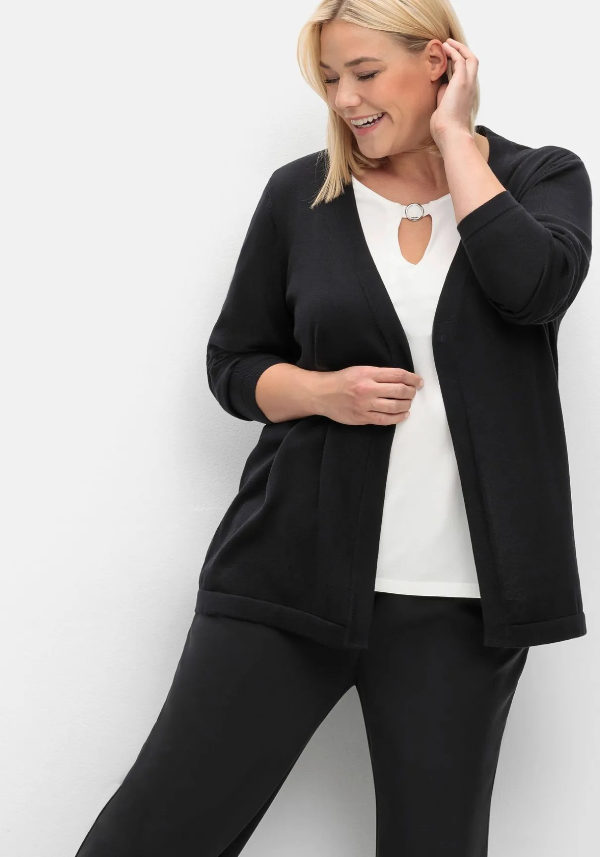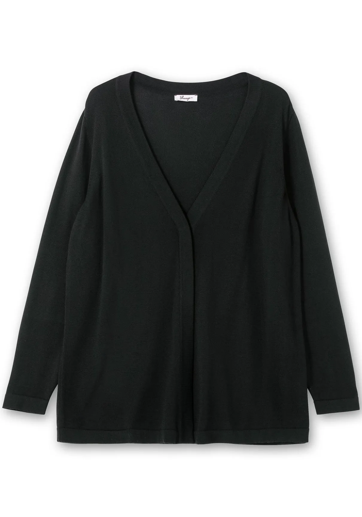 Strickjacke in feiner, leichter Qualität. Der zeitlose Style ist mit V-Ausschnitt und langen Ärmeln gearbeitet. Die Jacke ist oben mit einem Knopf zu schließen und erhält so einen besonders lockeren, luftigen Fall. Gepflegtes Finish ist die Blende an allen Abschlüssen.