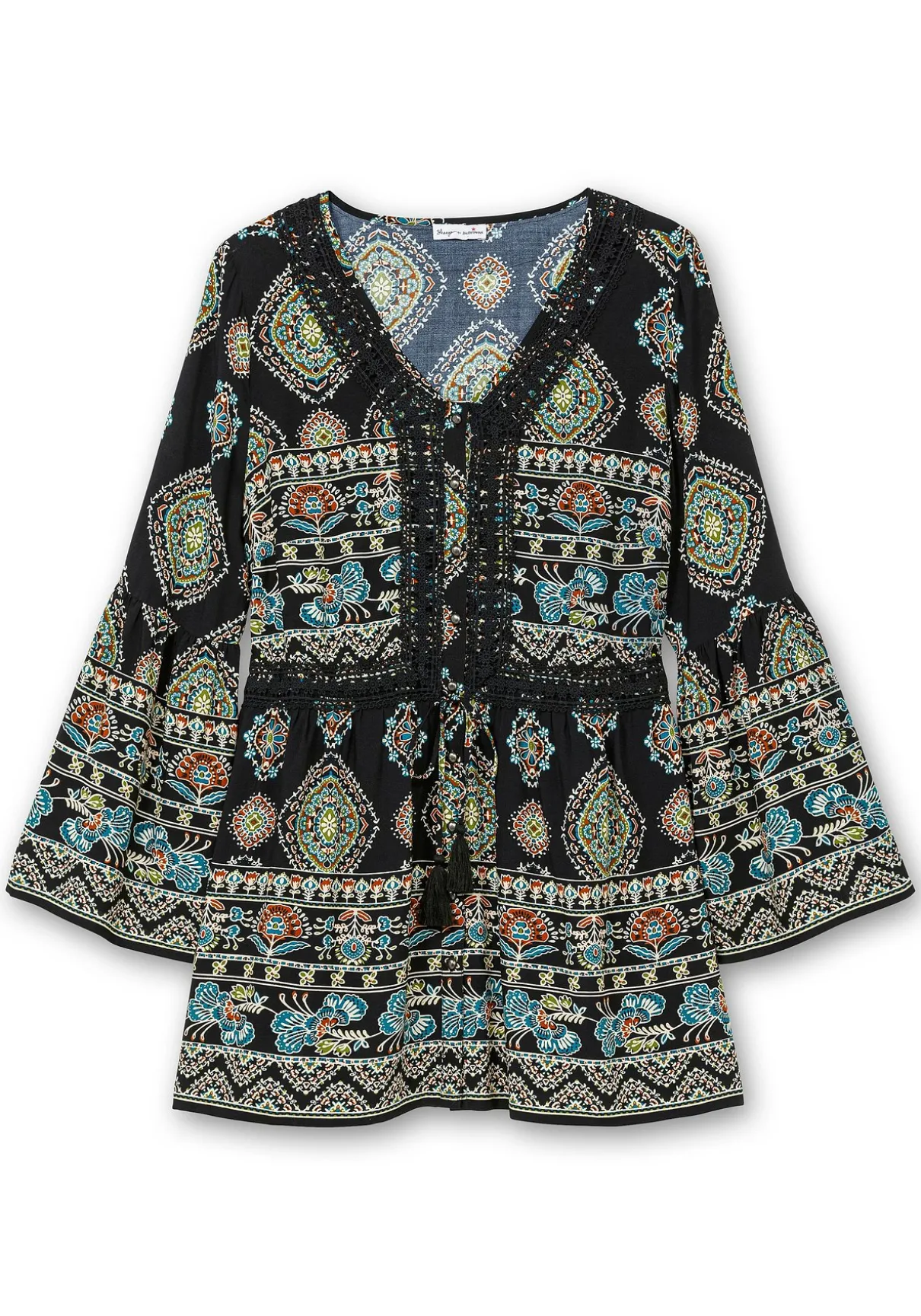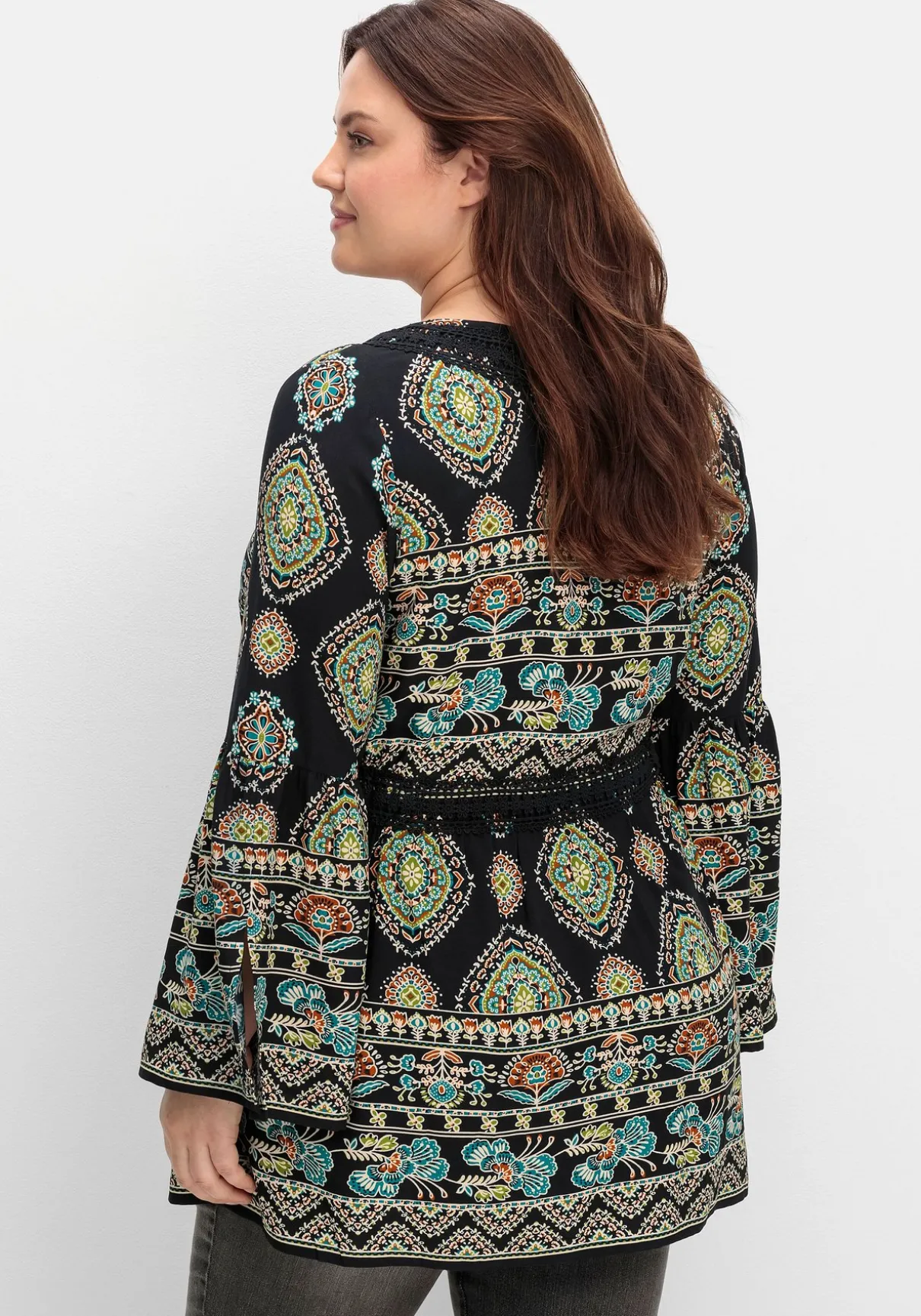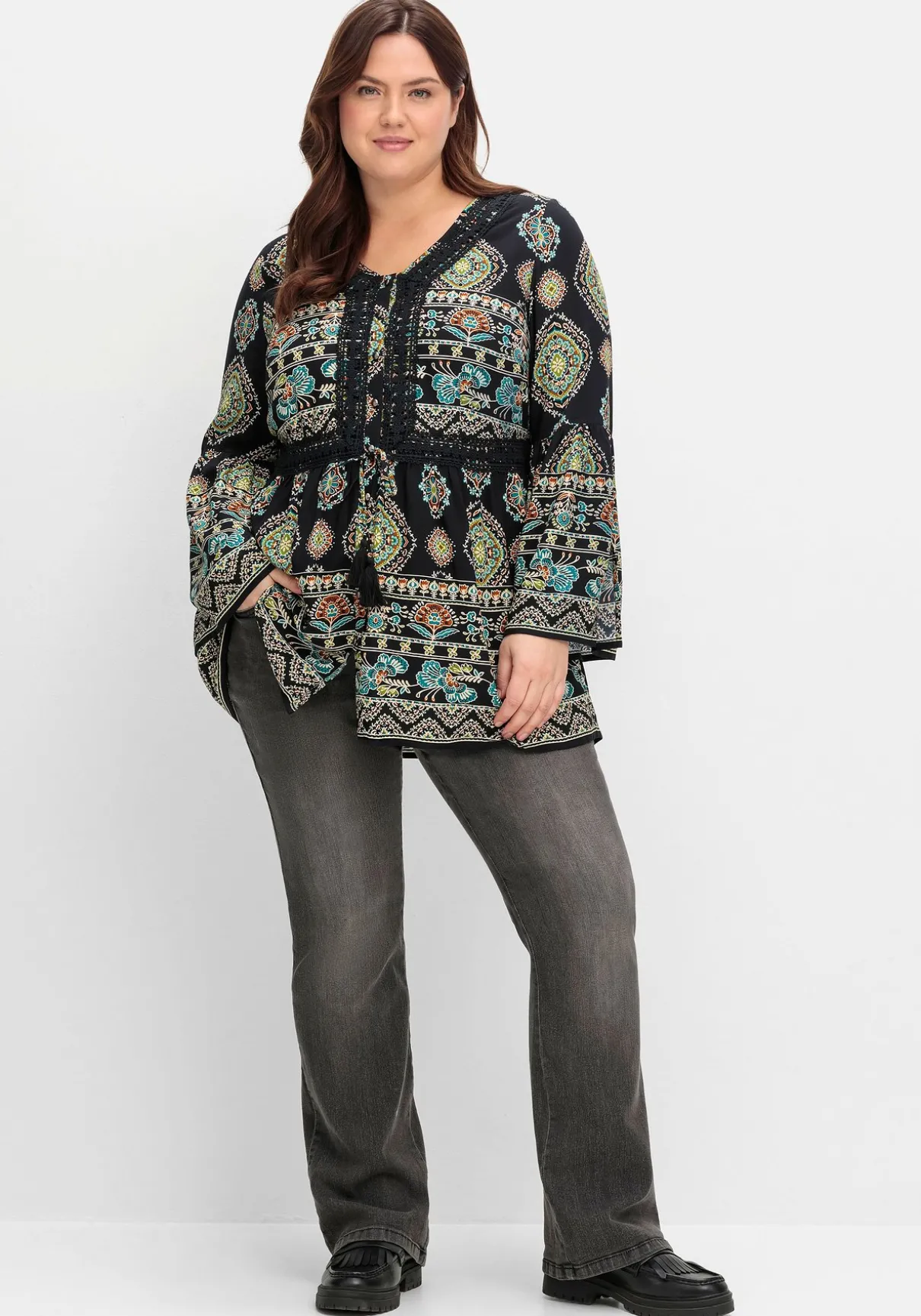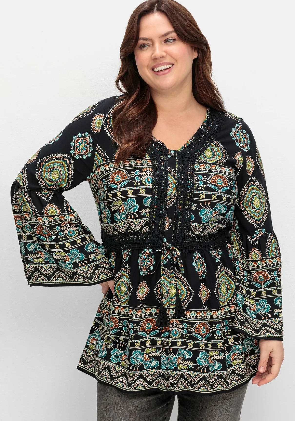 Bluse in Longform von sheego by Joe Browns. Der Mix aus floralem Alloverdruck und Bordürenprint verleiht ihr besonderen Boho-Chic und macht aus jedem Teil ein Unikat. Der V-Ausschnitt mit Crochetspitze betont dekorativ das Dekolleté, während die Knöpfe in Metalloptik moderne Akzente setzen. Elastische Einsätze in der Taille formen schmeichelnd die Figur, Spitzenbesatz, Kordel und Bindeband mit Tassel sorgen für einen verspielten Look. Die Trompetenärmel mit Schlitz runden das Design modisch ab.