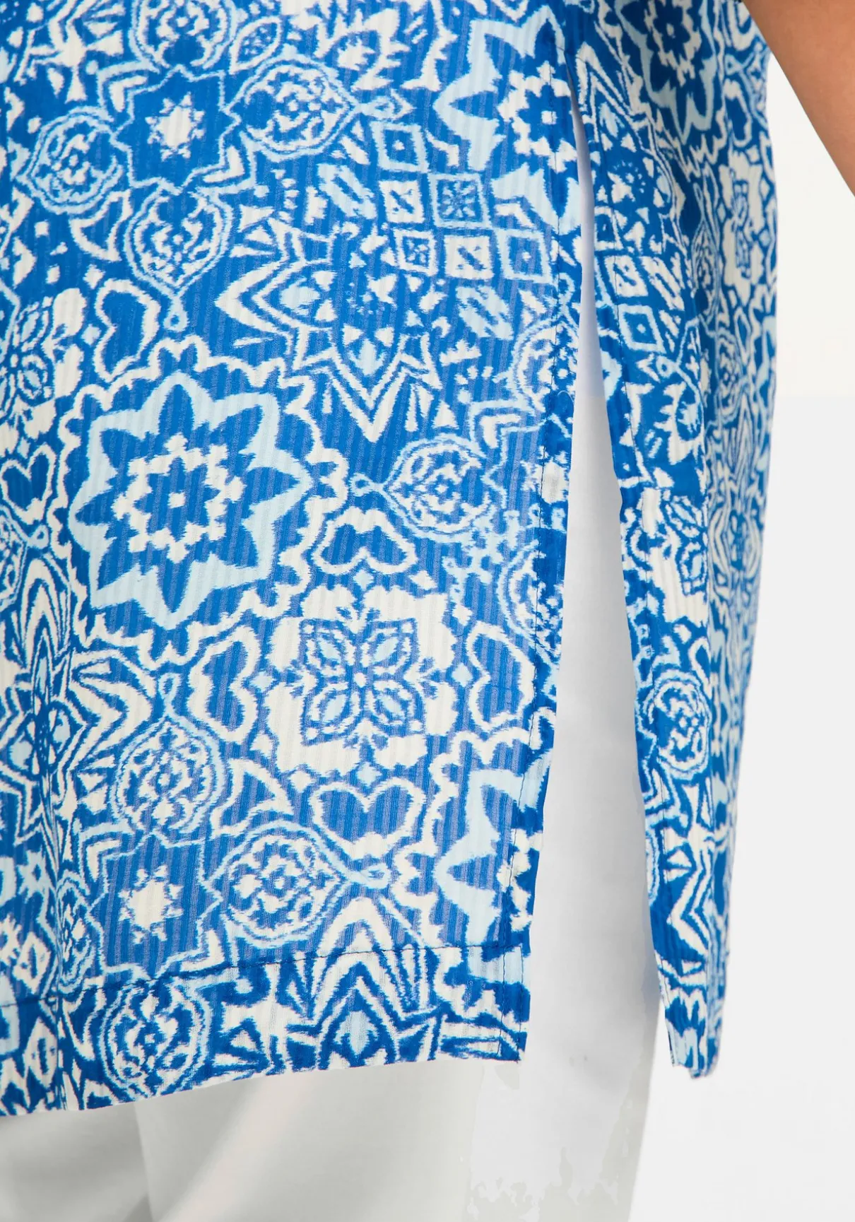 Bluse in Longform. Der dekorative Blätterdruck verleiht ihr eine sommerliche Optik. Der Blusenkragen geht in einen streckenden V-Schlitz über, darunter schließt sich die Knopfleiste an. Die 3/4-Ärmel sind mit Schlitzen und breiten Manschetten versehen. Abgerundet wird der Look durch die Kellerfalte im Rücken sowie hohe Seitenschlitze. Perfekt auch offen als sommerlicher Jacken-Ersatz zu tragen.