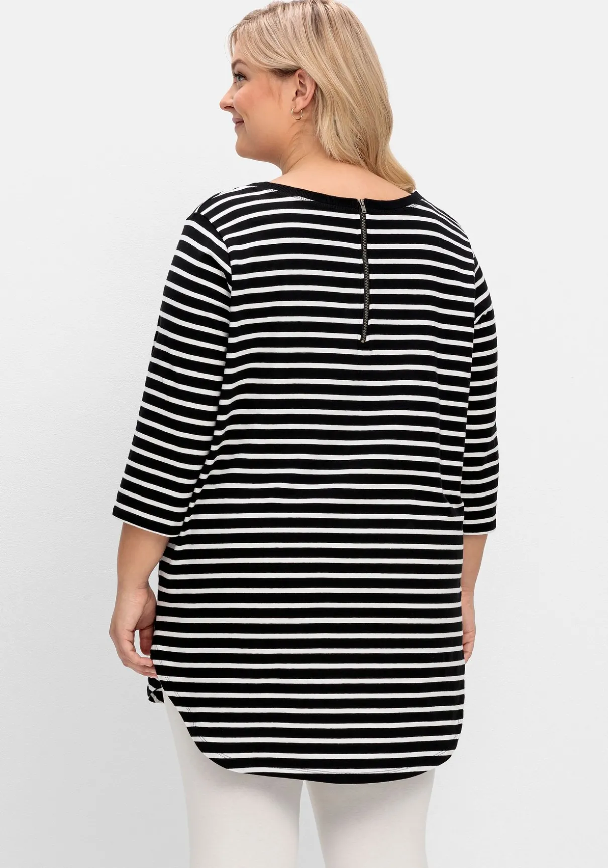 Das Streifenshirt neu interpretiert: Die moderne Oversized-Form und die angesagte, verlängerte Rückenpartie verleihen dem Shirt einen aktuellen Look. Auch der Metall-Reißverschluss im Nacken trägt dazu bei. Mit garngefärbten Streifen, Rundhalsausschnitt und 3/4-langen Ärmeln.
