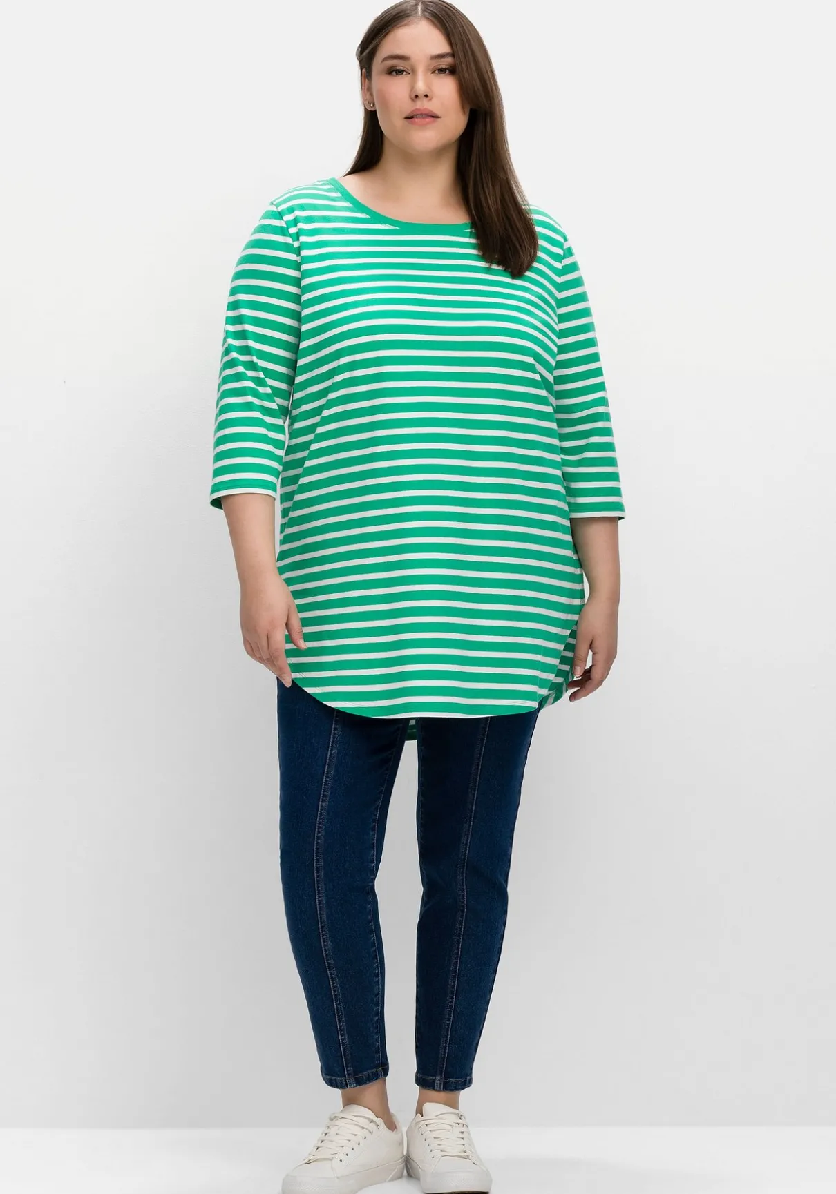 Das Streifenshirt neu interpretiert: Die moderne Oversized-Form und die angesagte, verlängerte Rückenpartie verleihen dem Shirt einen aktuellen Look. Auch der Metall-Reißverschluss im Nacken trägt dazu bei. Mit garngefärbten Streifen, Rundhalsausschnitt und 3/4-langen Ärmeln.