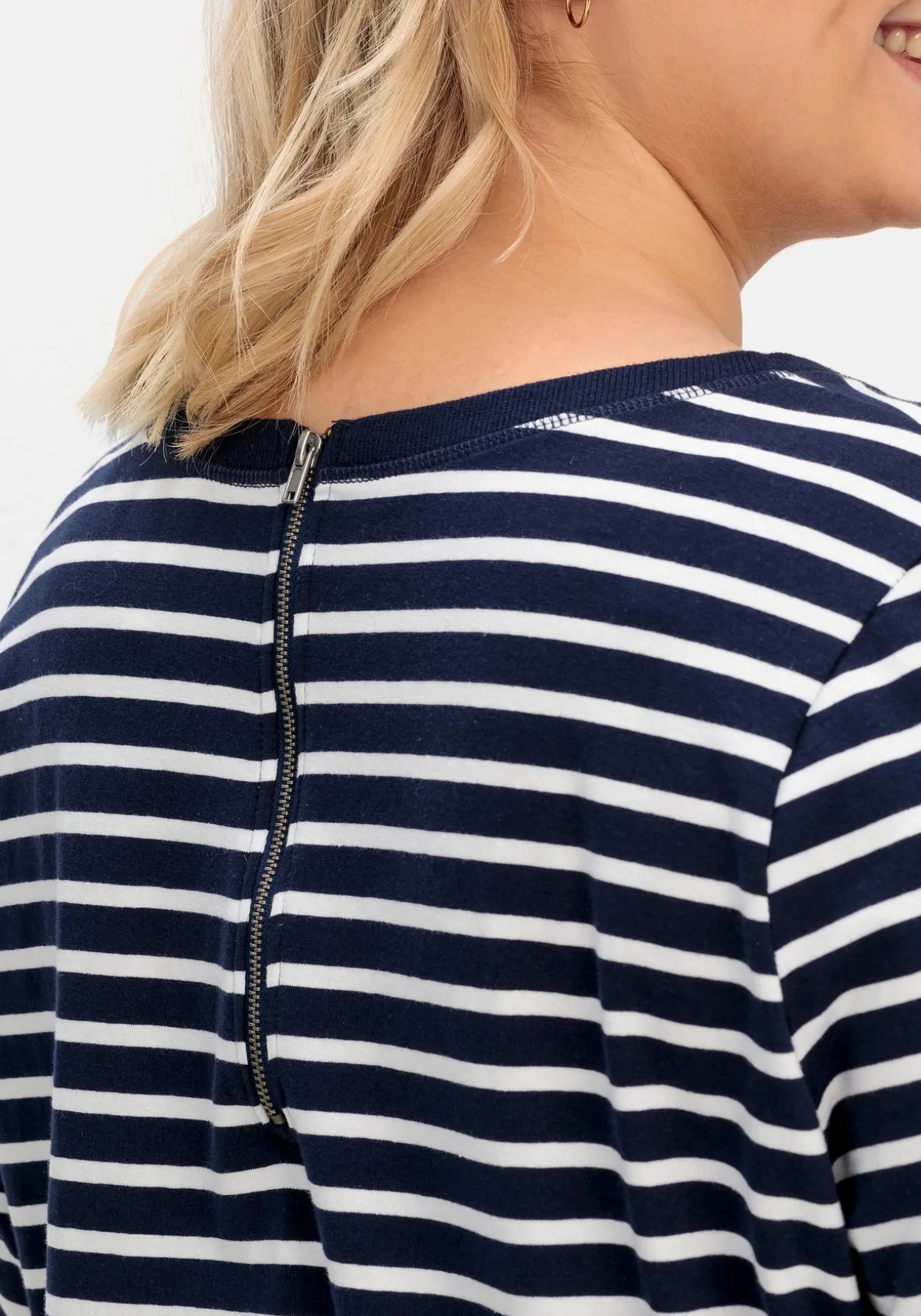 Das Streifenshirt neu interpretiert: Die moderne Oversized-Form und die angesagte, verlängerte Rückenpartie verleihen dem Shirt einen aktuellen Look. Auch der Metall-Reißverschluss im Nacken trägt dazu bei. Mit garngefärbten Streifen, Rundhalsausschnitt und 3/4-langen Ärmeln.