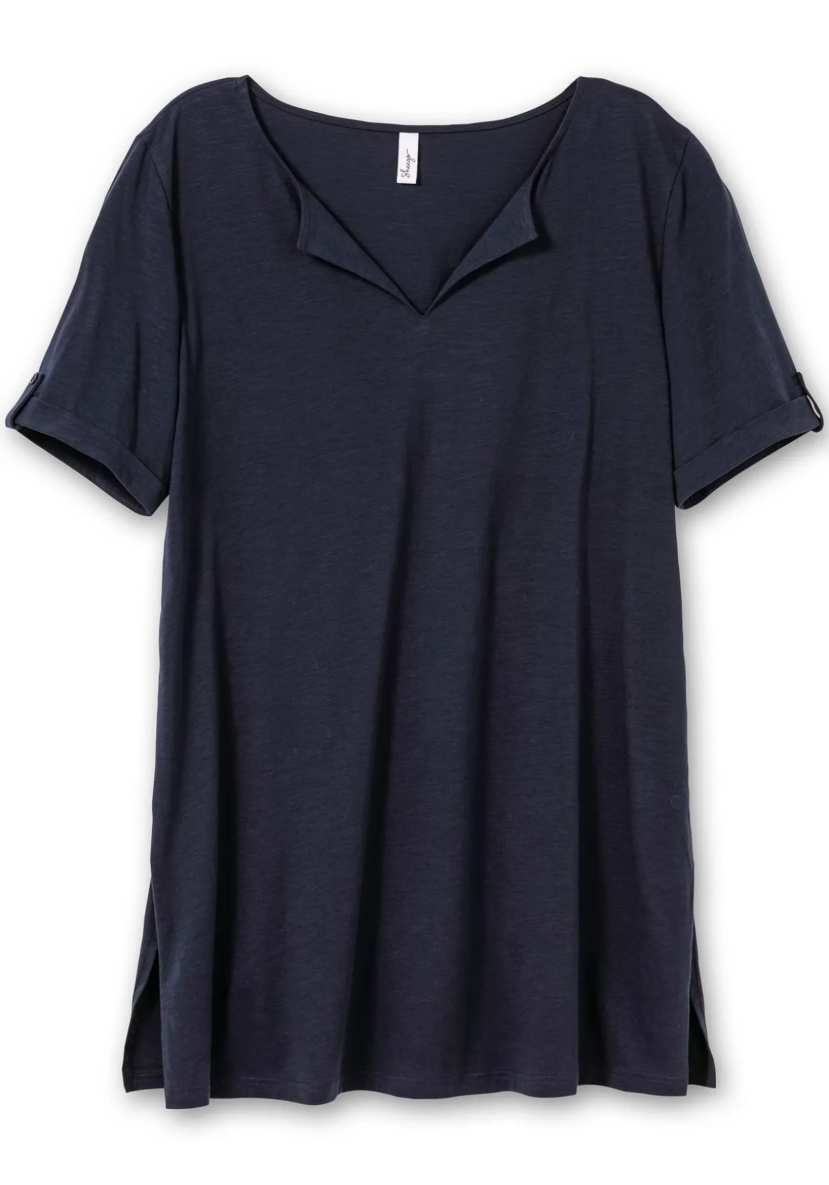 Shirt in langer, weiter Form. Für eine feminine Note sorgt der vorn geschlitzte Rundhalsausschnitt, die länger geschnittenen Ärmel werden durch Zierriegel dekoriert. Am geraden Saum befinden sich Seitenschlitze.