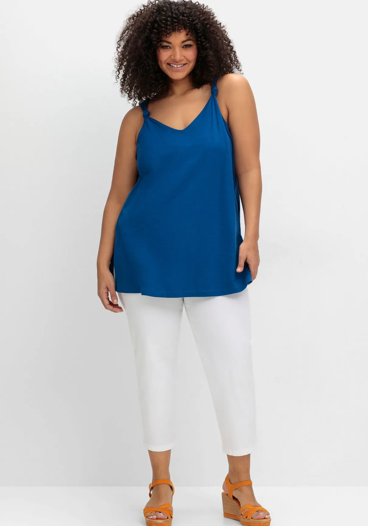 Top in leicht ausgestellter Longform. Mit etwas tieferem V-Ausschnitt und geschlossenem Rücken lässt es sich zu vielen sommerlichen Looks kombinieren. Hübsches Detail ist der fixierte Knoten am Träger. Hohe Seitenschlitze am Saum geben Bewegungsfreiheit und Bequemlichkeit.