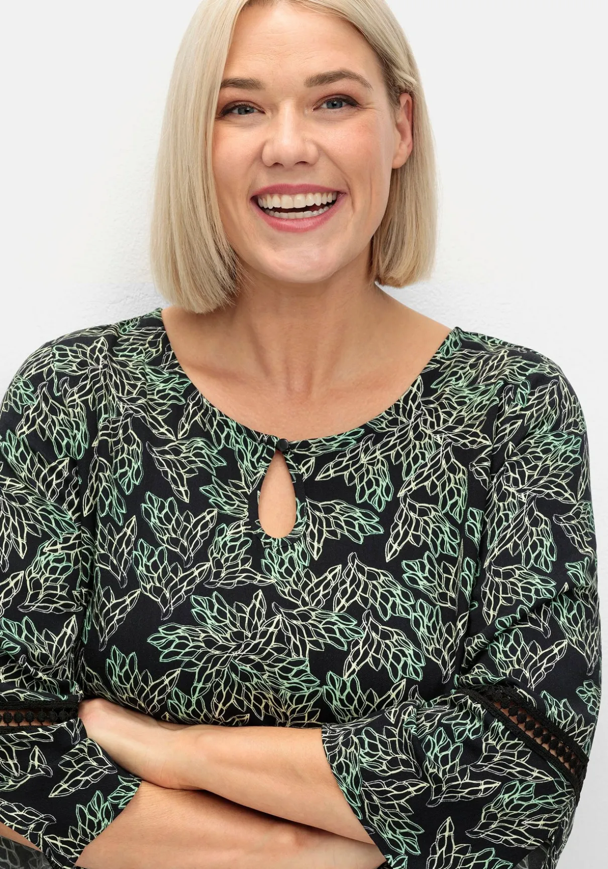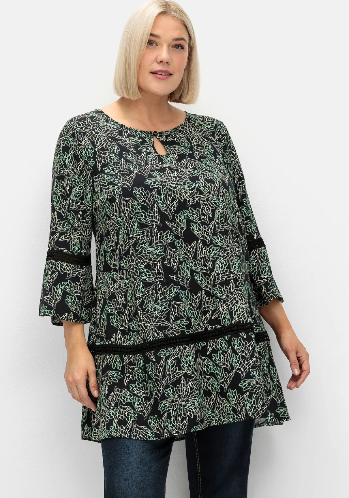Tunika in langer A-Linie. Der wunderschöne florale Print wird durch das Lochmuster an Ärmeln und Hüftpartie feminin ergänzt. Auch der Schlüssellochausschnitt am Rundhals und die weit geschnittenen 3/4-Ärmel fügen sich harmonisch in den romantisch-verspielten Look ein.
