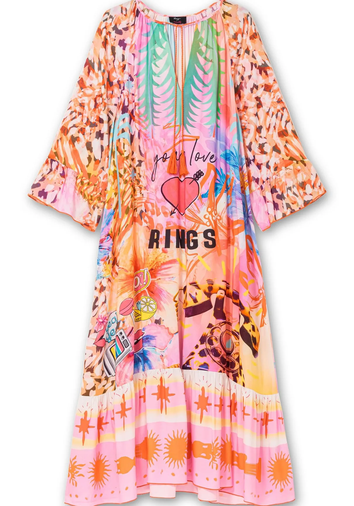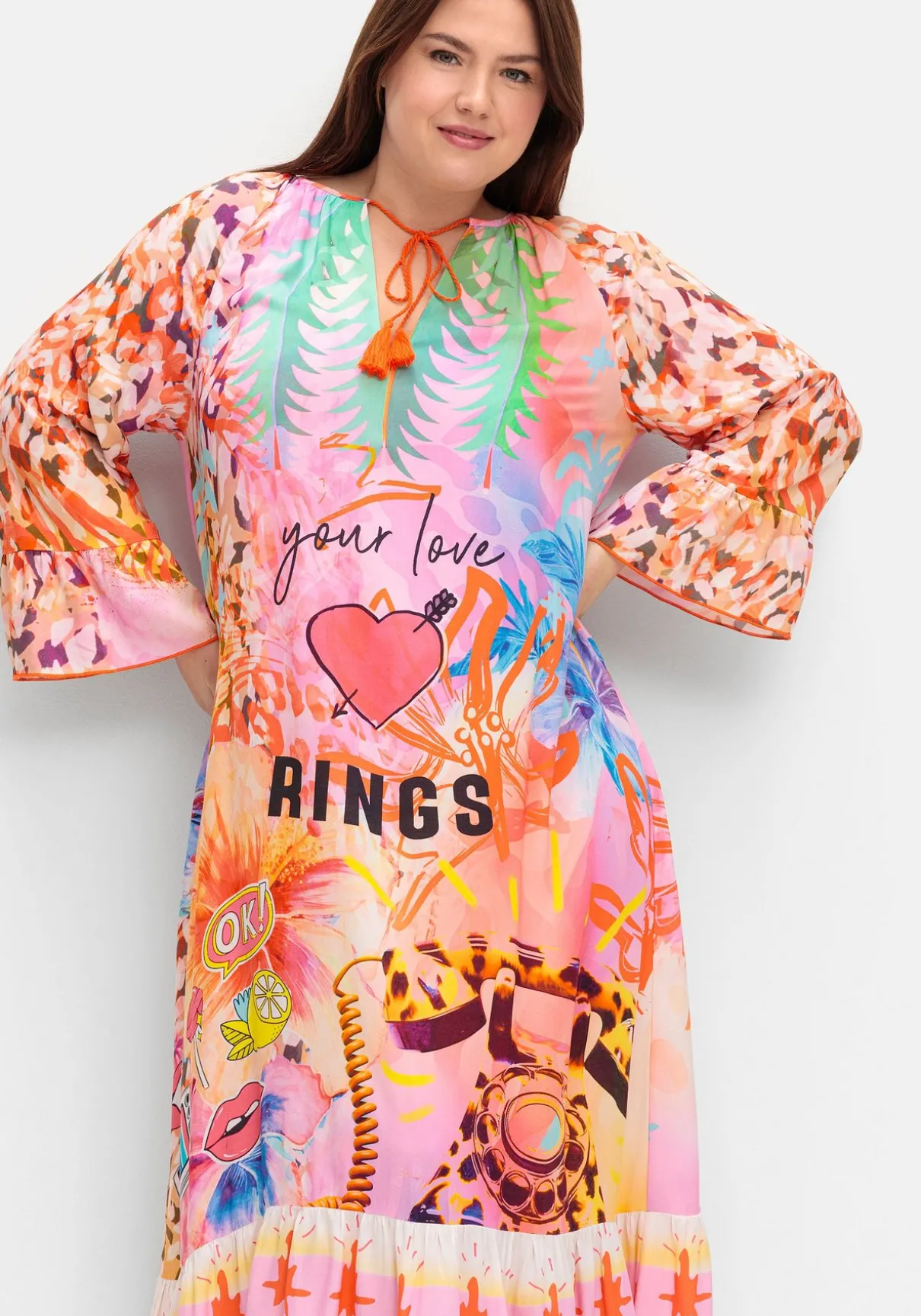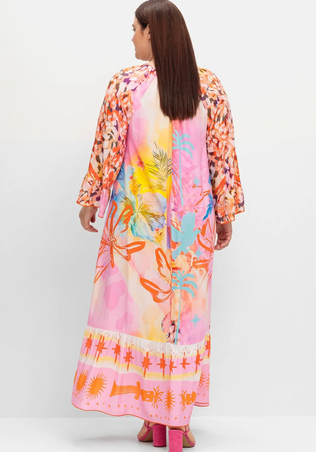 Kleid in Maxilänge von sheego loves miss goodlife. Farbenfroh und feminin zeigt sich der einzigartige Mustermix, verspieltes Finish ist der breite Volant am Saum. Der V-Ausschnitt ist mit einem Bindeband gearbeitet, die 3/4-langen Ärmel fallen luftig und bequem.
