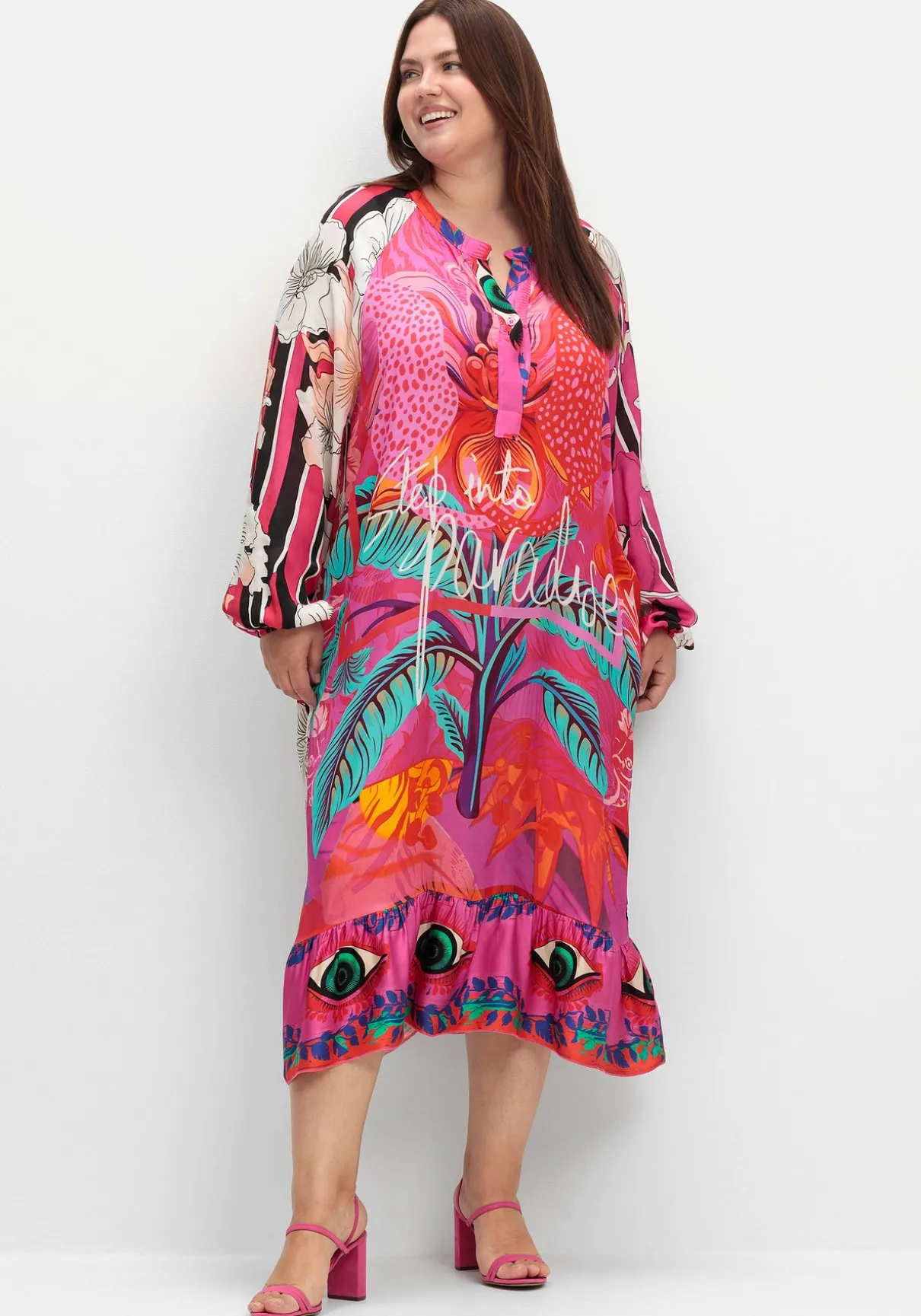 Kleid in Maxilänge von sheego loves miss goodlife. Ein modisches Statement setzt der farbenfrohe Druck im Tropical-Stil, der mit Statementprints dekorativ untermalt wird. Das etwas ruhiger gestaltete Muster auf Rücken und Ärmeln bildet dazu einen spannenden Kontrast. Der Rundhals ist mit schmalen V-Schlitz und einer Zierblende gearbeitet, die lässig geschnittenen Raglanärmel enden mit bequemen Bündchen. Ein breiter Volant mit am Saum fügt dem Kleid eine romantische Note hinzu.