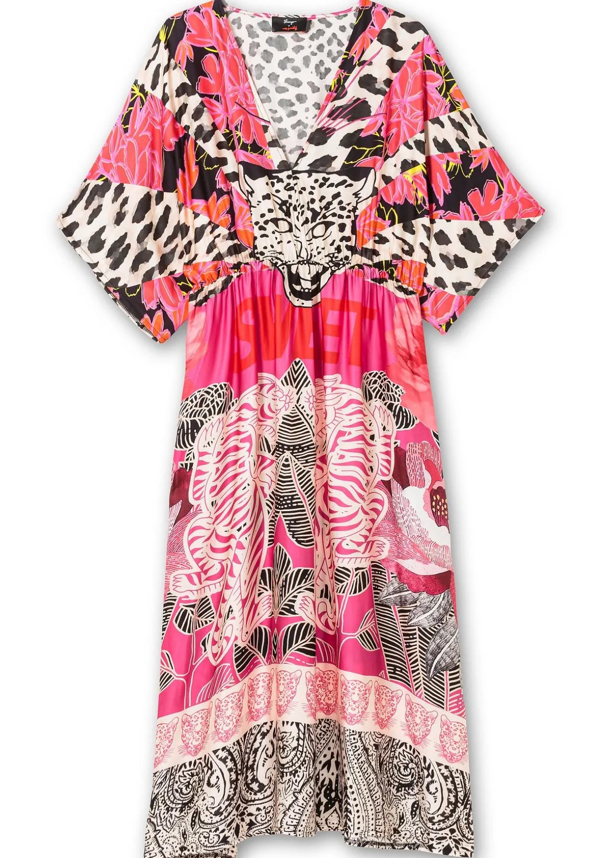 Kleid von sheego loves miss goodlife. Mit einem farbenfrohen Mix aus Animalprints und Wordings sorgt es für modische Aufmerksamkeit. Durch die weiten, überschnittenen Ärmeln und den Schnitt in Maxilänge fällt das Kleid fällt locker über die Silhouette. Ein bequemer Gummizugbund oberhalb der Taille lässt eine dezente Empire-Form entstehen. Der V-Ausschnitt streckt optisch.