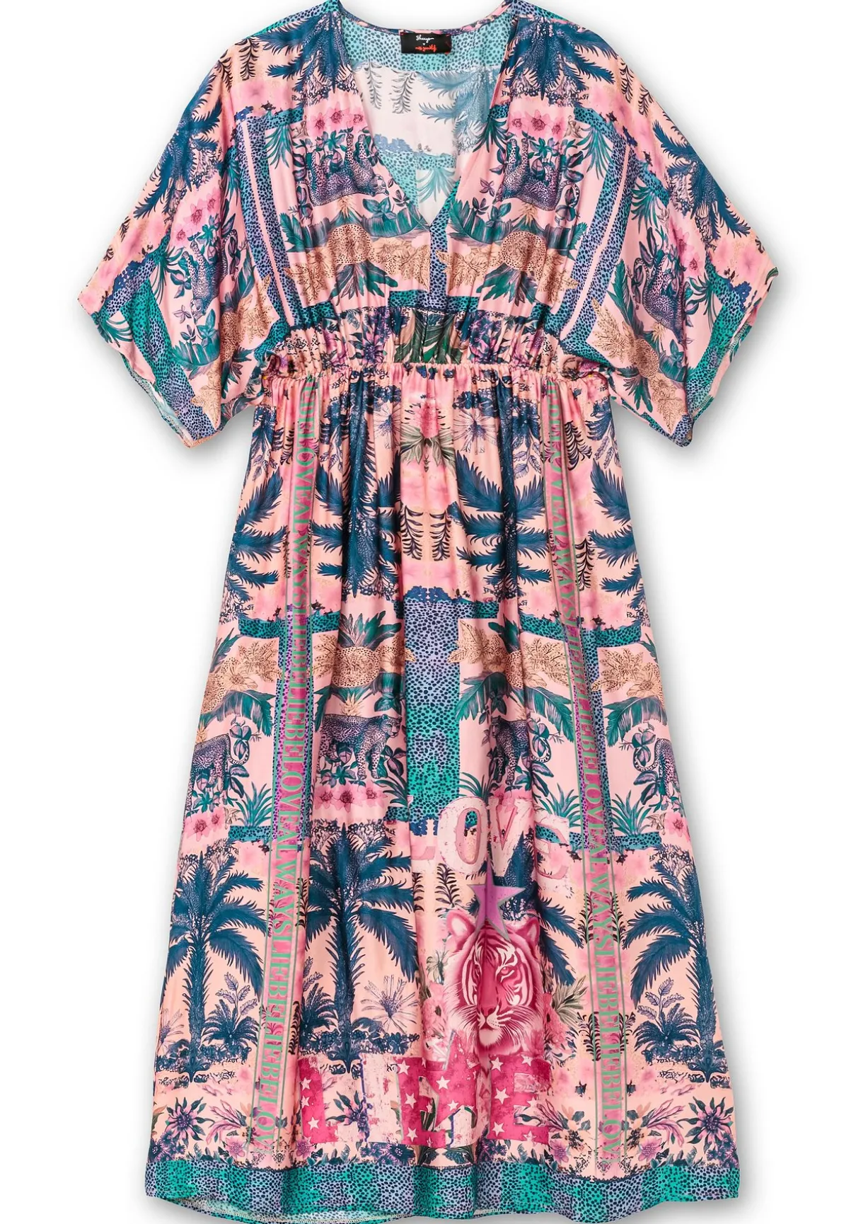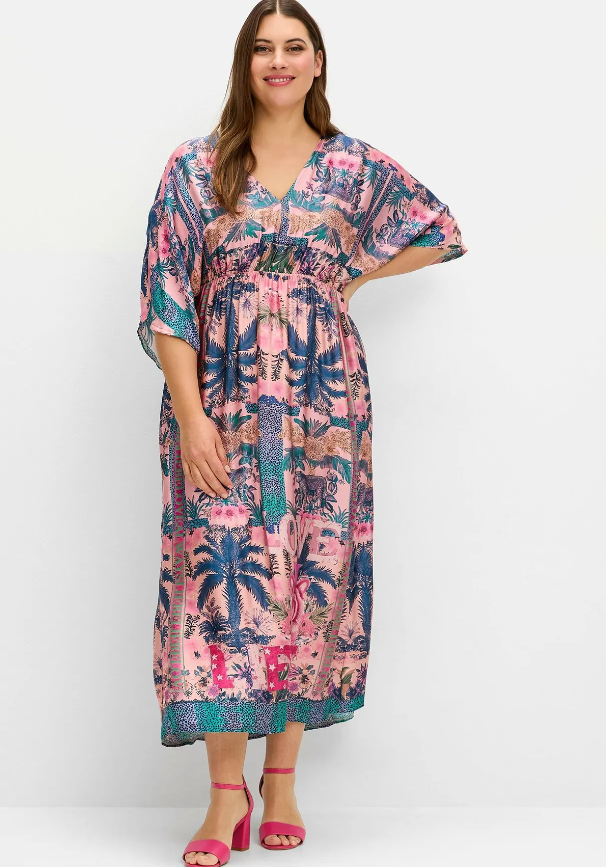 Maxikleid von sheego loves miss goodlife. Ein stilvolles Kleid, das mit einem aufregenden Mustermix aus Palmenprint und Leomuster begeistert. Der tiefe V-Ausschnitt unterstreicht die feminine Note, während die luftig weiten Halbärmel dem Design eine lässige Eleganz verleihen. Ein erhöhter Taillen-Gummizug sorgt für eine schmeichelnde Silhouette und maximalen Komfort. Der leichte Vokuhila-Saum mit Bordürenprint sorgt für eine moderne und zugleich dynamische Silhouette.
