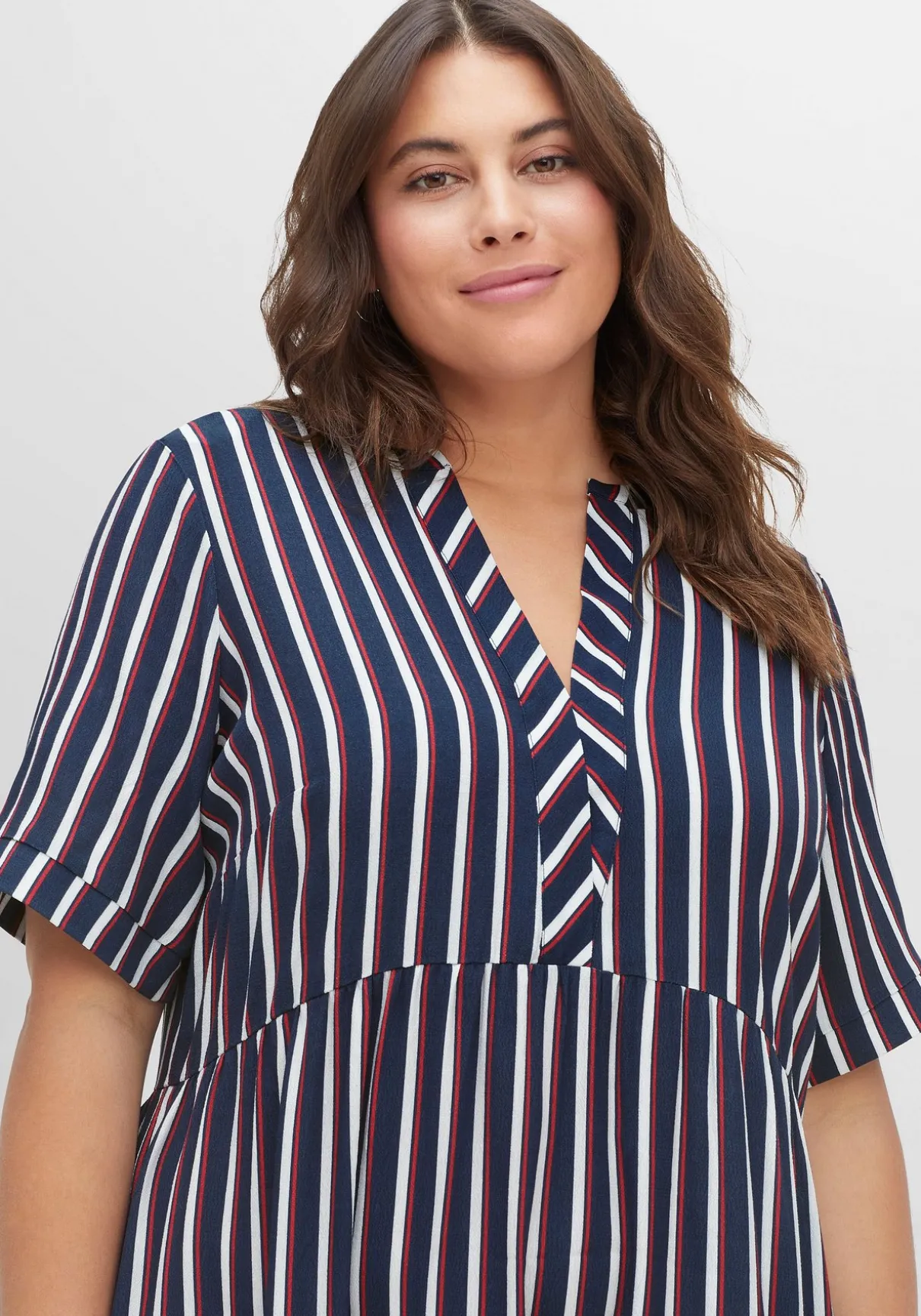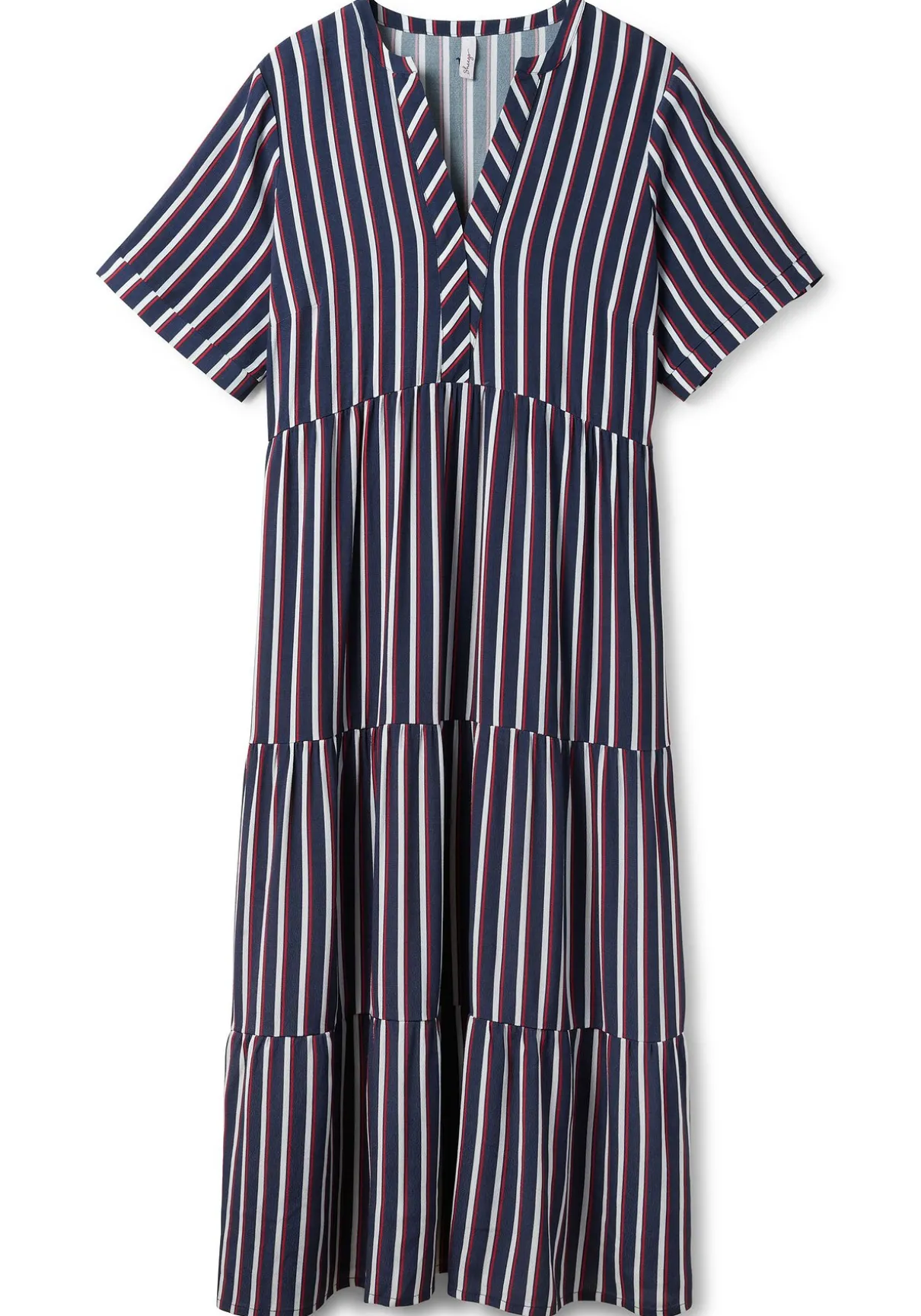 Maxikleid in Knöchellänge. Die Längsstreifen strecken optisch die Silhouette. Das zweifarbige Streifendessin und die entgegengesetzte Linienführung an den kurzen Ärmeln sowie am Ausschnitt brechen den Look modisch auf. Dank des stufigen Volants schwingt der Rock mit jedem Schritt schön mit.