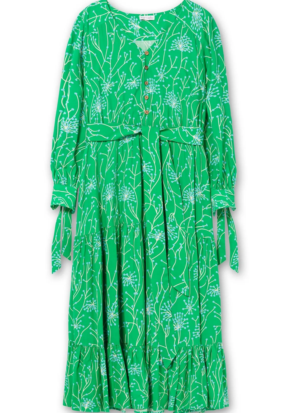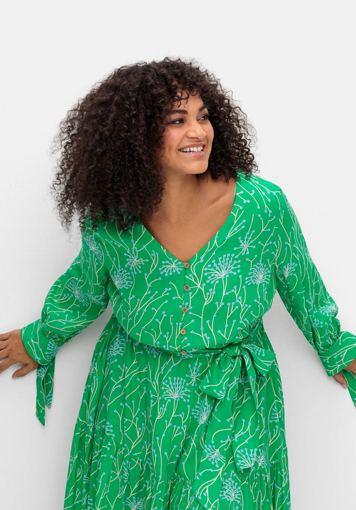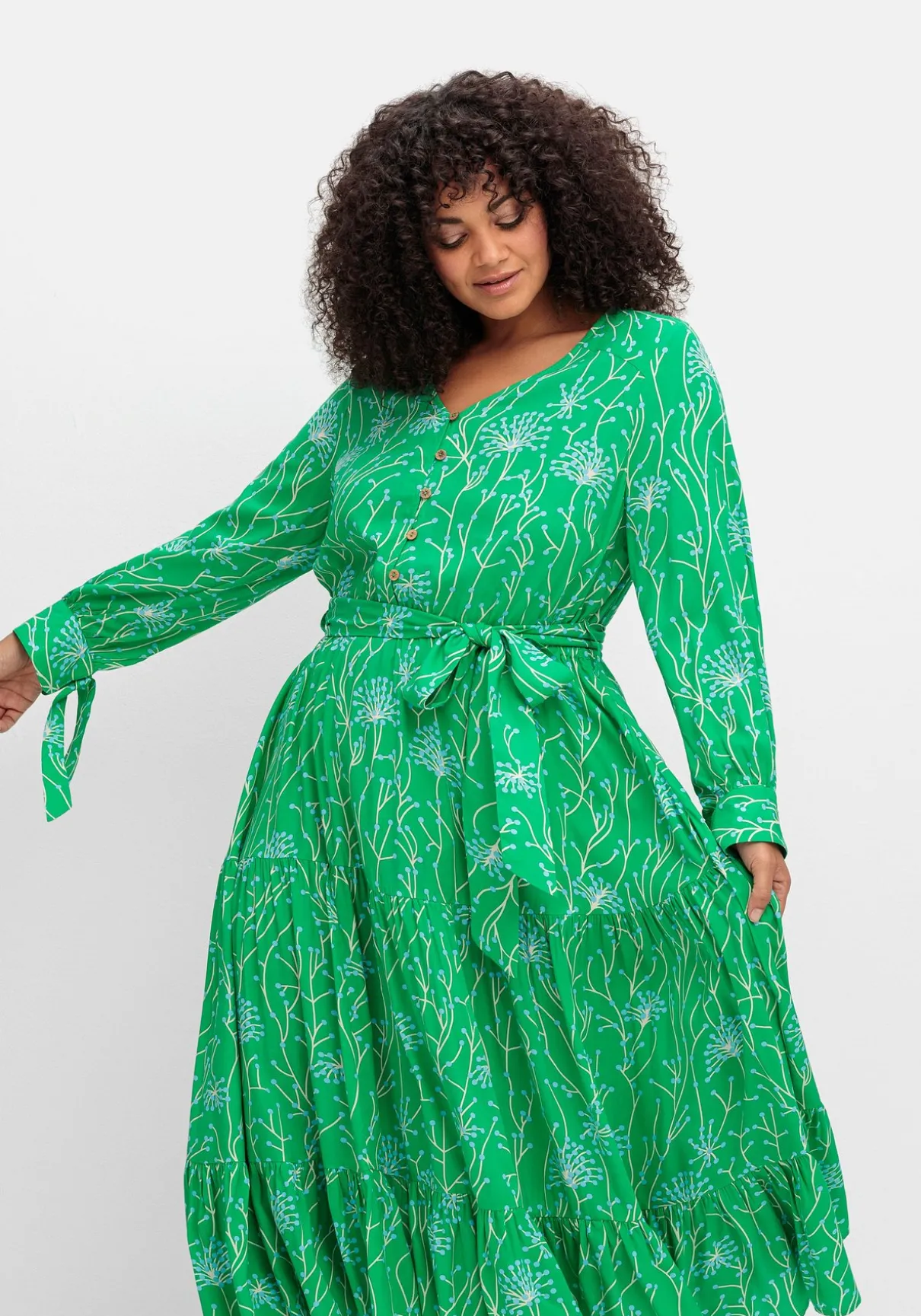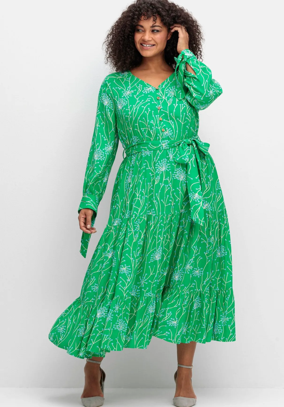 Kleid in Maxilänge mit filigranem, floralem Alloverdruck von sheego by Joe Browns. Der großzügige V-Ausschnitt lässt sich durch die kurze Knopfleiste beliebig weit öffnen. Ein bequemer Gummizug mit Gürtelschlaufen und Bindeband auf Taillenhöhe sorgen zusammen mit dem weit schwingenden Rockteil für eine feminine Silhouette. Der Volant am Saum sowie die Manschetten-Ärmel mit Bindeband dienen dabei als verspielte Ergänzung.