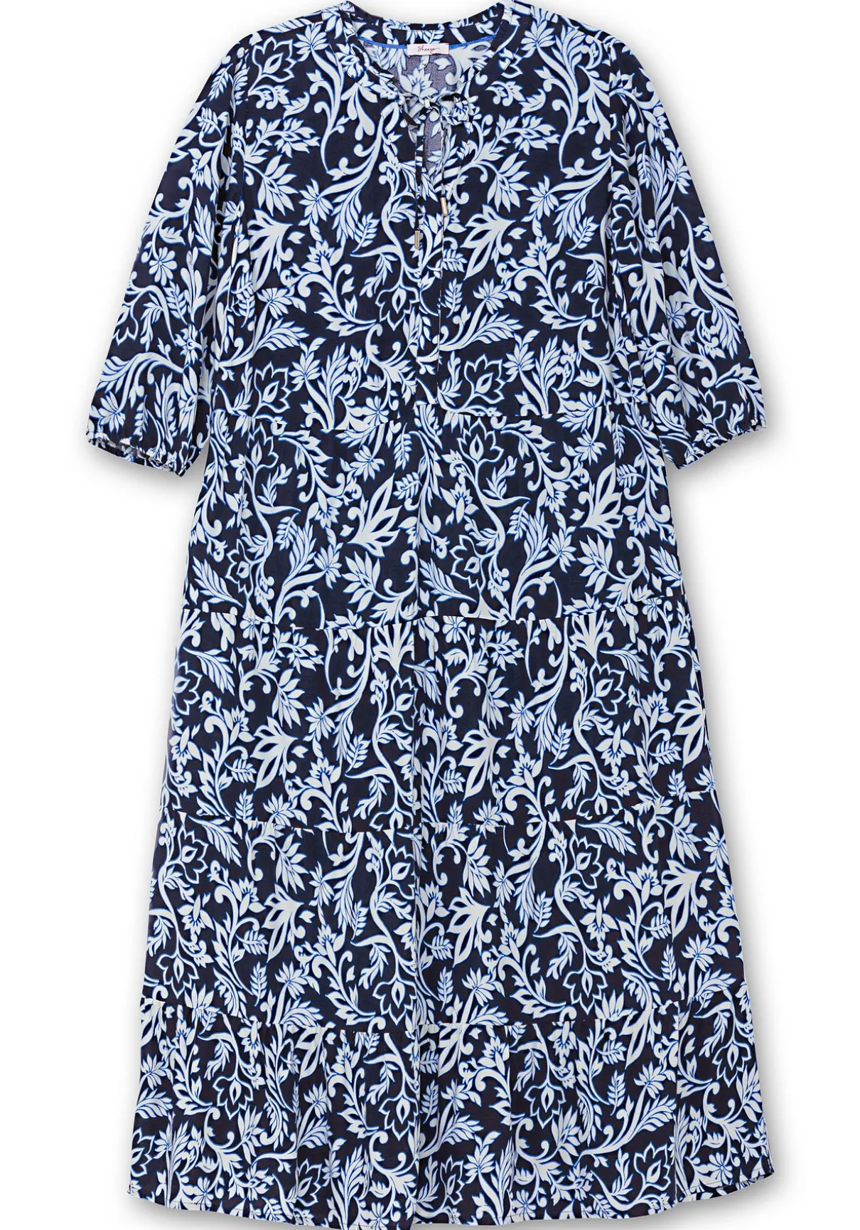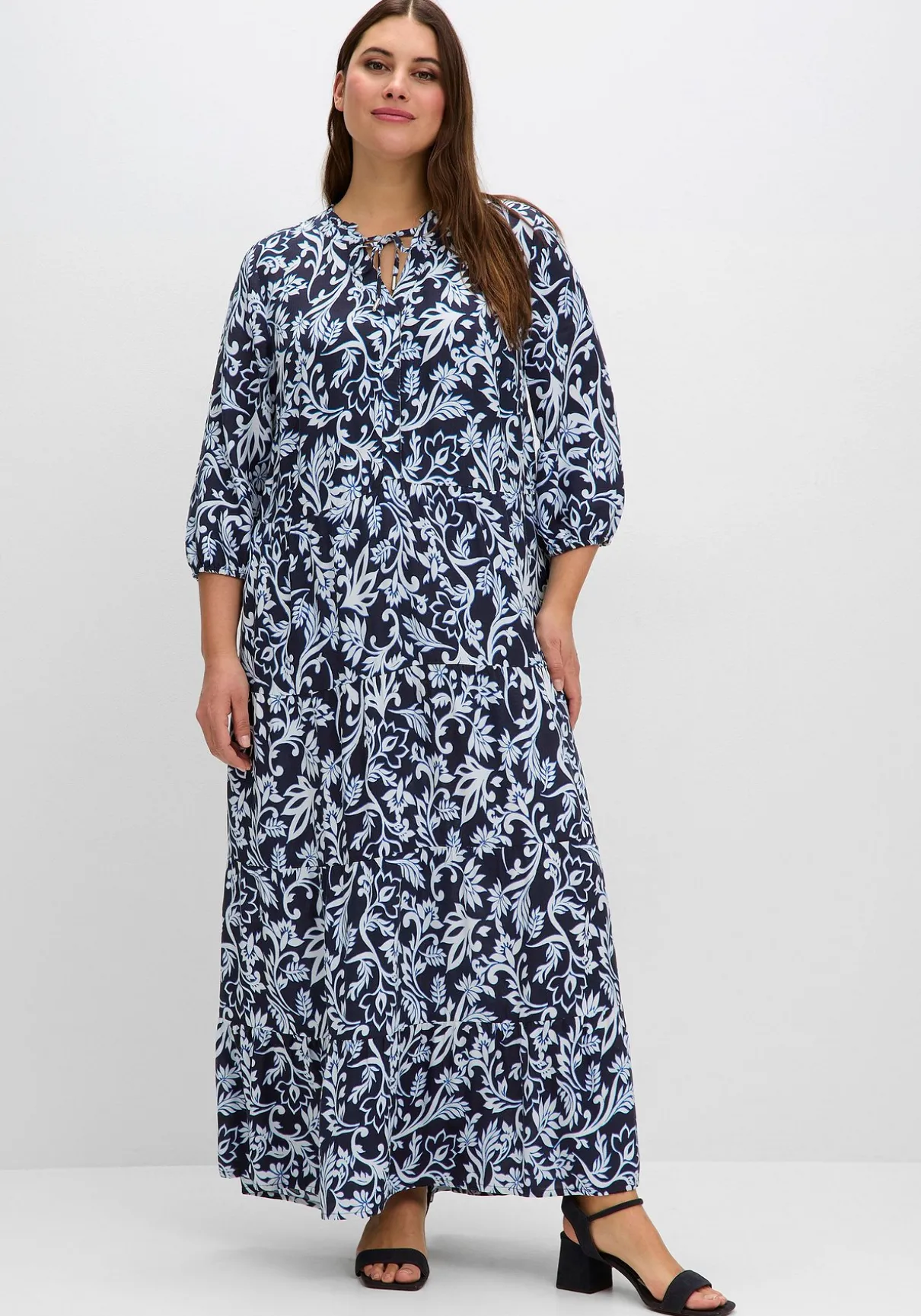 Maxikleid mit Stufenrock. Der kontrastfarbene florale Print macht das Kleid zu einem besonderen Blickfang. Am Rundhalsausschnitt ist das Kleid mit feinen Kräuselungen gearbeitet, der V-Schlitz wird mit einem Bindeband geschlossen. Die 3/4-langen Ärmel enden mit bequemen Gummizugbündchen, der gestufte Maxirock umschwingt luftig die Beine.
