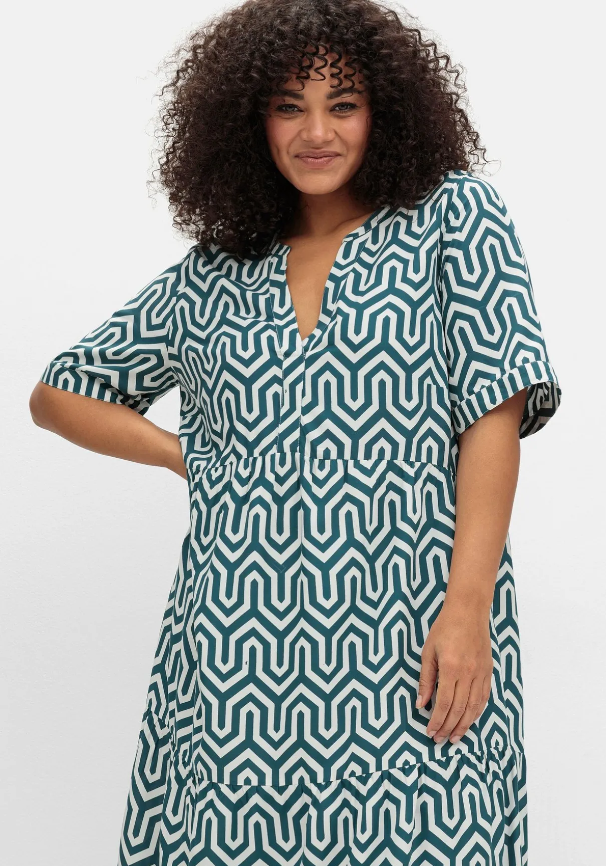 Maxikleid mit grafischem Alloverprint. Das Kleid ist mit geschlitztem Ausschnitt und verlängerten Halbarmen gearbeitet. So streckt es geschickt den Oberkörper und fällt schmeichelnd über die Arme. Der lange Rock ist in A-Linie geschnitten und erhält durch die Stufenvolants femininen Schwung.