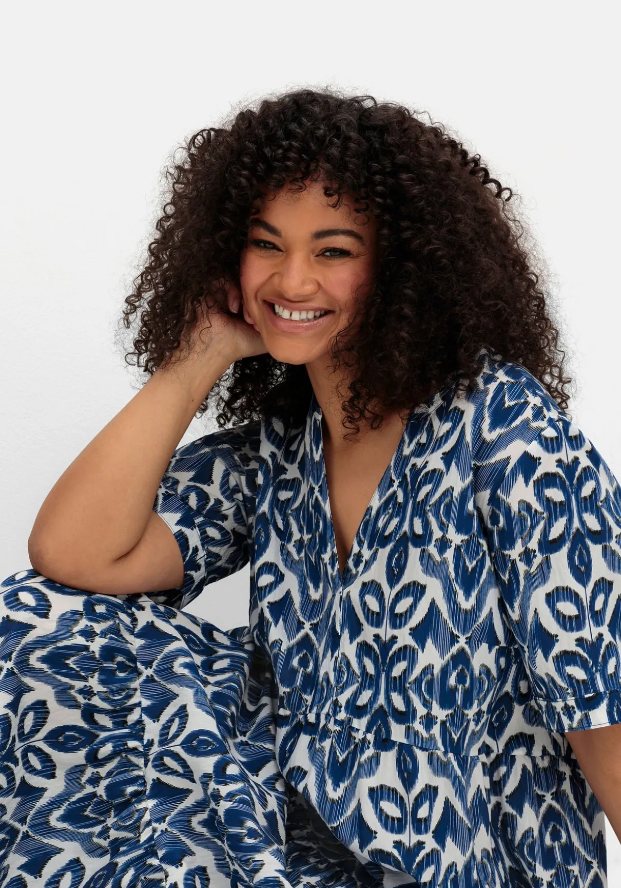 Kleid mit gestuftem Rock. Nicht nur der dekorative Ornament-Druck sorgt für Urlaubsstimmung, auch die weich fließende Qualität und der luftige Schnitt machen das Kleid zum idealen Begleiter durch die sonnigen Tage. Es hat einen streckenden V-Ausschnitt und kurze Ärmel, die eingearbeiteten Stufen lassen den langen Rock schön weit schwingen.