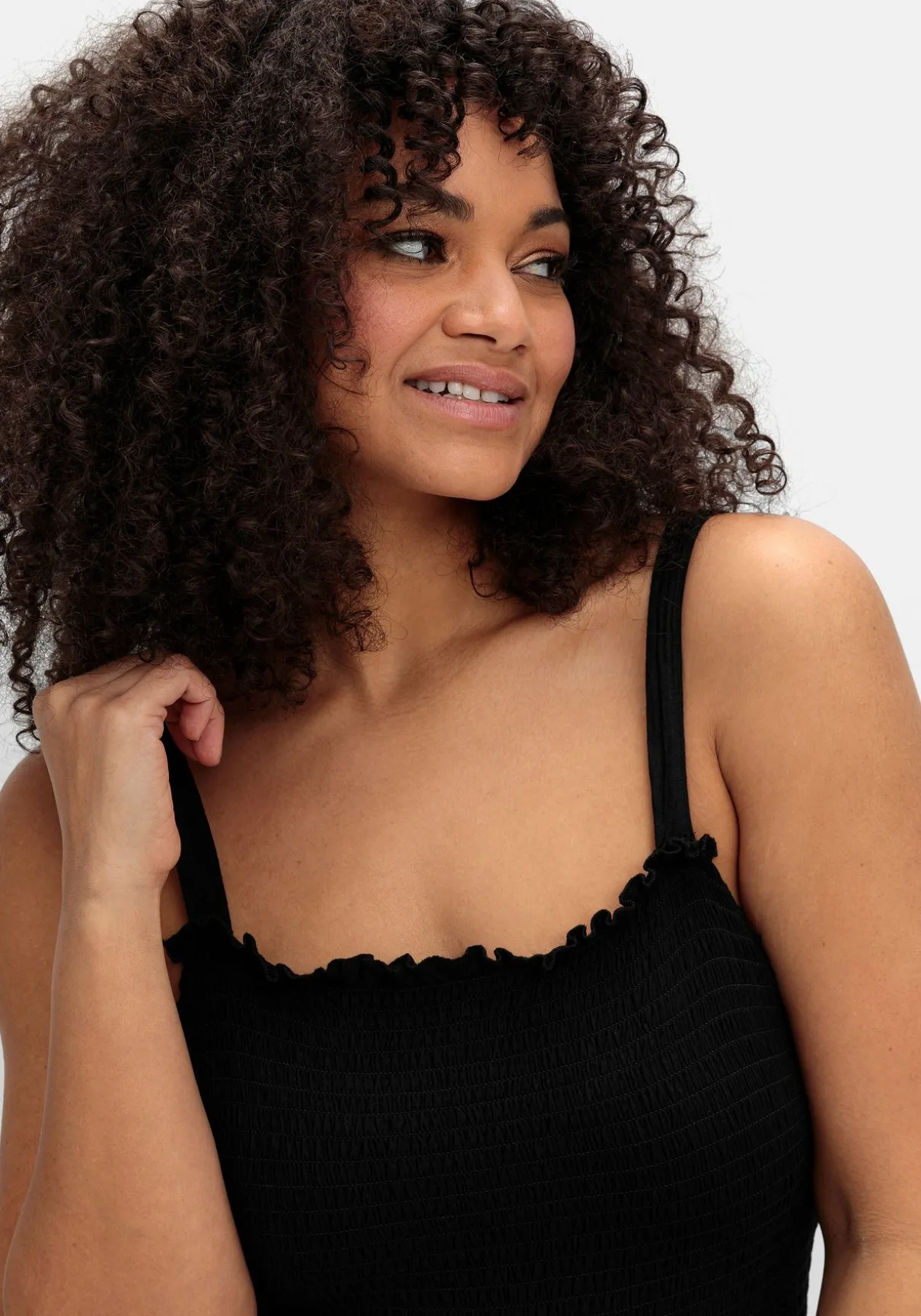 Das gesmokte Oberteil sitzt figurnah und dabei trotzdem sehr bequem. Der stufige Rock umschmeichelt locker die Beine.