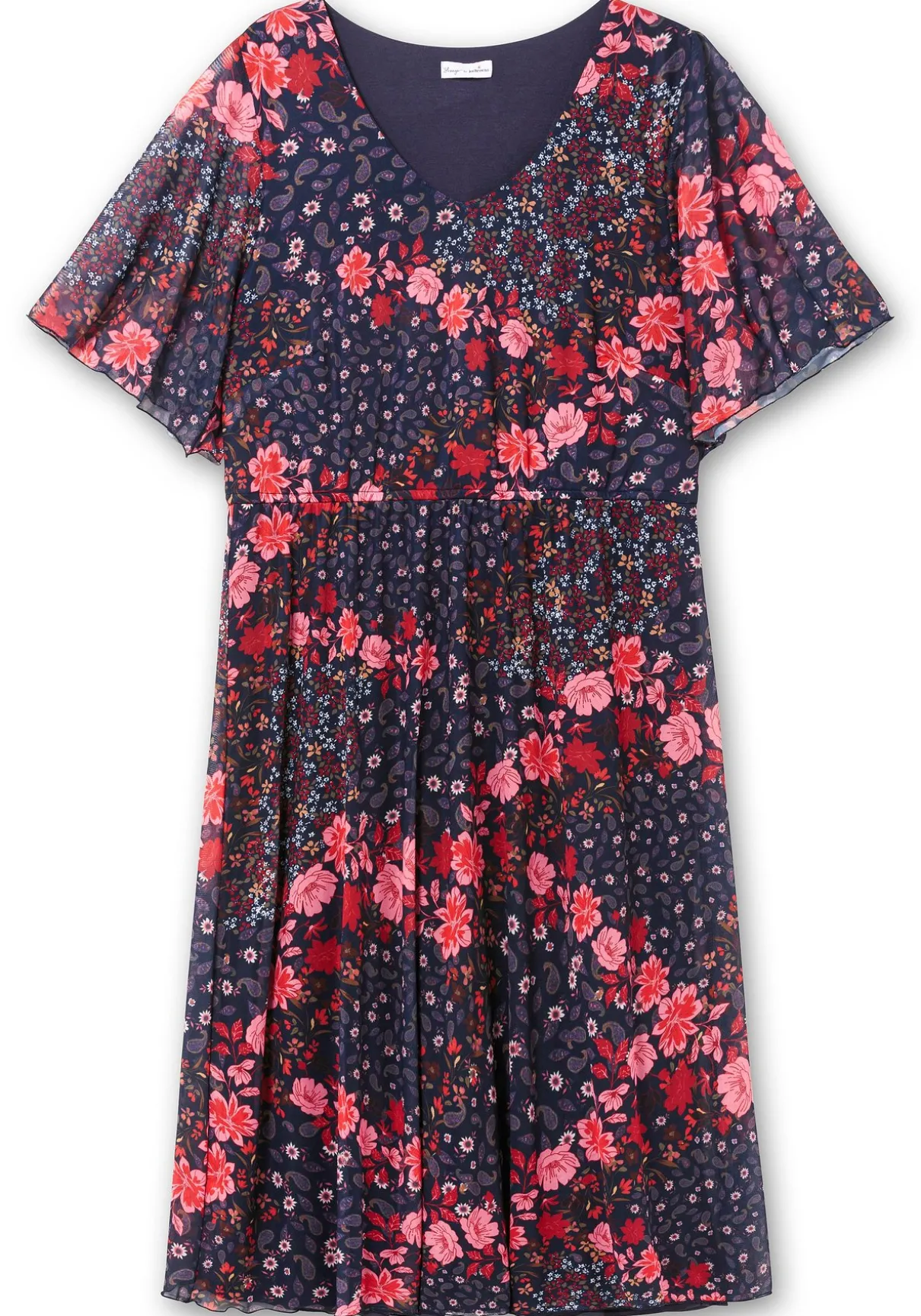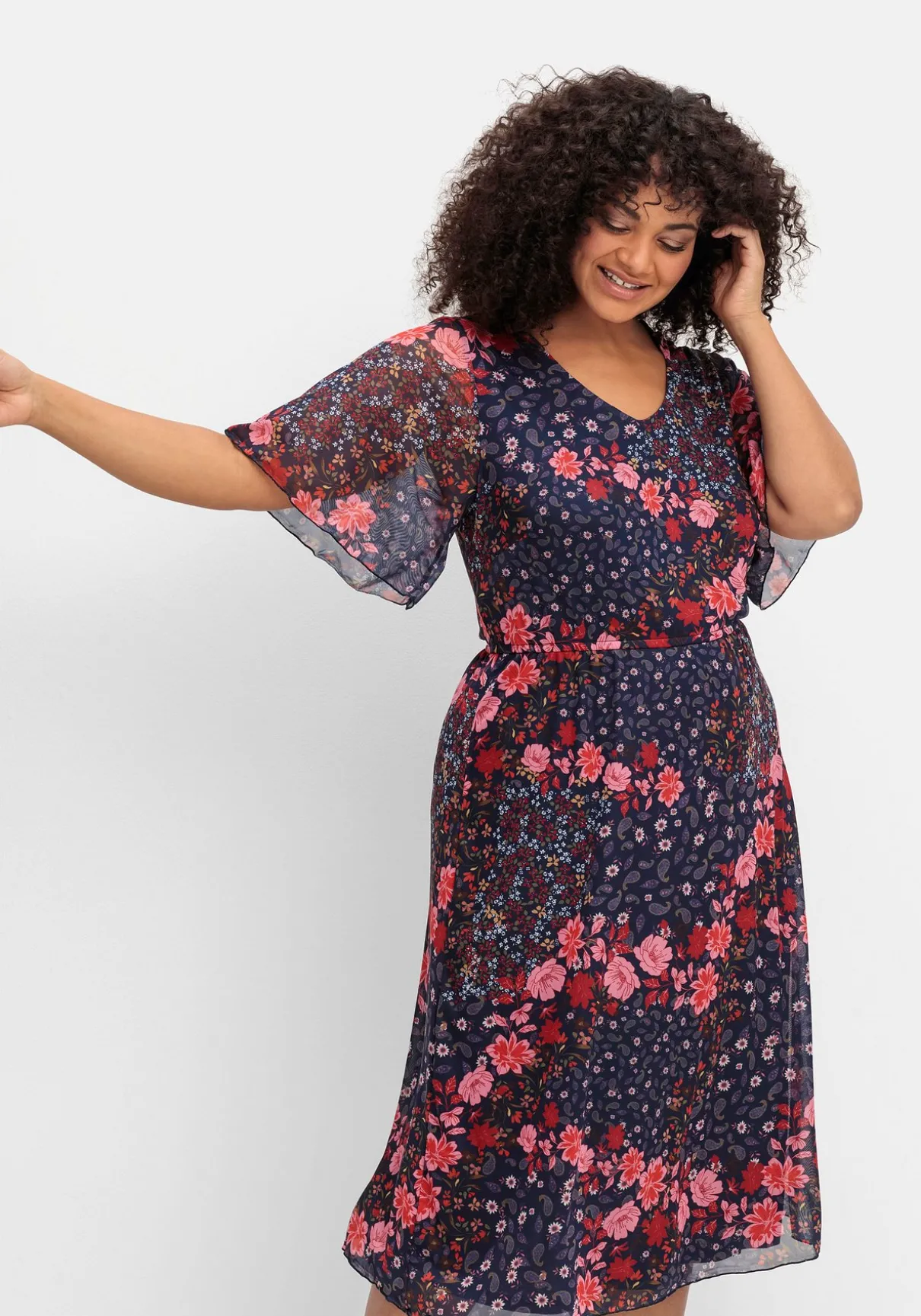 Kleid in kniebedeckender Länge von sheego by Joe Browns. Der hübsche Blütenprint kommt auf der zarten Mesh-Qualität besonders schön zur Geltung. Leicht transparente Flügelärmel und ein dezent gerundeter V-Ausschnitt lassen einen femininen Look entstehen. Der bequem sitzende, leicht gekräuselte Gummizugbund betont die Taille, darunter schließt sich ein knielanges Rockteil an, das durch die ausgestellte Form besonders luftig schwingt.