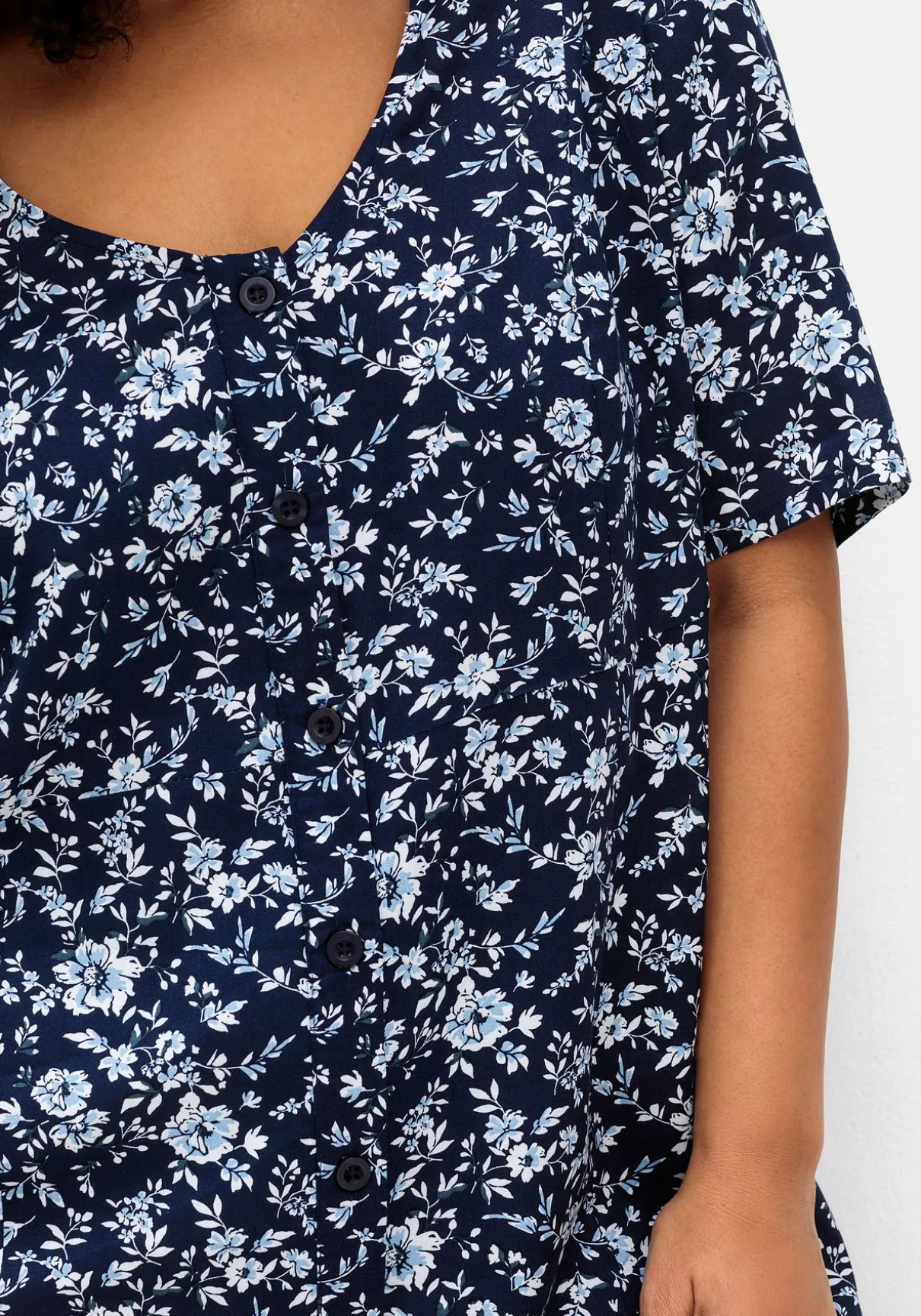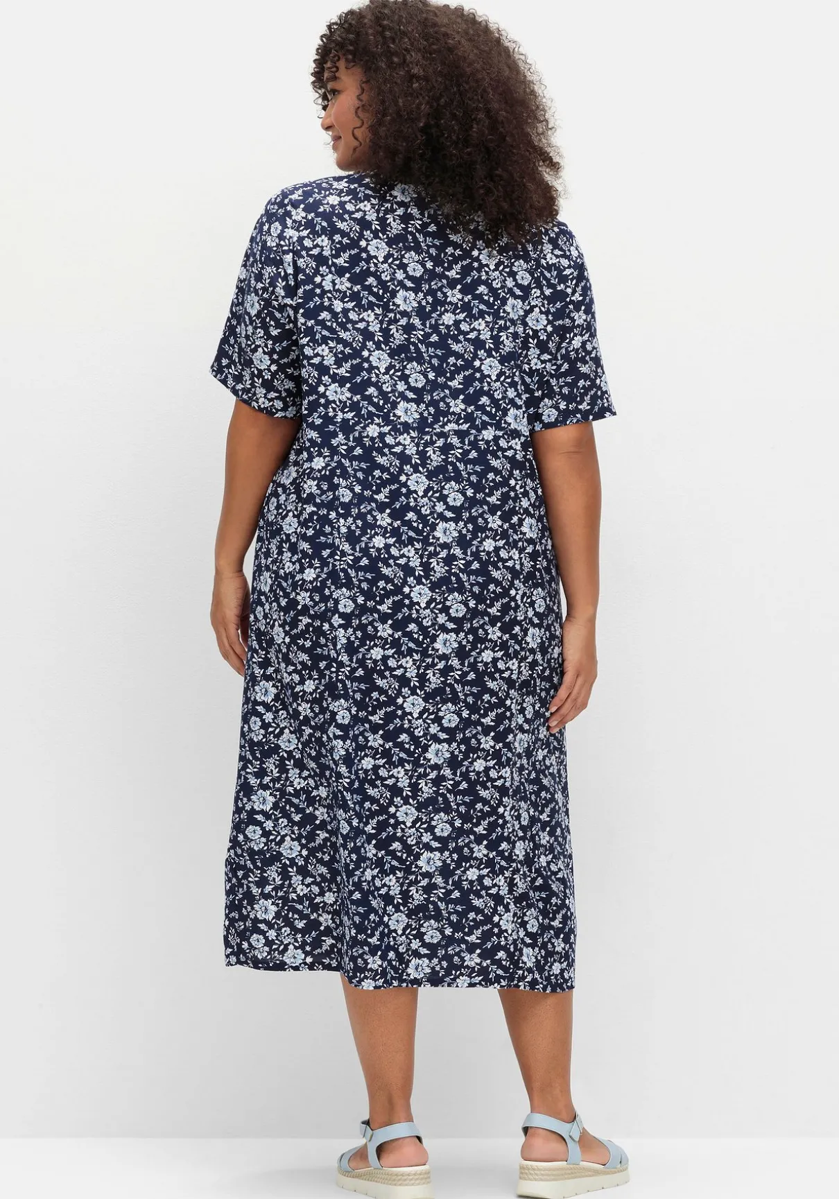 Kleid mit kurzem Arm, in Midilänge. Der verspielte Blümchenprint kommt auf dem weich fließenden Material besonders schön zur Geltung. V-Ausschnitt und eine durchgehende Knopfleiste ergänzen den femininen Look. Geschickt gesetzte Teilungsnähte formen schmeichelnd die Figur, hinten betont eine auf Taillenhöhe horizontal verlaufende Teilungsnaht die Körpermitte.