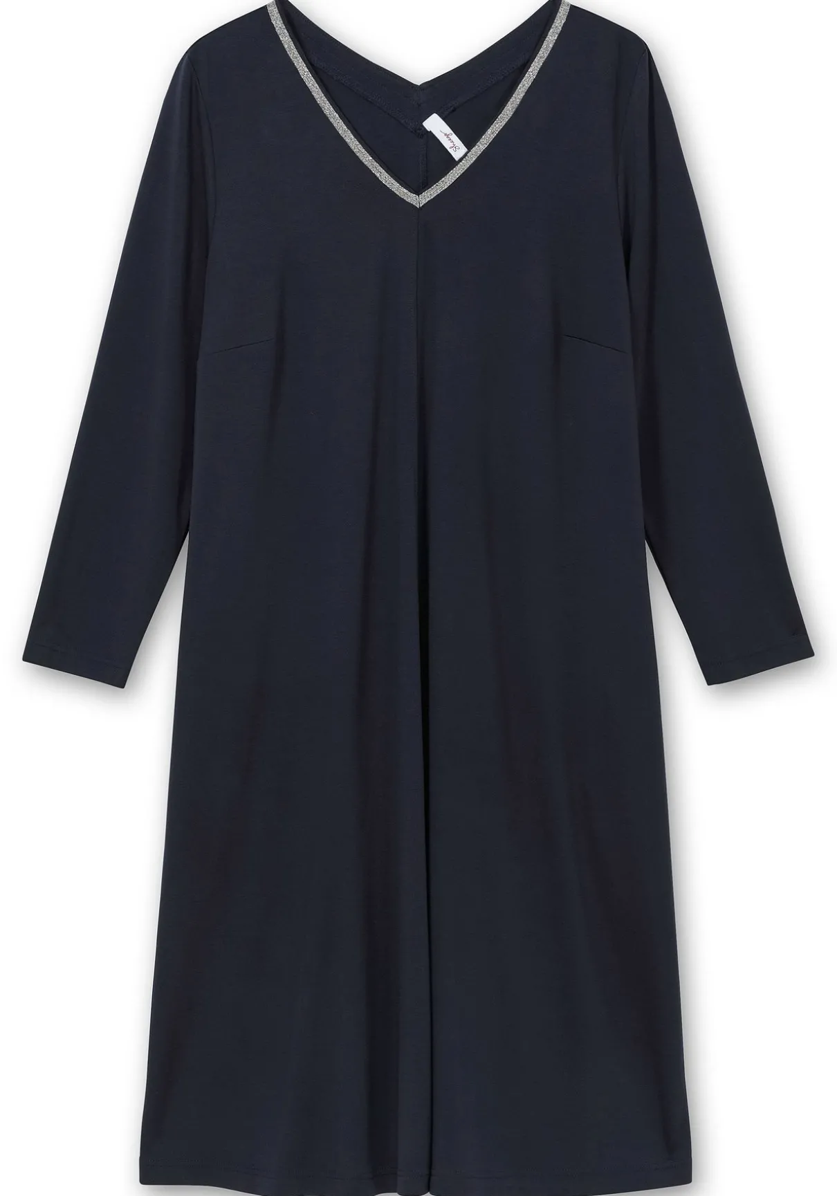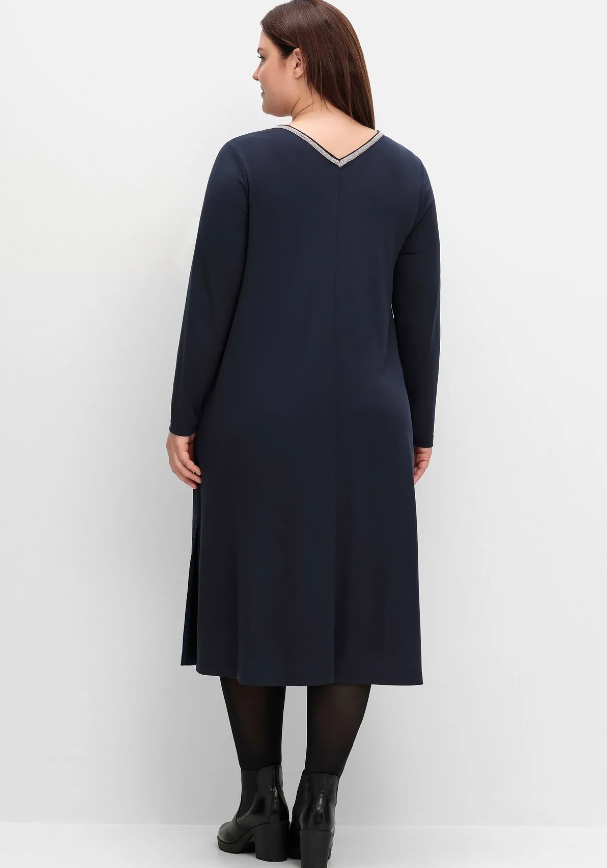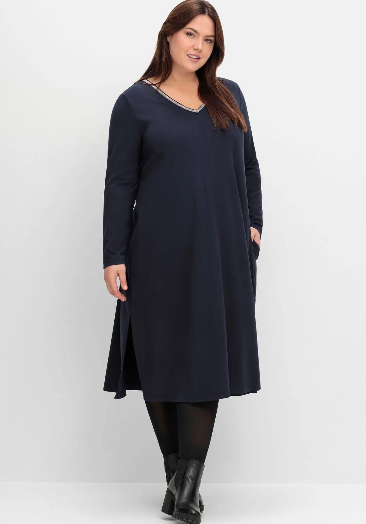 Kleid in A-Linie. Die trageangenehme Qualität und der komfortable Schnitt mit Taschen in der Seitennaht machen das Kleid zum unkomplizierten Begleiter zu vielen Gelegenheiten. Vorn und hinten ist es mit einem femininen V-Ausschnitt gearbeitet, die silberfarben schimmernde Perlendekoration sorgt für den dezenten Glamour-Effekt.