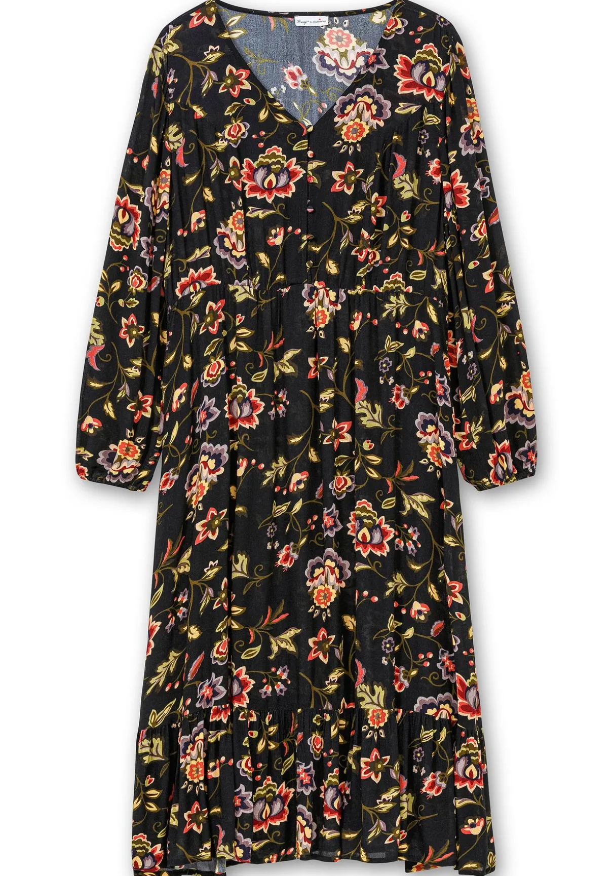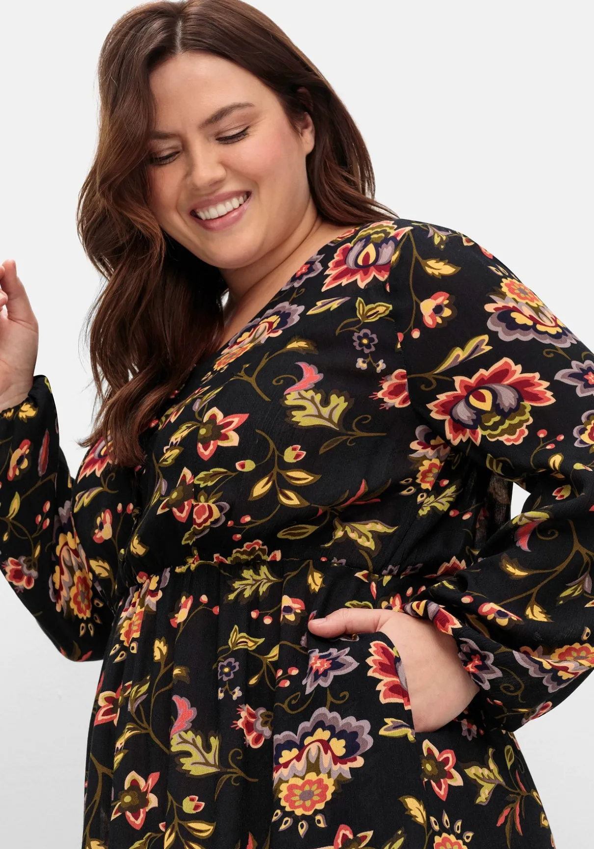 Midikleid mit Blumendruck von sheego by Joe Browns. Das Kleid ist mit streckendem V-Ausschnitt und kurzer Knopfleiste gearbeitet, stoffbezogene Knöpfe sind hier ein liebevolles Detail. Die langen Ärmel enden mit bequemen elastischen Bündchen, auch der leicht gekräuselte Taillenbund ist angenehm dehnbar. Schräg eingesetzte Eingrifftaschen und ein breiter Volant am Saum schließen den verspielten Look ab.